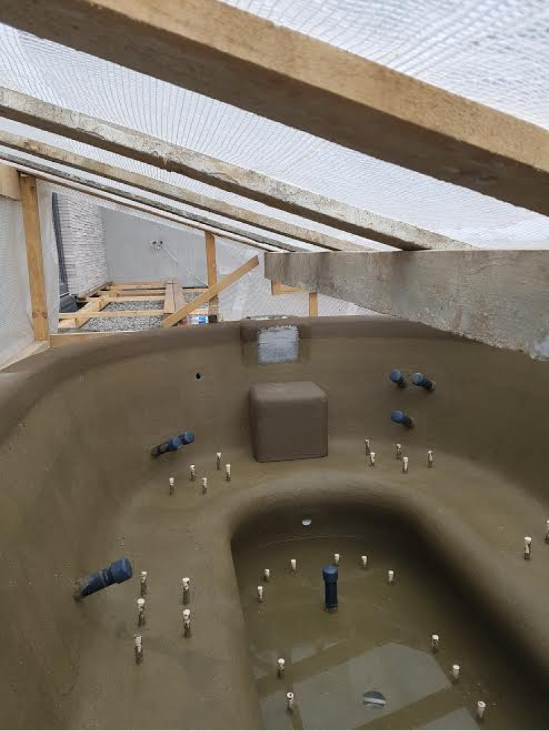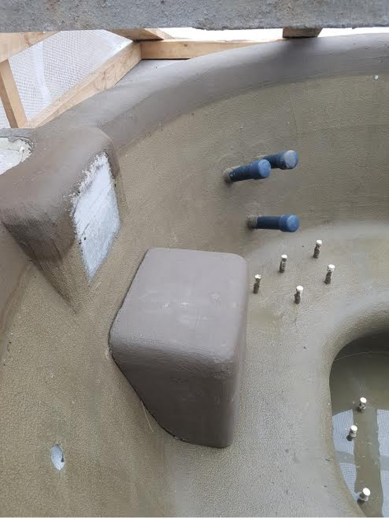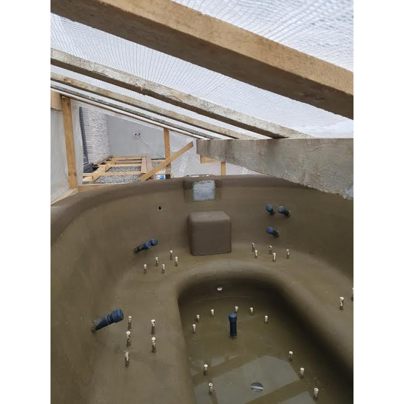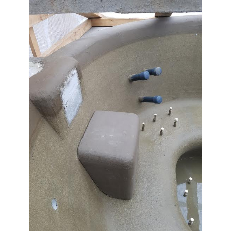 Формы для бассейнов изготавливаются из специального экструдированного полистирола по индивидуальному заказу. Интерьер выложен мозаичной плиткой из дробленого стекла.