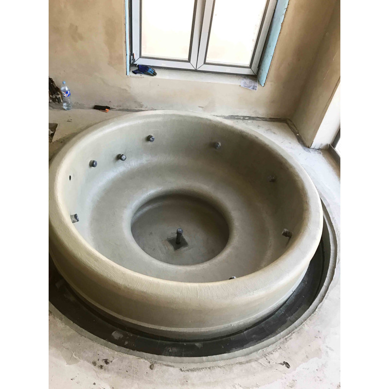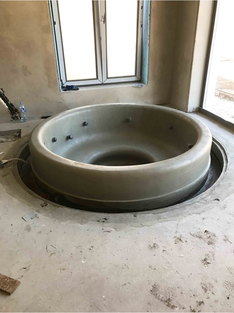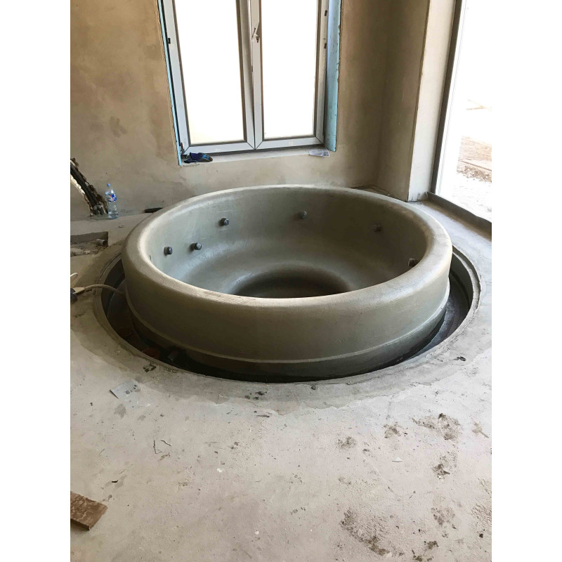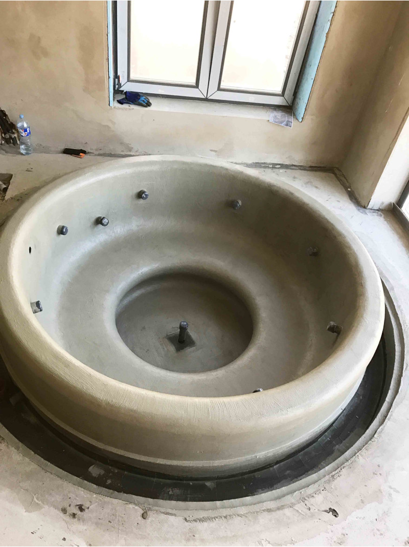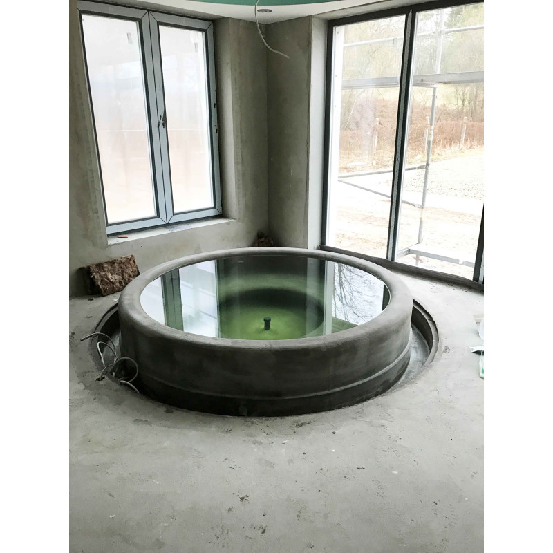 Бассейн круглой формы с сиденьями вокруг всего бассейна. Внутренние поверхности бассейна были сформированы из полистирола сплошной резки XPS 300. Это чрезвычайно прочный, устойчивый к влаге и давлению материал.
