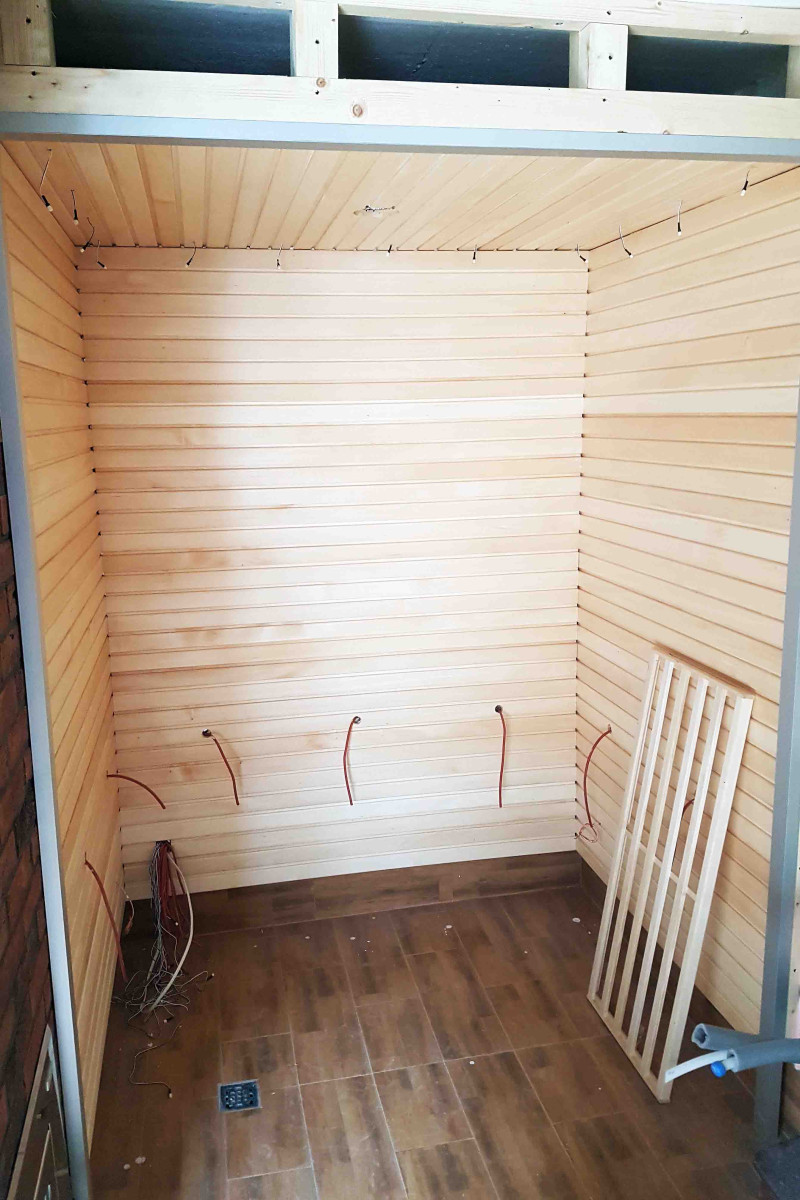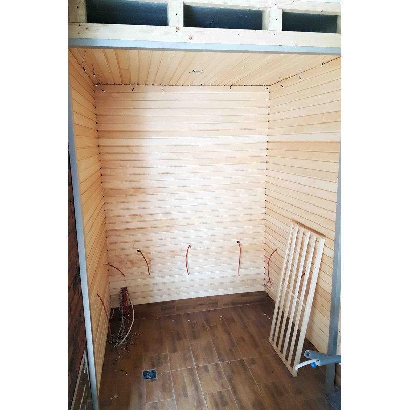 Внутреннее убранство сауны - скамейки из липового дерева, стены, потолок и решетки на полу. Скамейки пропитаны специальным парафиновым маслом. Масло защищает деревянную поверхность от воздействия влаги, облегчая очистку и уход за деревом. Стены покрыты лаком для водяной бани, защищающим от воздействия грязи, воды и щелочей.