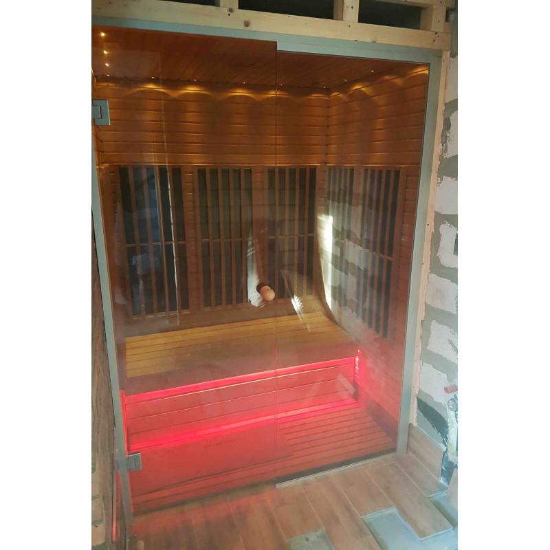 Оснащение сауны: Инфракрасный обогреватель HARVIA CARBON с защитной решеткой, панель управления Harvia Griffin Infra CG170I. Эта панель может использоваться для управления временем работы, температурой, освещением и вентиляцией. Таймер можно использовать, чтобы установить, когда сауна должна быть готова. Хромированная цифровая панель управления полностью совместима с другим современным оборудованием сауны.