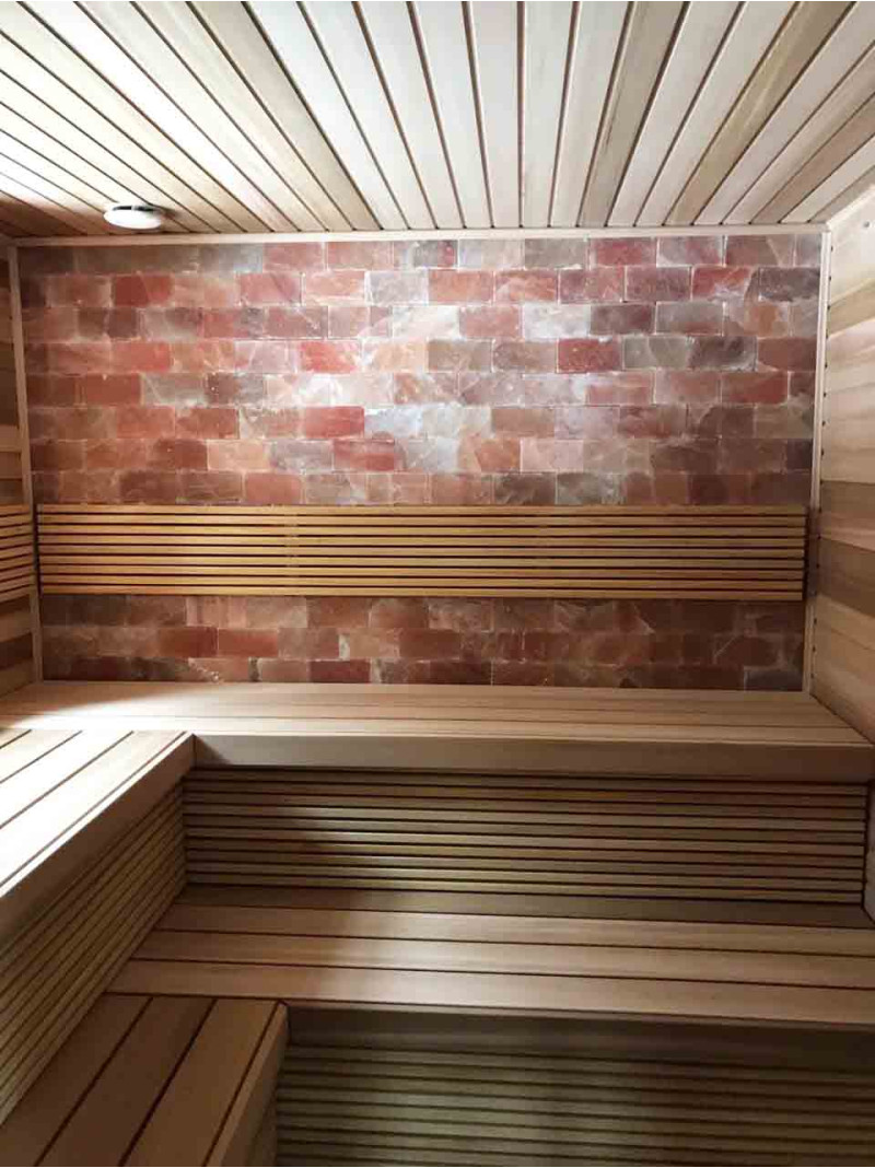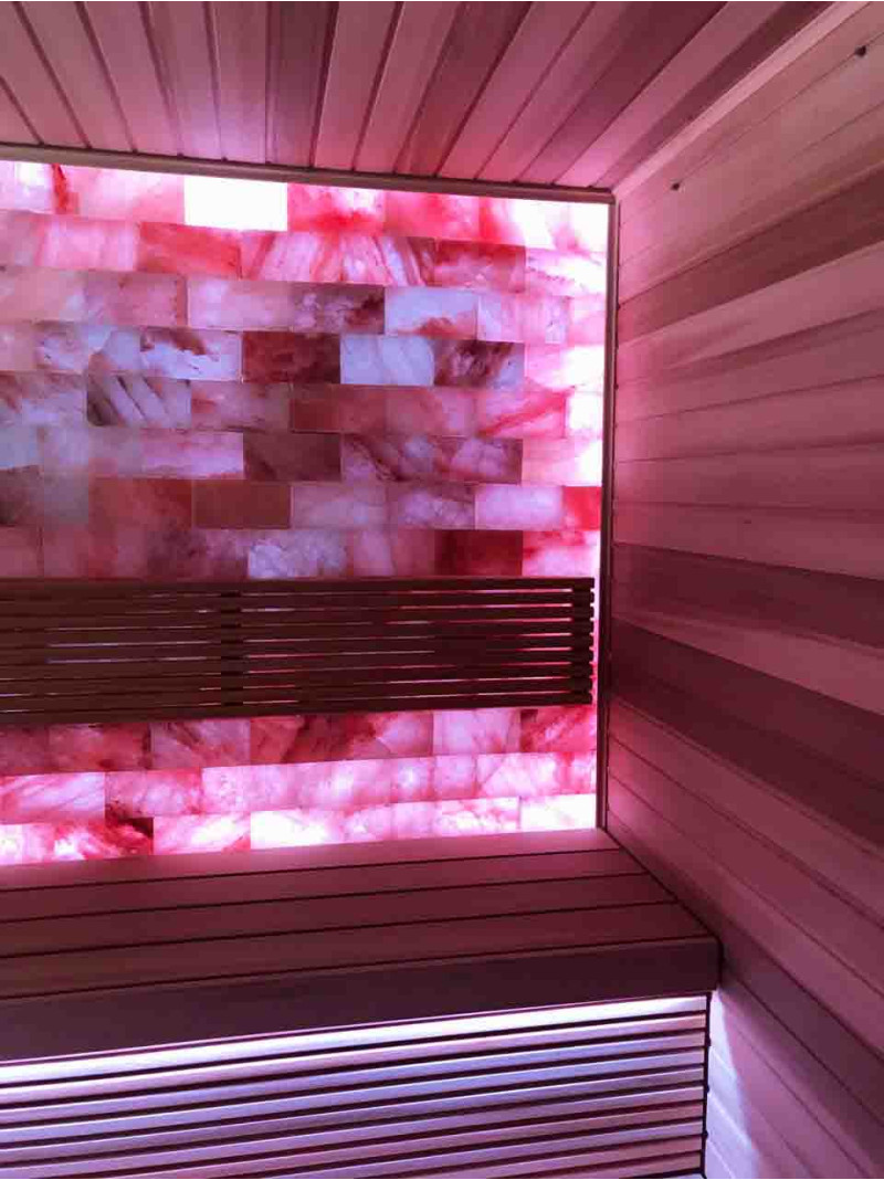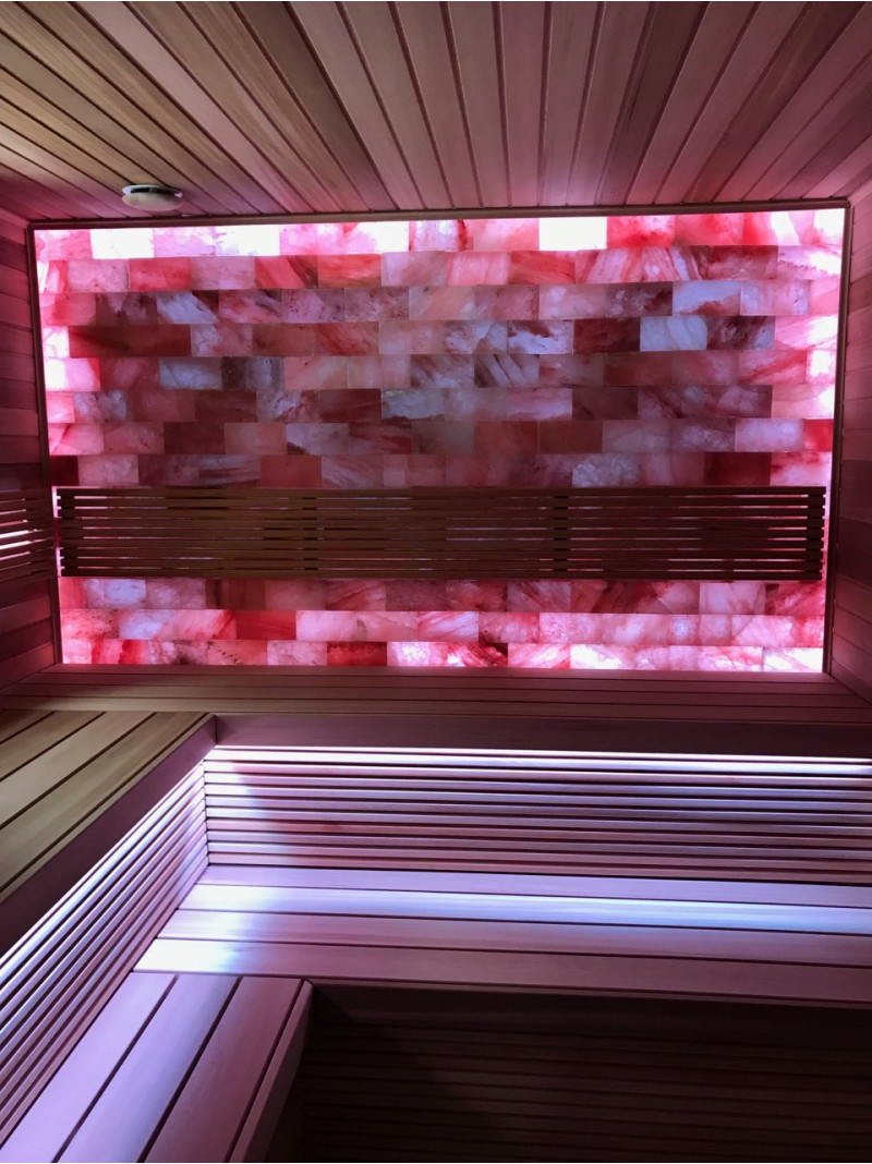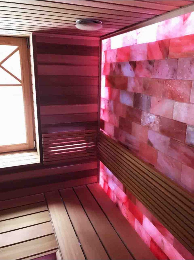 Качество воздуха и ощущение сауны значительно усиливаются за счет большой стены гималайских солей. Выделяемые отрицательные ионы укрепляют здоровье, помогают преодолеть многие недуги, такие как: бронхиальная астма, заболевания легких и бронхов, постинфаркт, гипертония, язвы желудочно-кишечного тракта, гастрит, заболевания щитовидной железы, дерматиты, различные аллергии, нервные заболевания, помогает преодолеть стресс. Польза от проведения процедур в такой сауне двоякая.