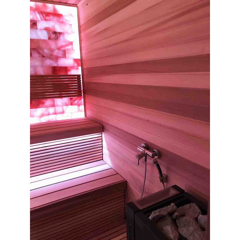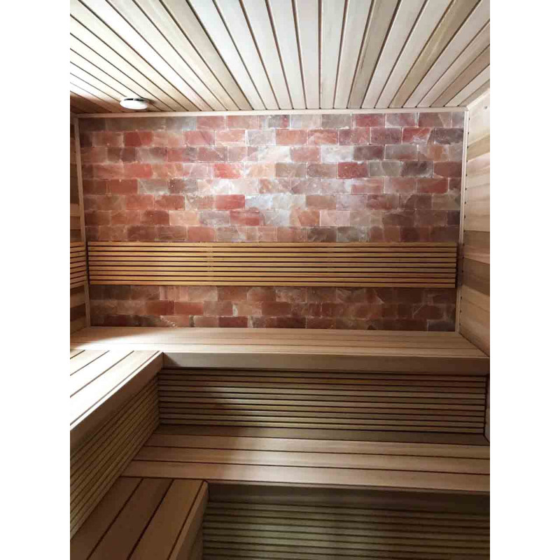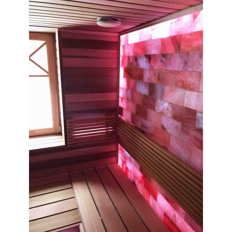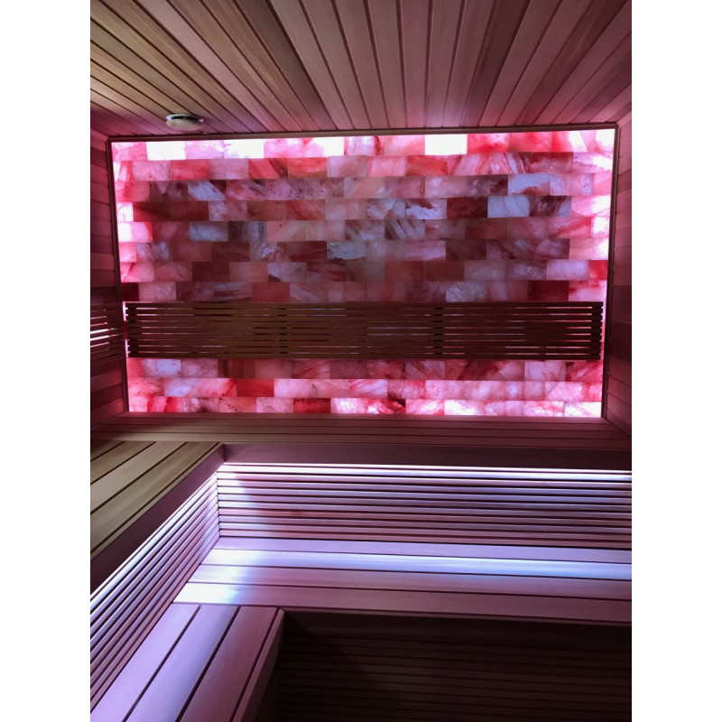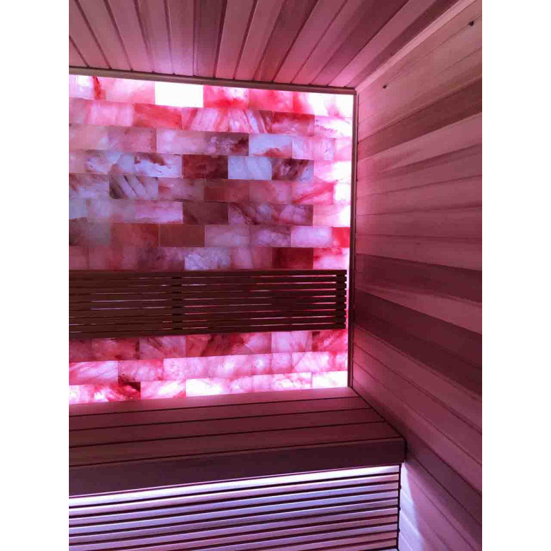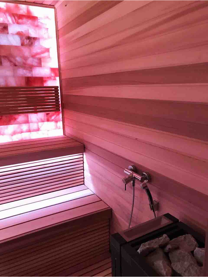 Качество воздуха и ощущение сауны значительно усиливаются за счет большой стены гималайских солей. Выделяемые отрицательные ионы укрепляют здоровье, помогают преодолеть многие недуги, такие как: бронхиальная астма, заболевания легких и бронхов, постинфаркт, гипертония, язвы желудочно-кишечного тракта, гастрит, заболевания щитовидной железы, дерматиты, различные аллергии, нервные заболевания, помогает преодолеть стресс. Польза от проведения процедур в такой сауне двоякая.