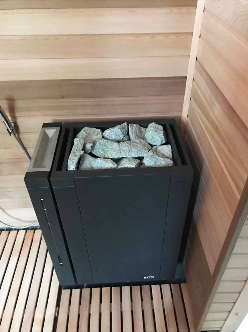 - Электрический духовой шкаф эксклюзивного дизайна EOS Mythos S45 Vapor с парогенератором. В духовке помещается до 45 кг камней жадеита. Этого количества достаточно, чтобы поддерживать постоянную температуру и комфортно пользоваться сауной. Удобство ухода - камни не касаются нагревательных элементов. Их можно заменить, не снимая камней.