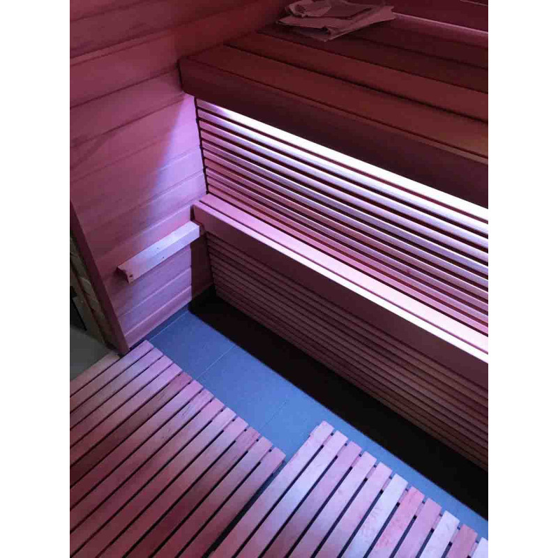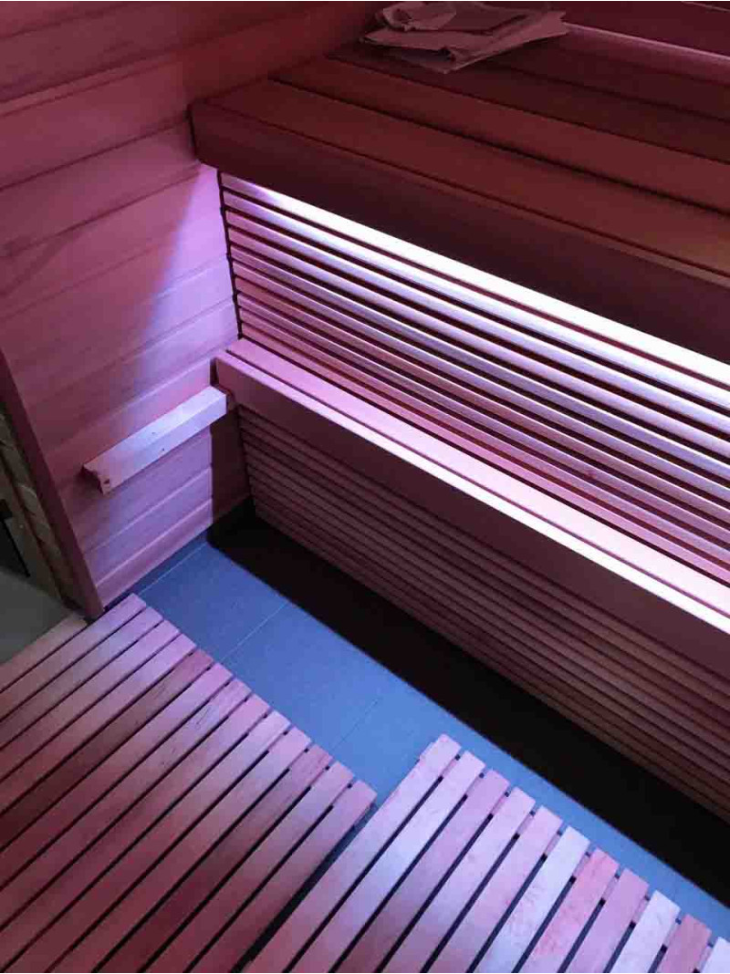 - Светодиодный RGB-светильник под верхней палубой, в спинках и за соляной стеной - управление цветами осуществляется с помощью отдельного пульта ДУ.