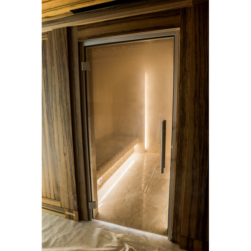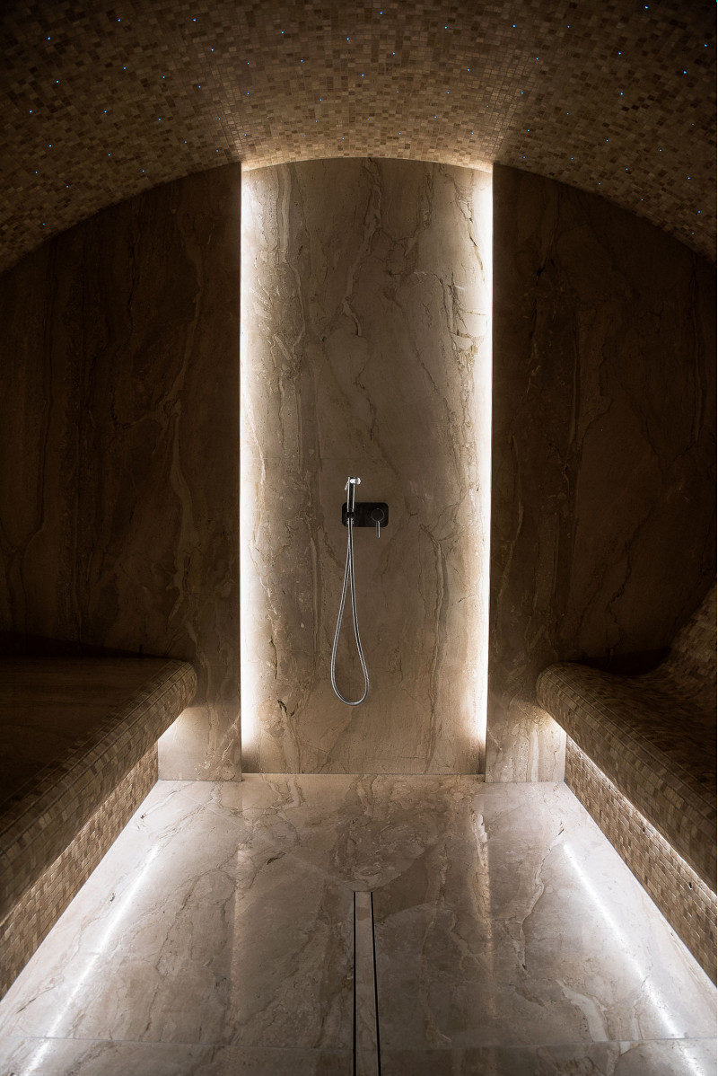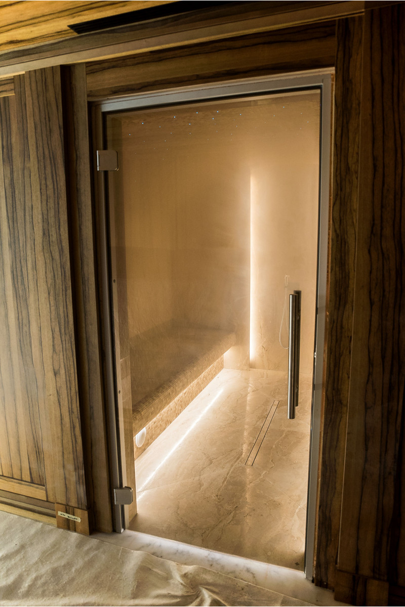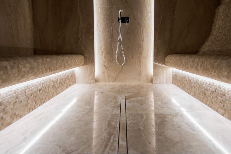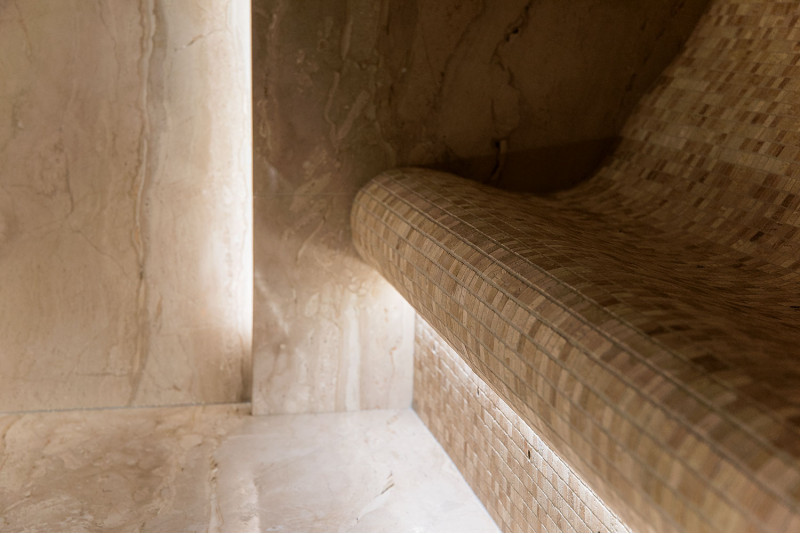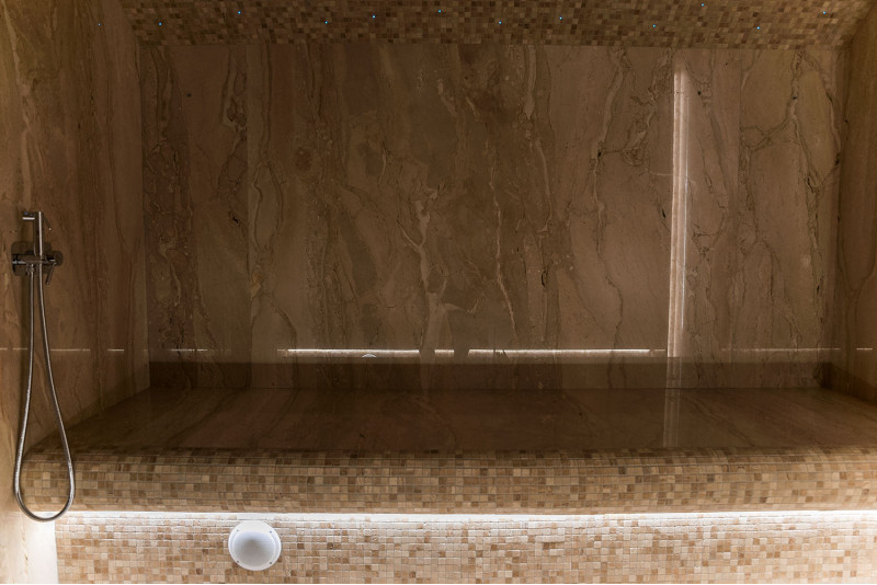 Стены паровой бани облицованы мраморными плитами, кровати и потолки выложены мраморной мозаичной плиткой. Одна из кроватей, более широкая, предназначена для лежания, а другая с эргономичным изгибом формы - для сидения. Сауна нагревается парогенератором Pego мощностью 9 кВт, который управляется сенсорным блоком управления Fasel. Светодиодное освещение в сауне находится под кроватями и на стенах, система «Žvaigždėtas dangus» встроена в потолок. Ароматный насос излучает в сауну приятный запах и свежесть.