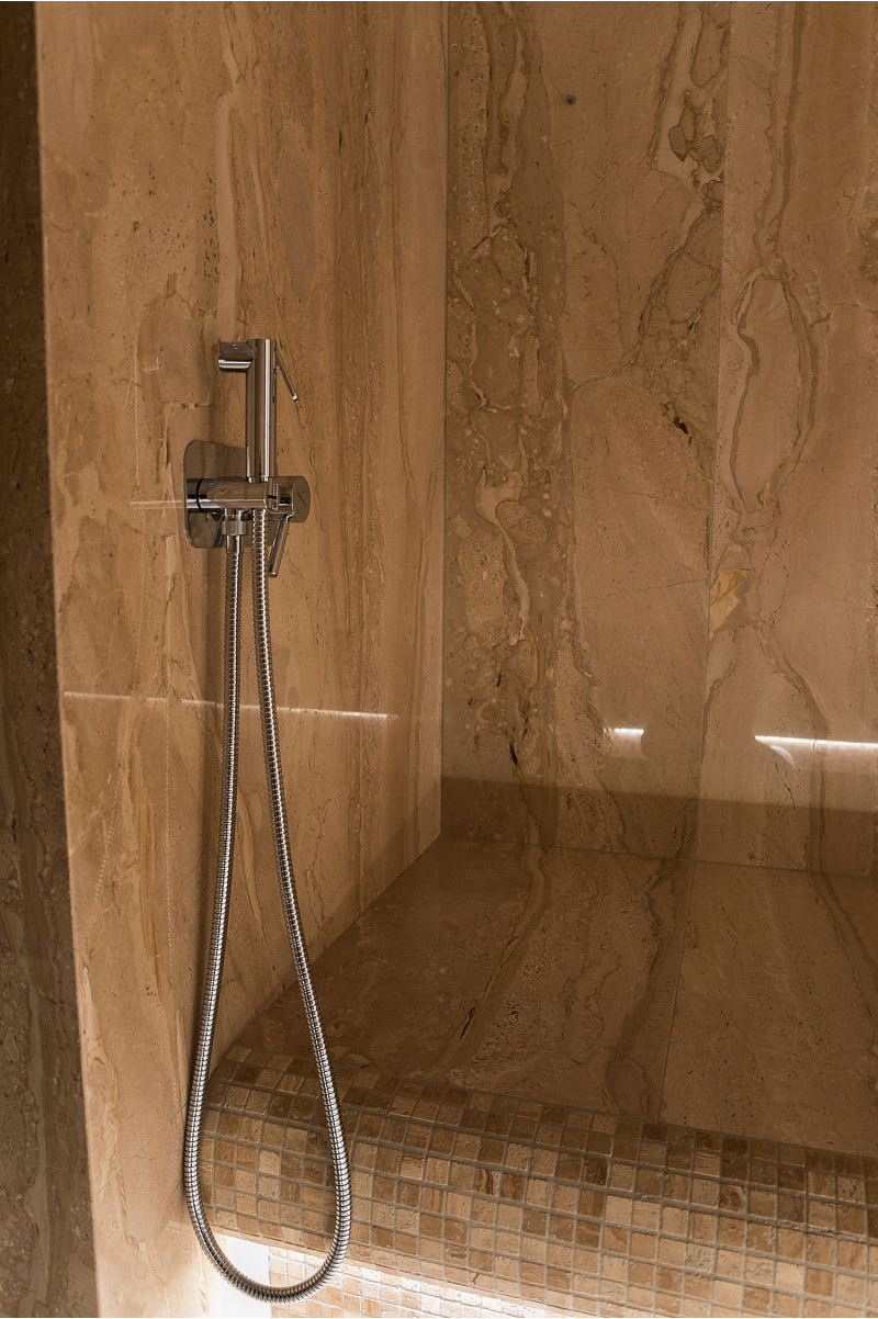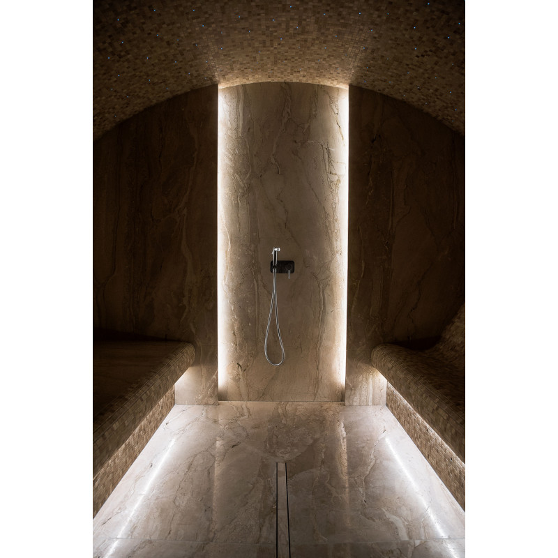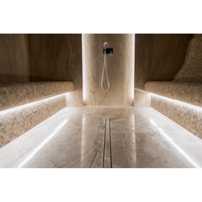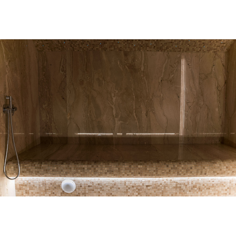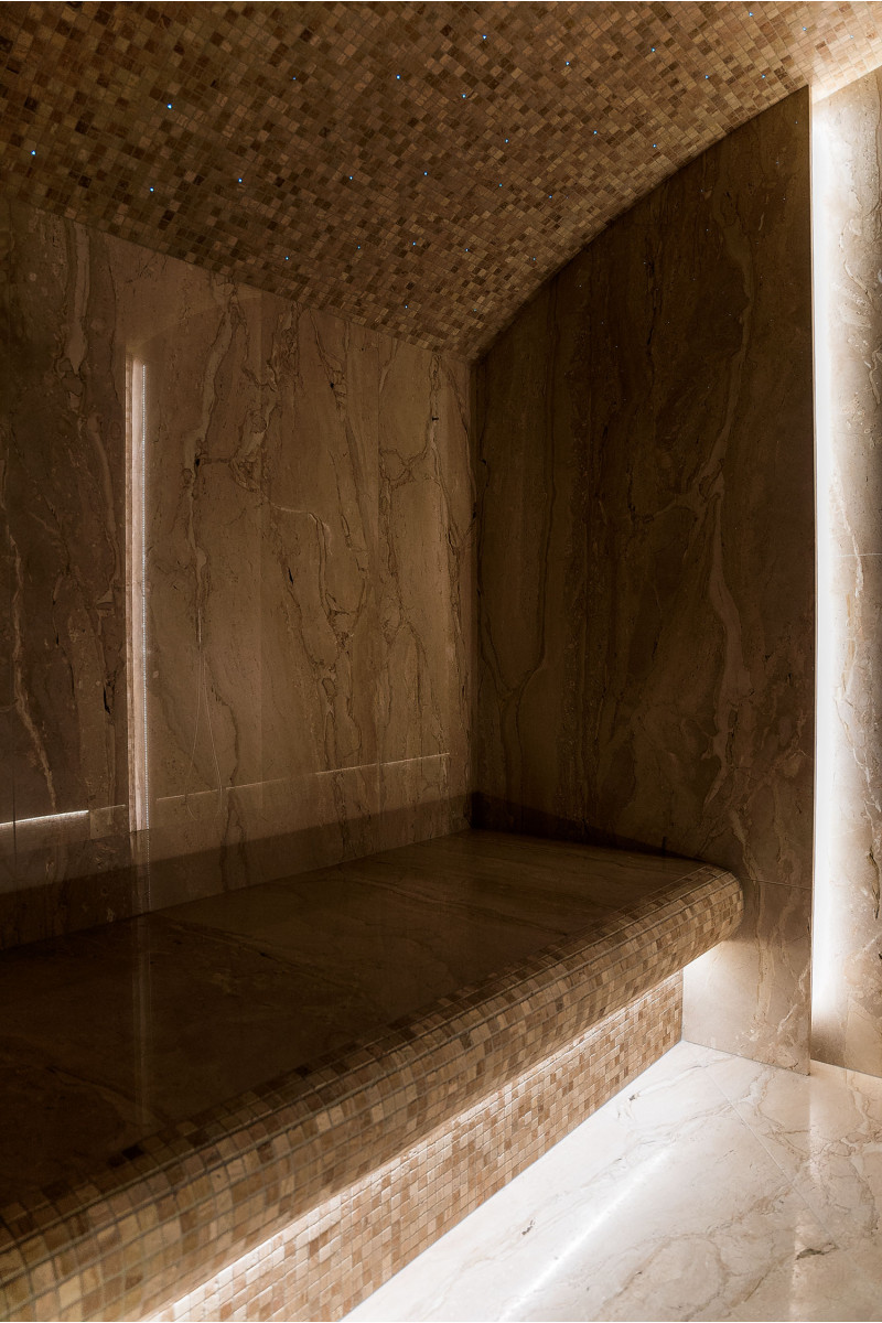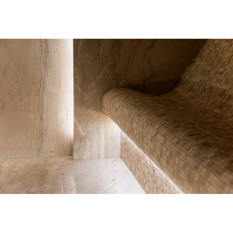 Стены паровой бани облицованы мраморными плитами, кровати и потолки выложены мраморной мозаичной плиткой. Одна из кроватей, более широкая, предназначена для лежания, а другая с эргономичным изгибом формы - для сидения. Сауна нагревается парогенератором Pego мощностью 9 кВт, который управляется сенсорным блоком управления Fasel. Светодиодное освещение в сауне находится под кроватями и на стенах, система «Žvaigždėtas dangus» встроена в потолок. Ароматный насос излучает в сауну приятный запах и свежесть.