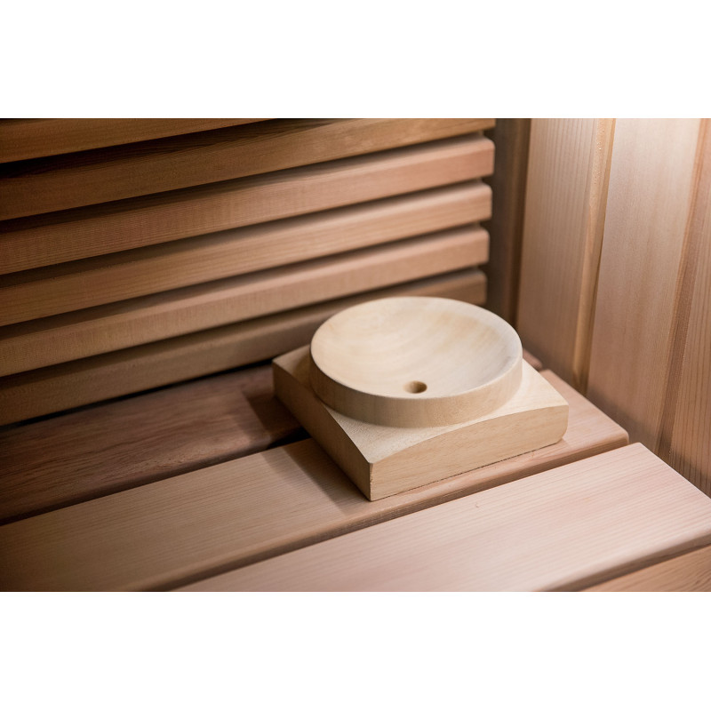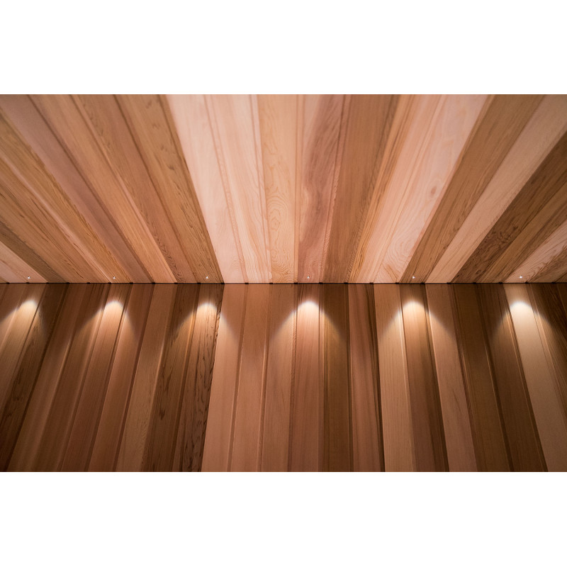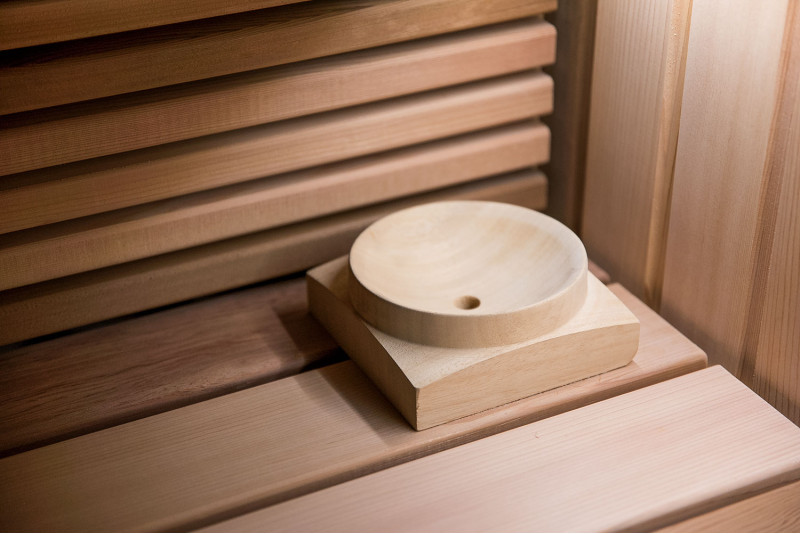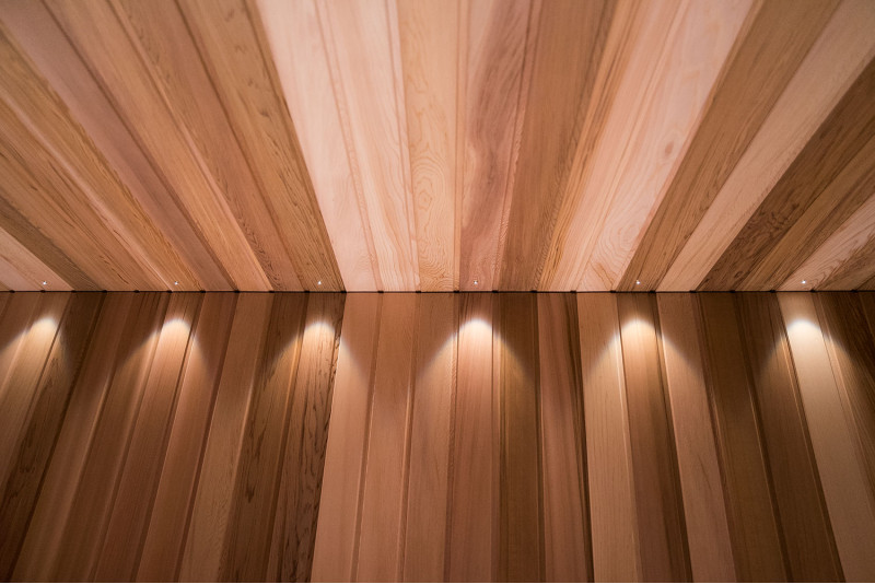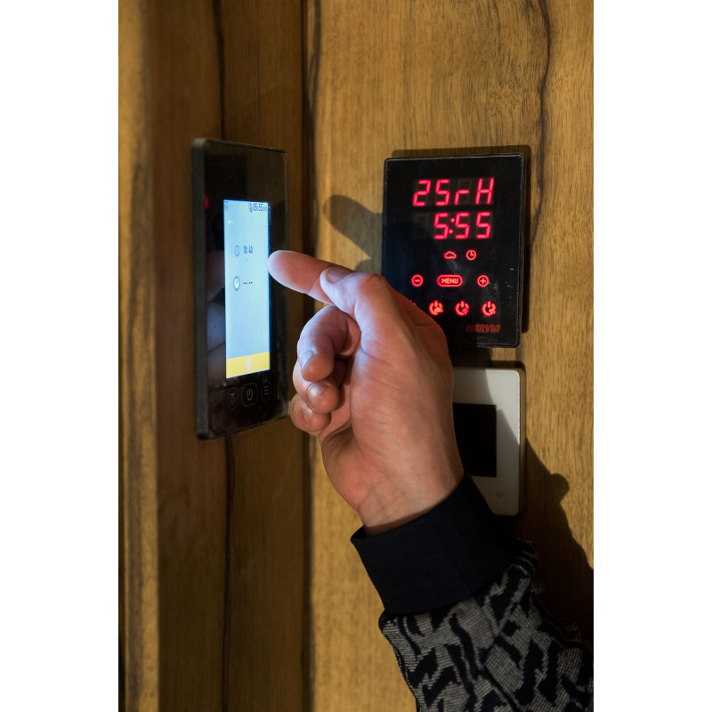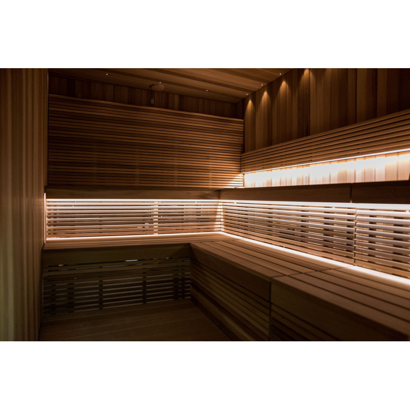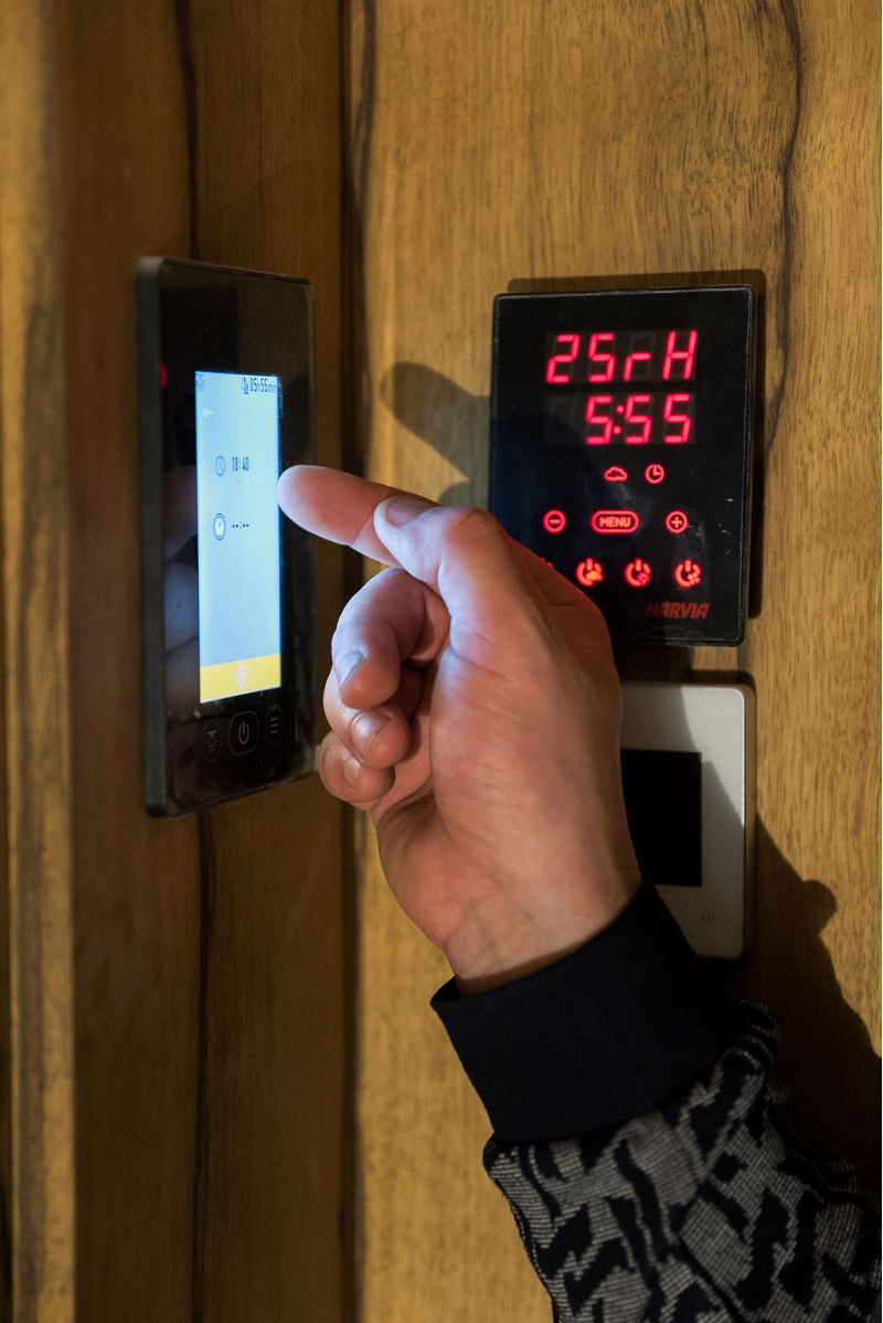 Для сауны было выбрано очень красивое дерево - красный канадский кедр. Декоративные деревянные блоки подсвечиваются светодиодной системой, в потолок встроен волоконно-оптический комплект освещения Cariitti. Под кроватями сауны установлена каменка EOS bi-O Mat со встроенным испарителем, управляемая блоком управления Harvia Xenio Combi CX110C.