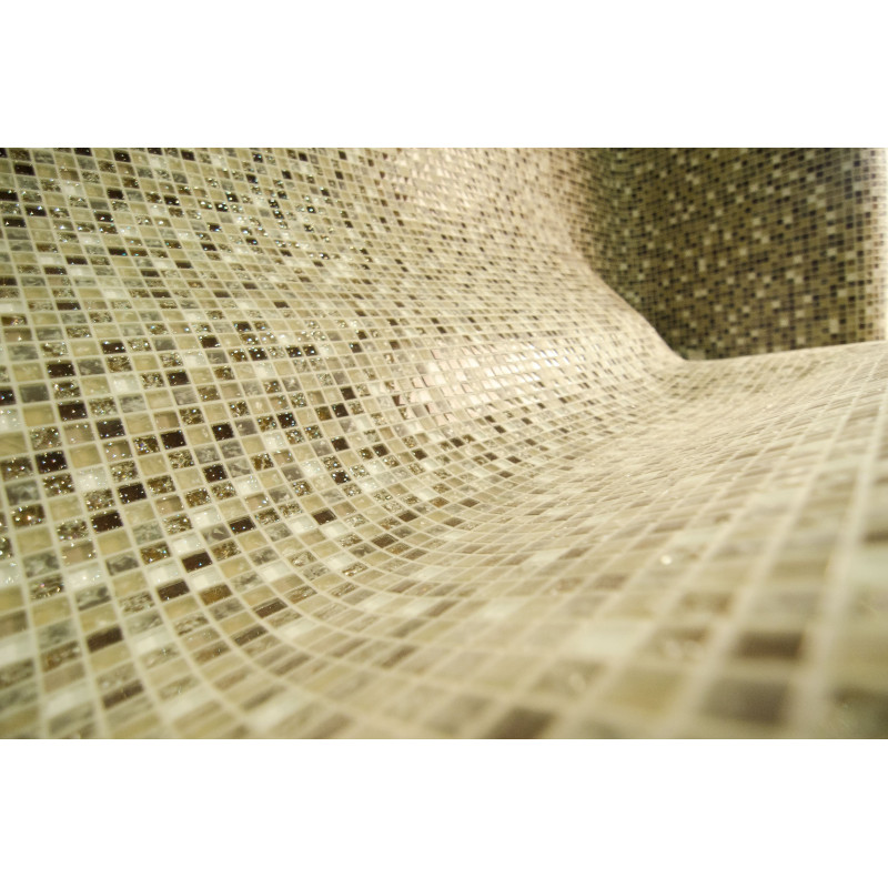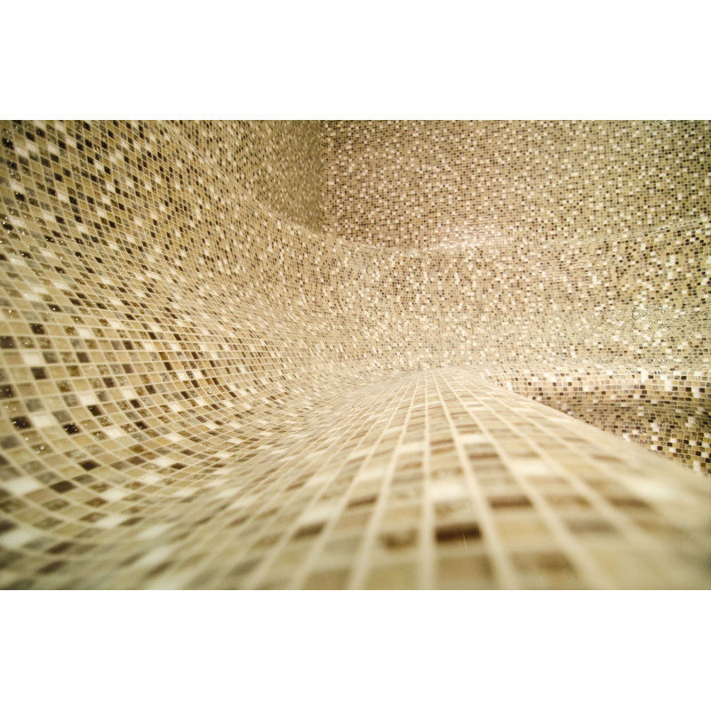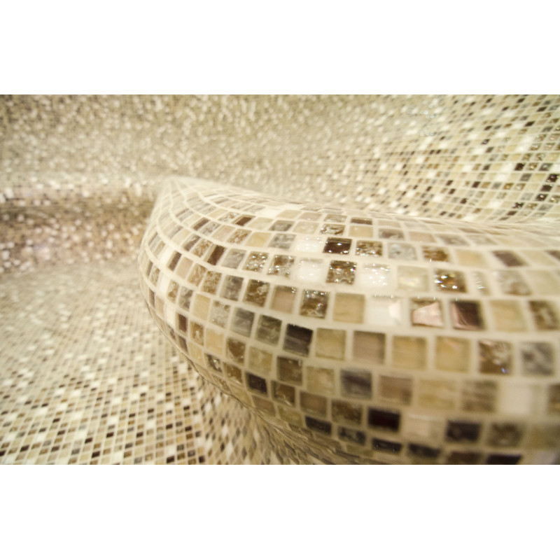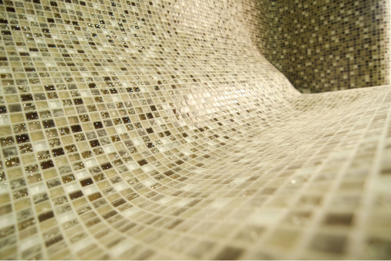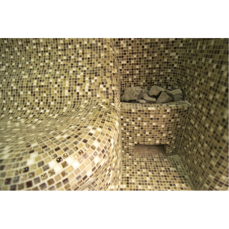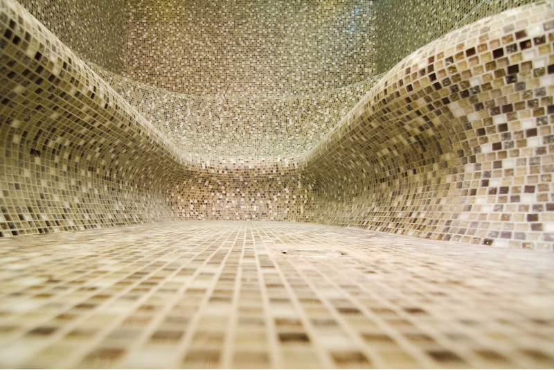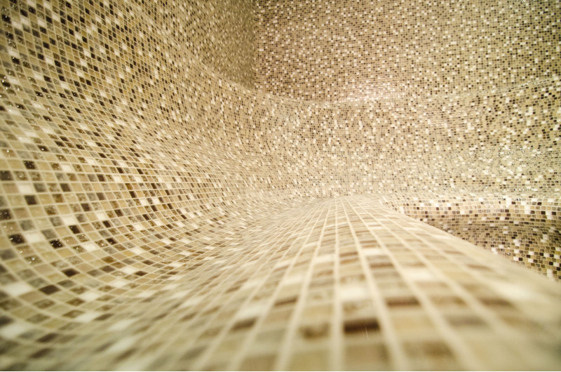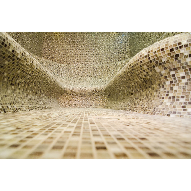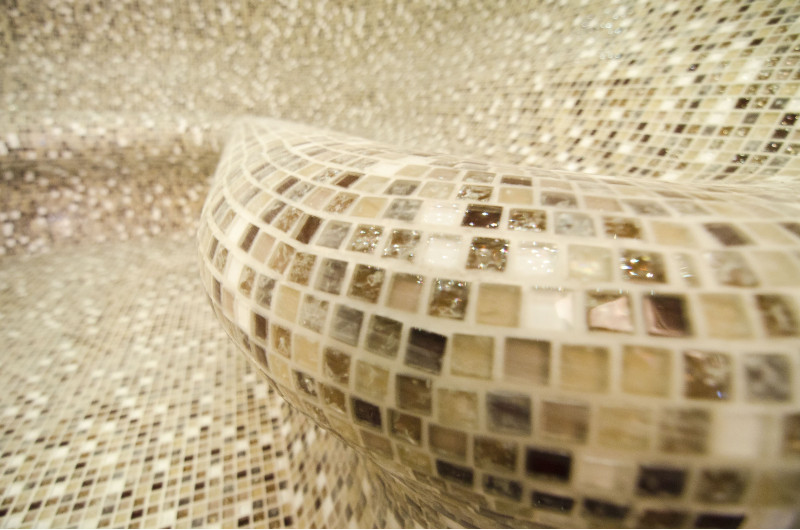Отделка - стены, скамейки, полы декорированы мелкой мозаикой, плиткой натурального цвета.