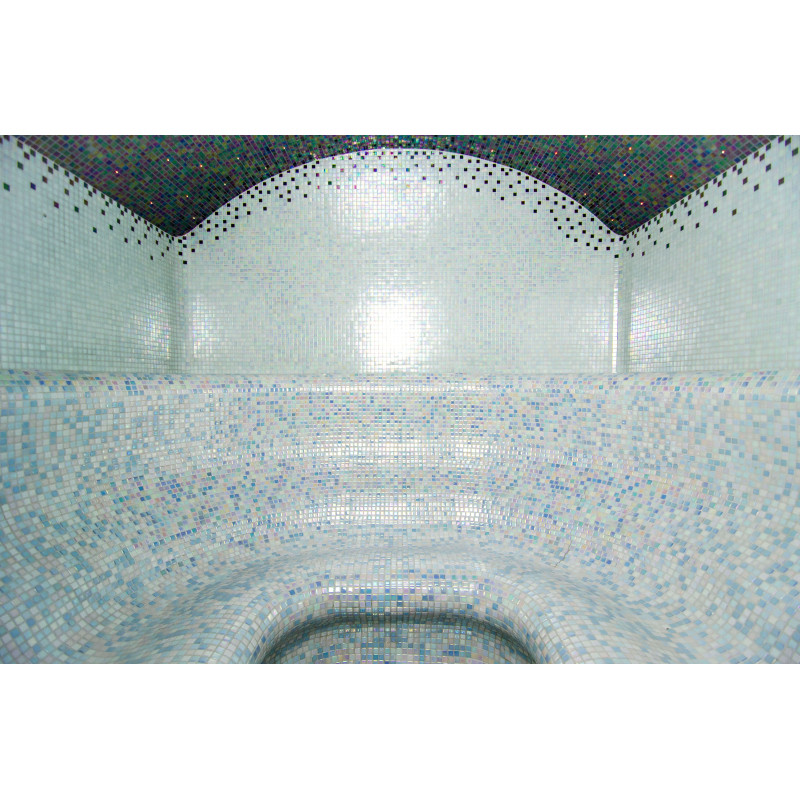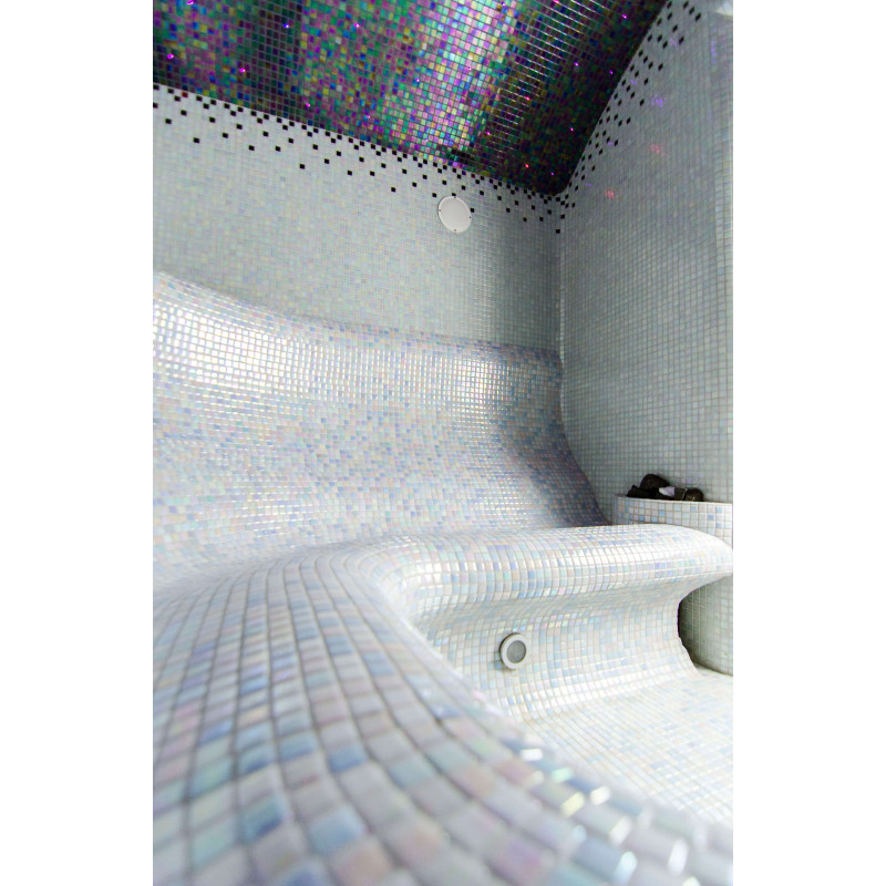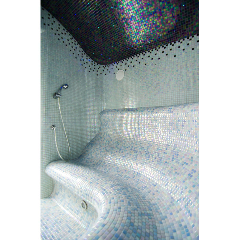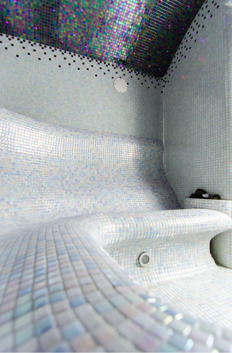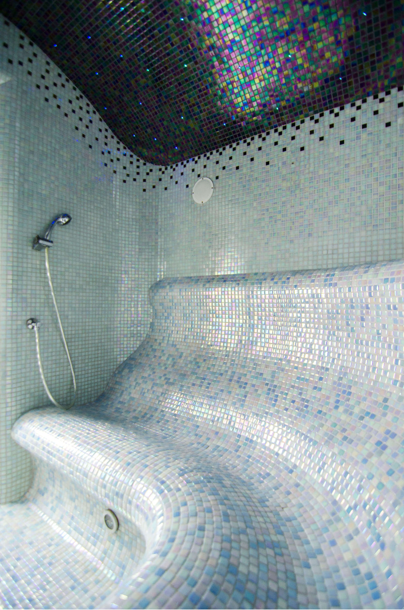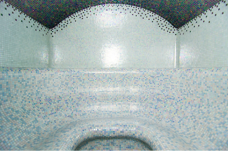 Скамейки, пол и стены отделаны мозаичной плиткой пастельных тонов. Потолок покрыт цветной плиткой, которая вместе с потолочной подсветкой дает еще более впечатляющий вид.