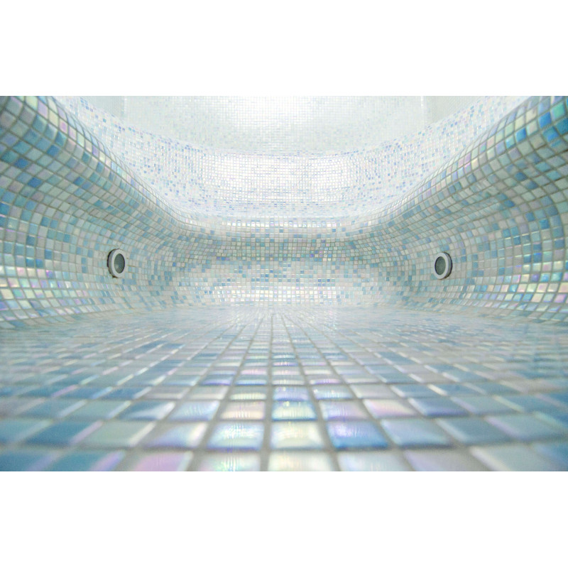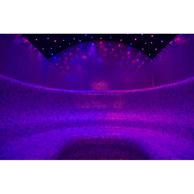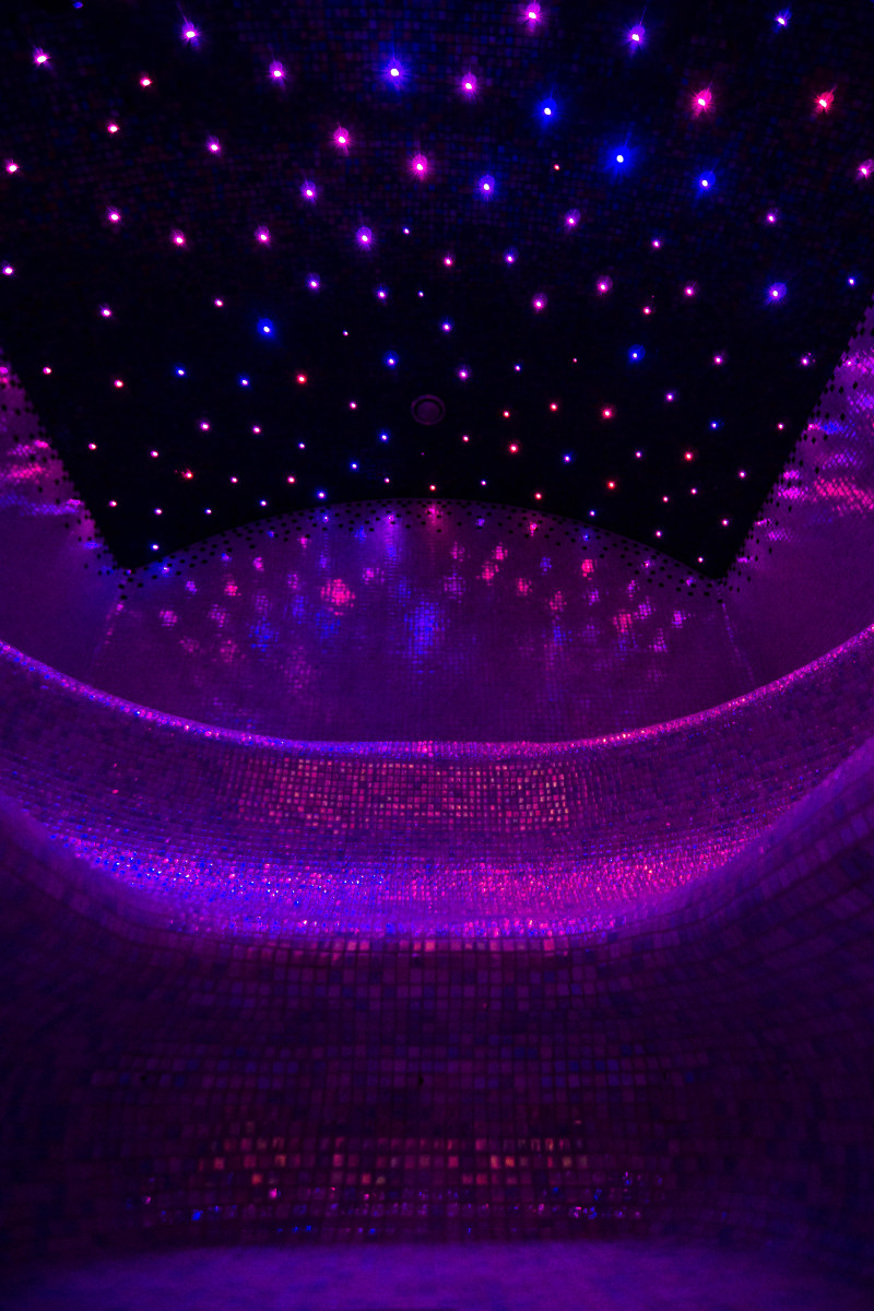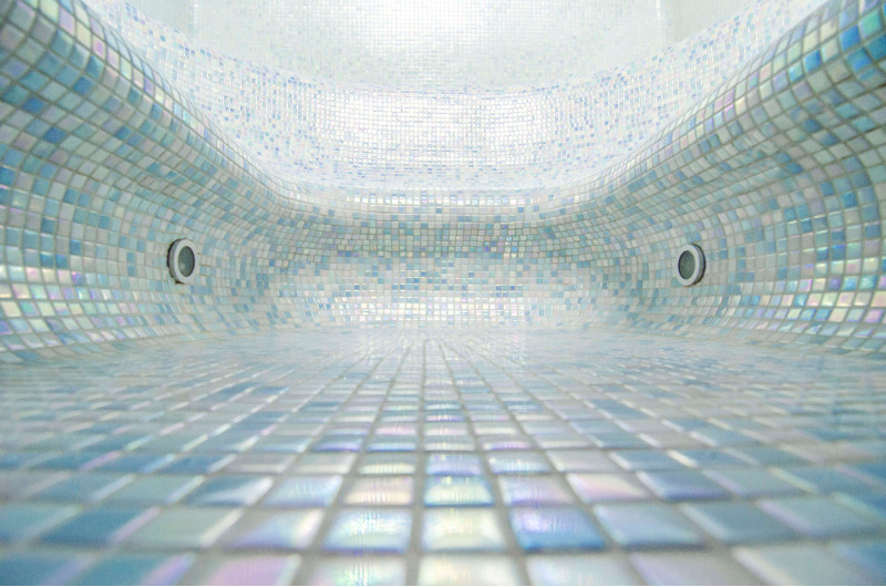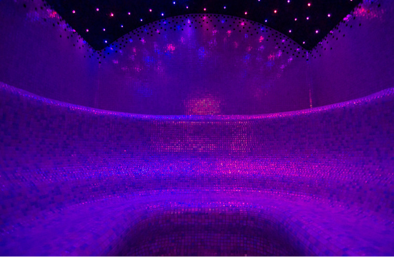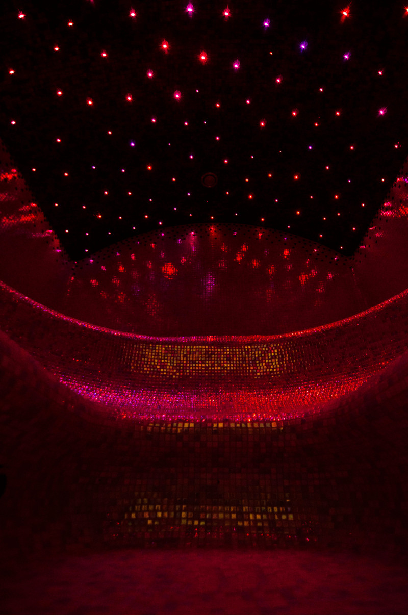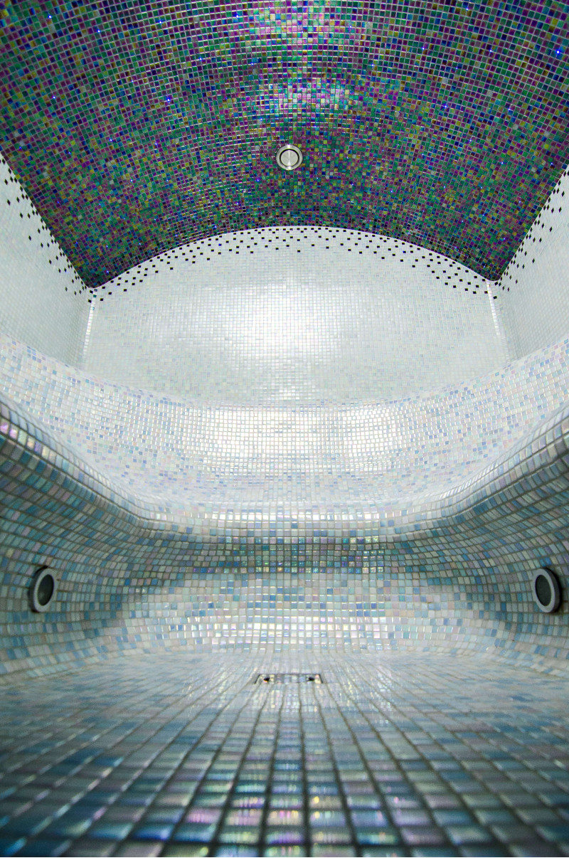 Скамейки, пол и стены отделаны мозаичной плиткой пастельных тонов. Потолок покрыт цветной плиткой, которая вместе с потолочной подсветкой дает еще более впечатляющий вид.
