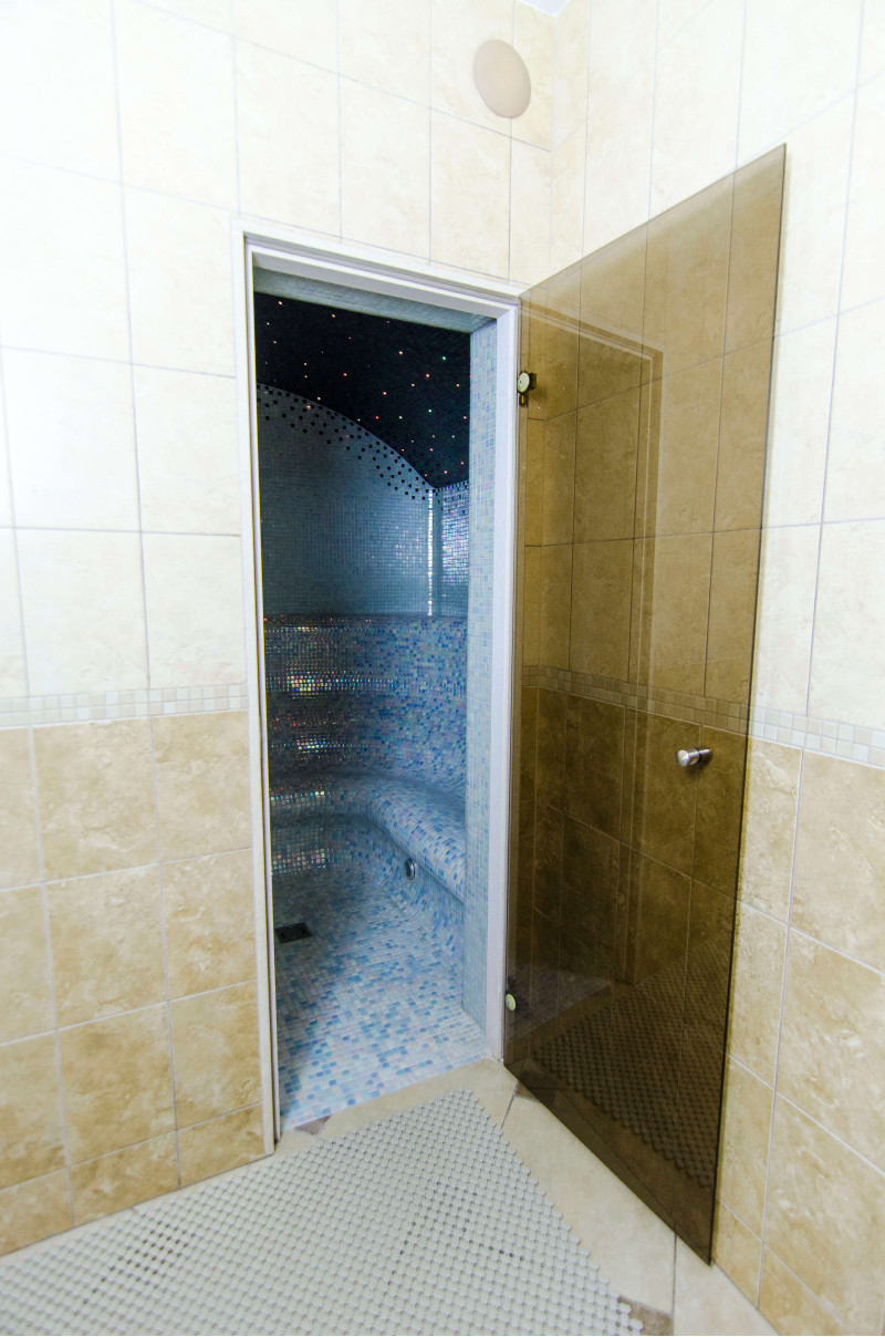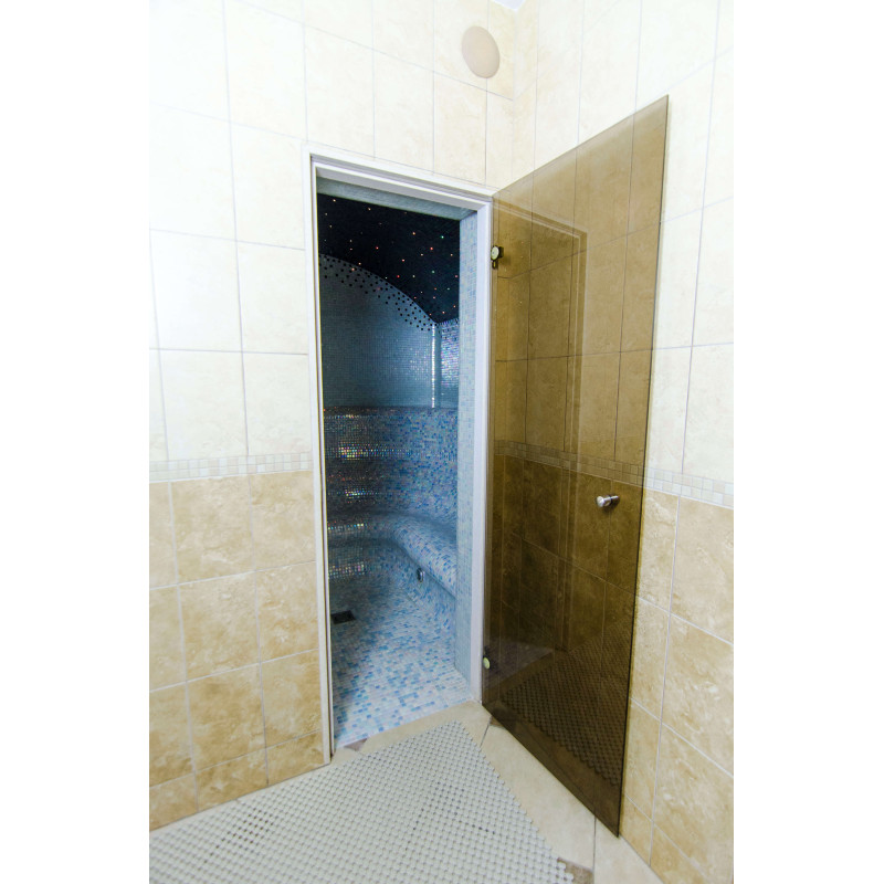 Стеклянные двери изготавливаются по индивидуальному заказу. Дверь устойчива к влаге и перепадам температур. Дверная коробка - мрамор.