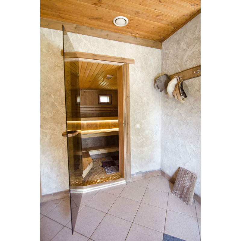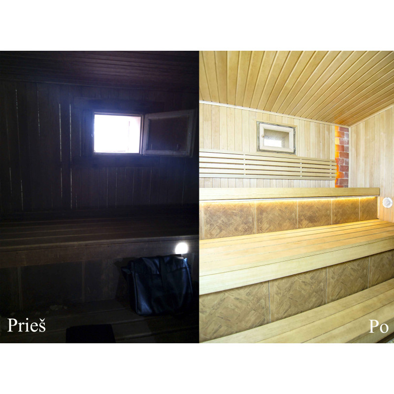 Заменено окно - деревянная рама, стекло закаленное. Изношенные двери сауны заменены новыми - специально для саун с закаленным стеклом и деревянным каркасом. Это стекло подвергается термообработке, в 5 раз прочнее обычного. Каркас изготовлен из специально подготовленной древесины, чтобы предотвратить деформацию каркаса из-за колебаний температуры.