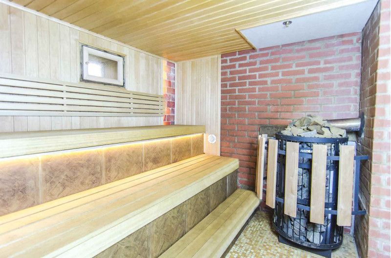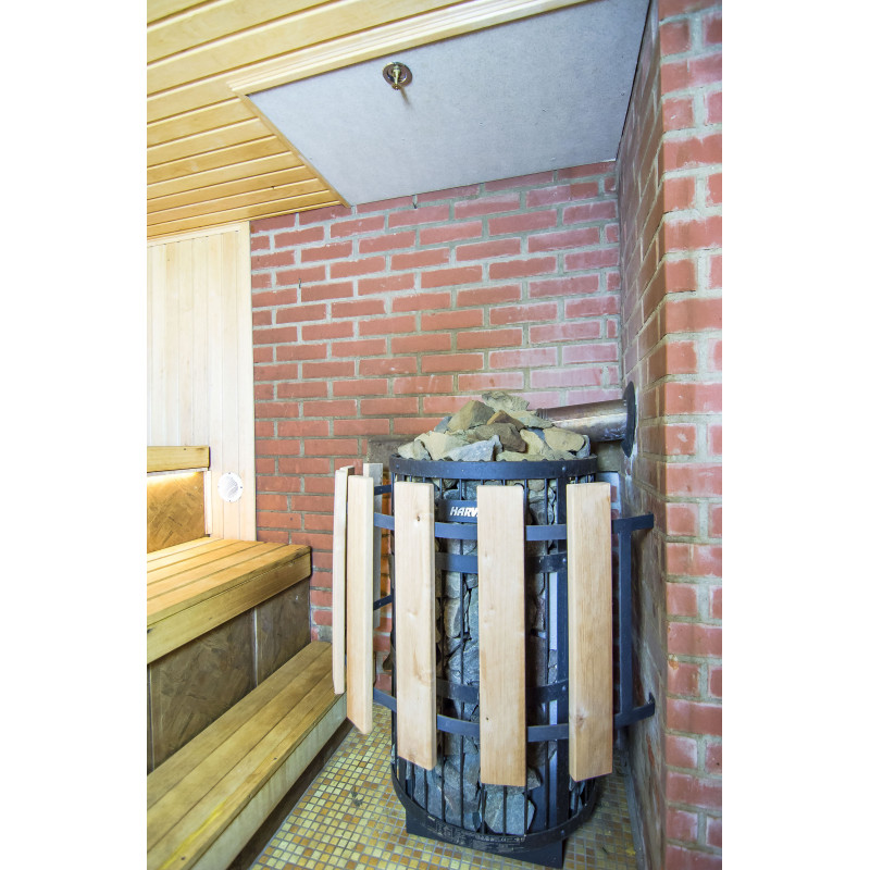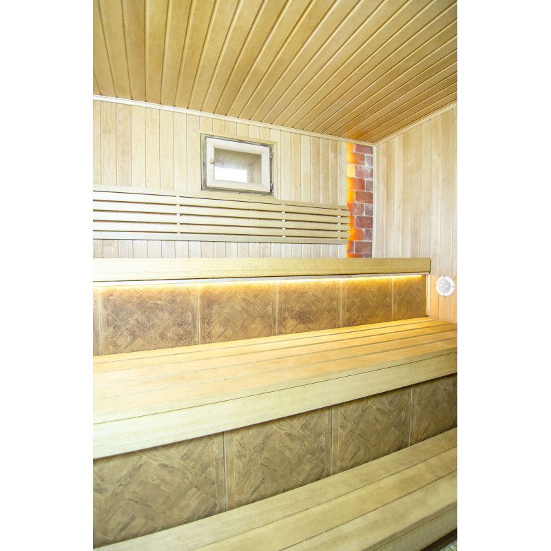 Заменено отопительное оборудование сауны. Каменка ручной работы была преобразована в дровяную Harvia Legend 300 Duo с внешней топкой, вмещающей большое количество камней, что позволяет вам наслаждаться теплом, которое они излучают, даже при отсутствии высоких температур. На потолке установлена противопожарная система - плита Минерит Сауна, ороситель. Вокруг каменки установлена защитная окантовка из дерева и металла.