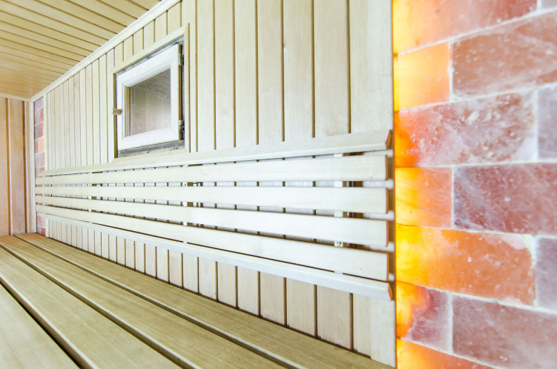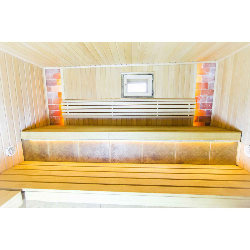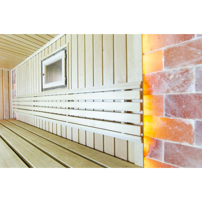 Для оформления сауны был выбран отличный декоративный элемент - блоки гималайской соли. Гималайская соль не только прекрасно выглядит, но и улучшает качество воздуха в помещении, уменьшает симптомы аллергии и астмы, поднимает настроение и дает энергию, нейтрализует электромагнитное излучение, снижает статическое электричество в воздухе. Встроенная светодиодная подсветка за соляными блоками создает еще более уютную атмосферу в сауне и подчеркивает внешний вид гималайских соляных блоков.