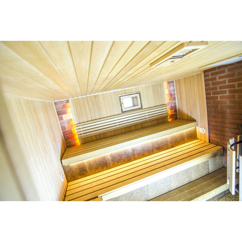 Для стен и потолка был выбран широкий сайдинг из черной ольхи. Скамейки изготовлены из качественного ненагреваемого дерева абачи, поэтому на таких скамейках приятно сидеть или лежать, не обжигая кожу. Под скамейками установлено светодиодное освещение.