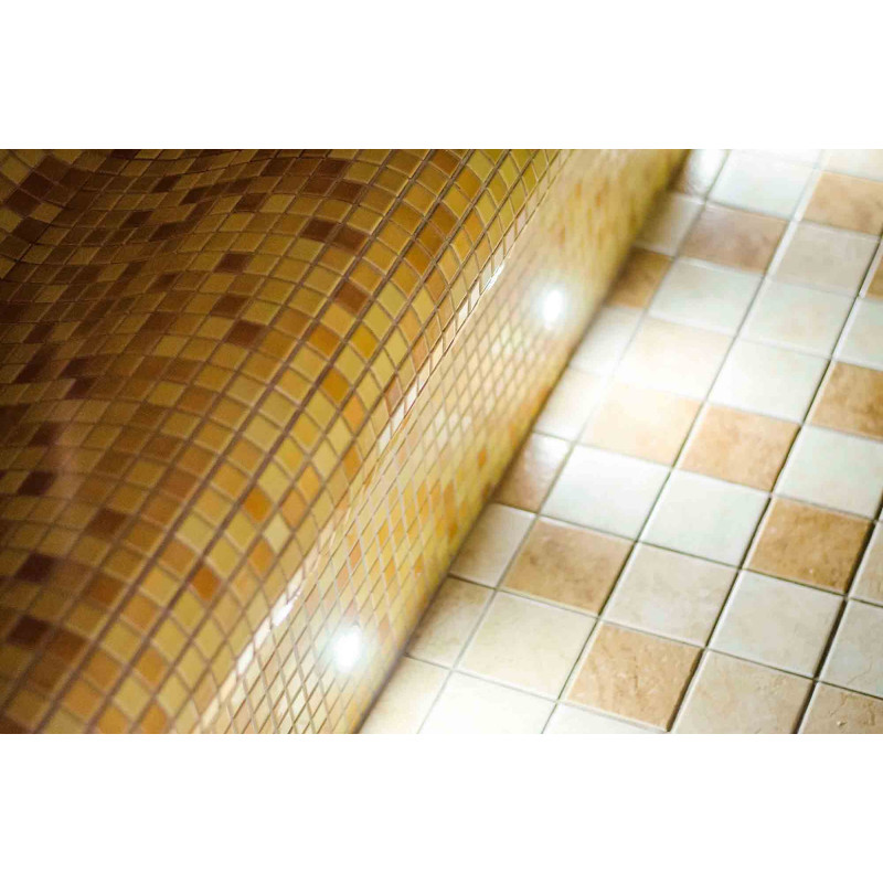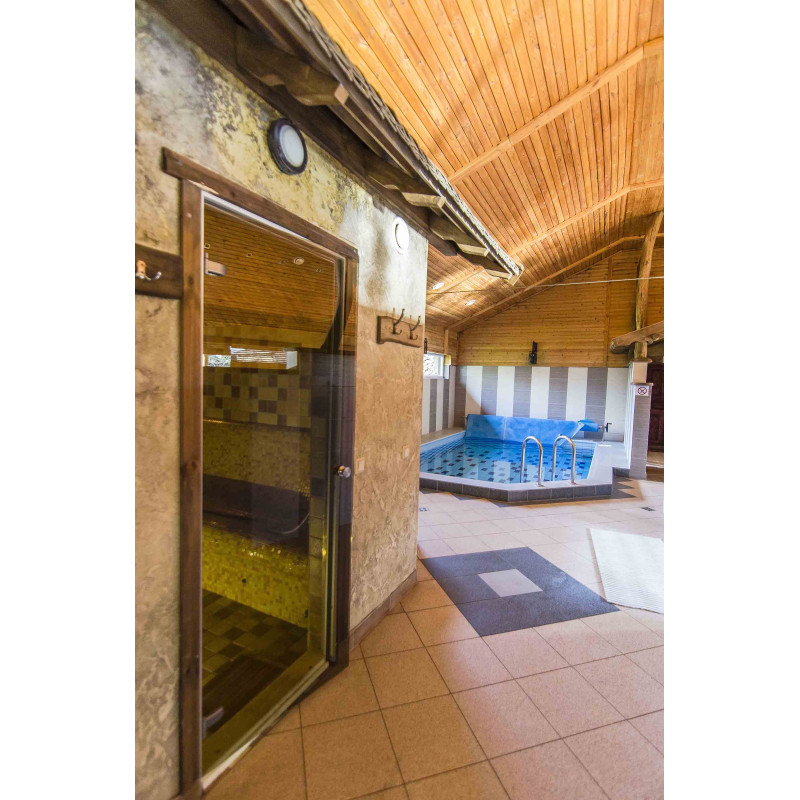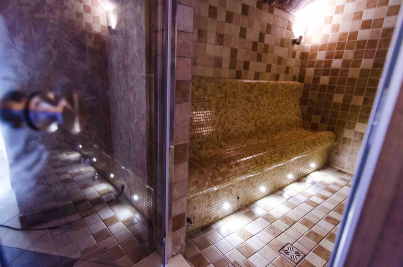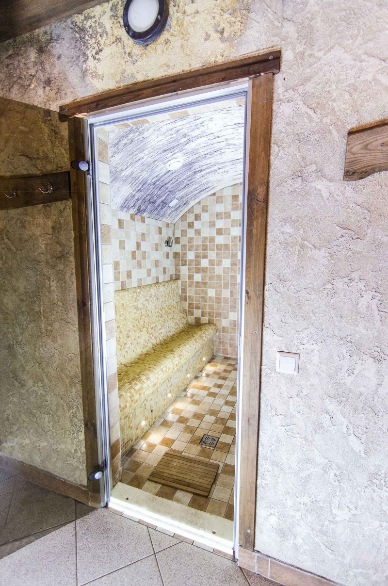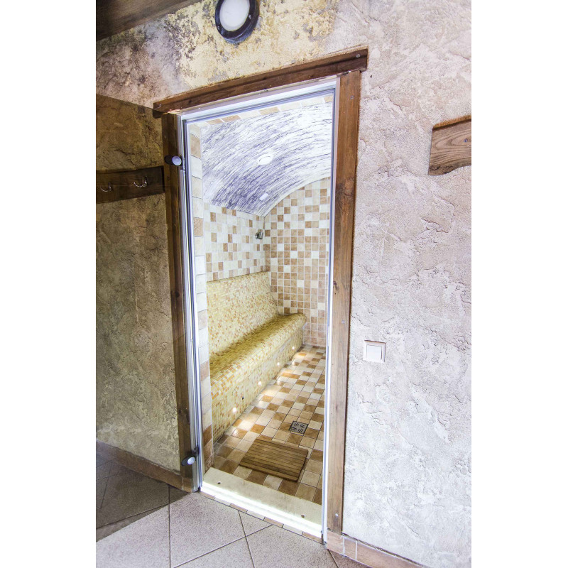 Двери со старым деревянным каркасом заменены на подходящие для паровой сауны - с алюминиевым каркасом, тонированным, закаленным стеклом. Этот тип двери и коробки устойчив к жаре и влажности, перепадам температур, не деформируется.