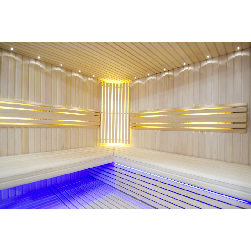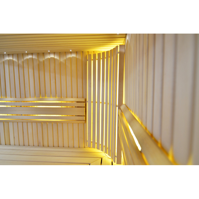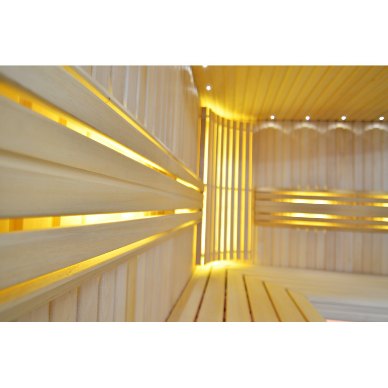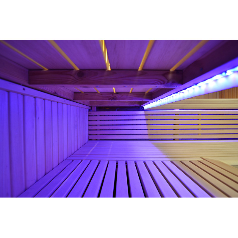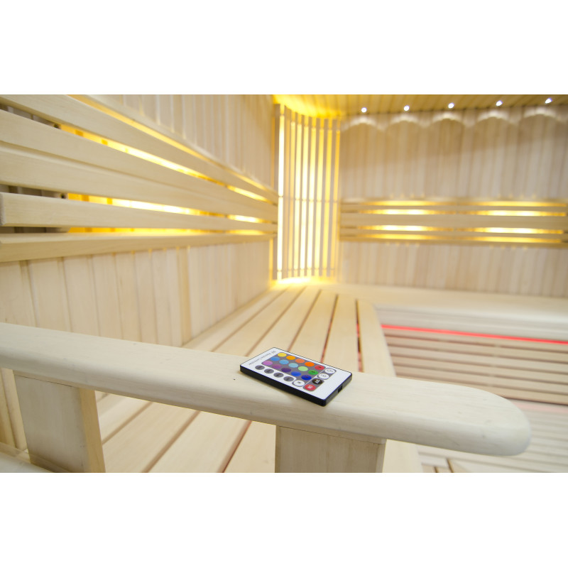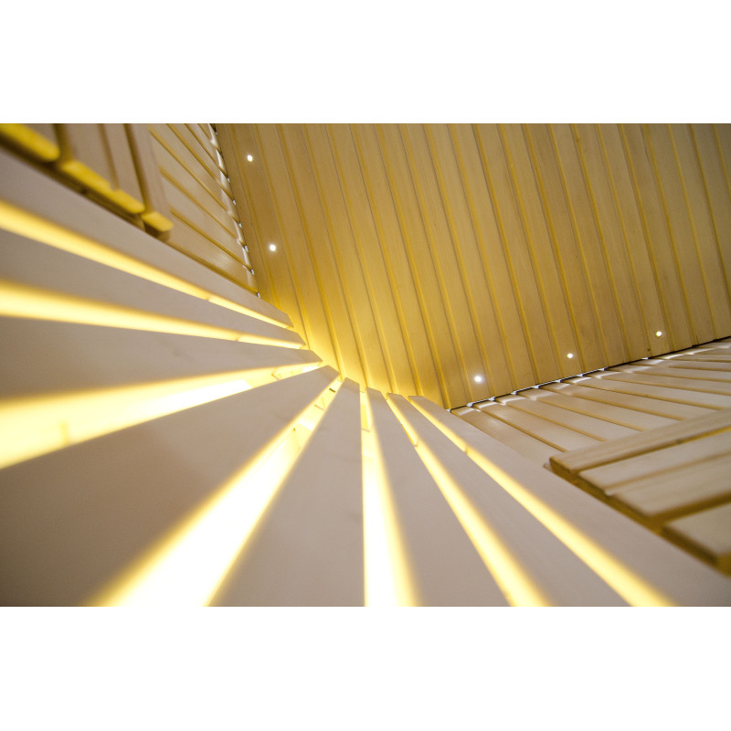 Потолок подсвечивается белой светодиодной подсветкой «Луна» - хорошей альтернативой оптоволоконному освещению. На стенах под спинками - белая светодиодная тёплая подсветка, которая отлично подчеркивает фактуру дерева. Под скамейками - цветная светодиодная RGB-подсветка, цветами которой вы легко можете управлять с помощью пульта дистанционного управления, чтобы создать желаемую атмосферу сауны.