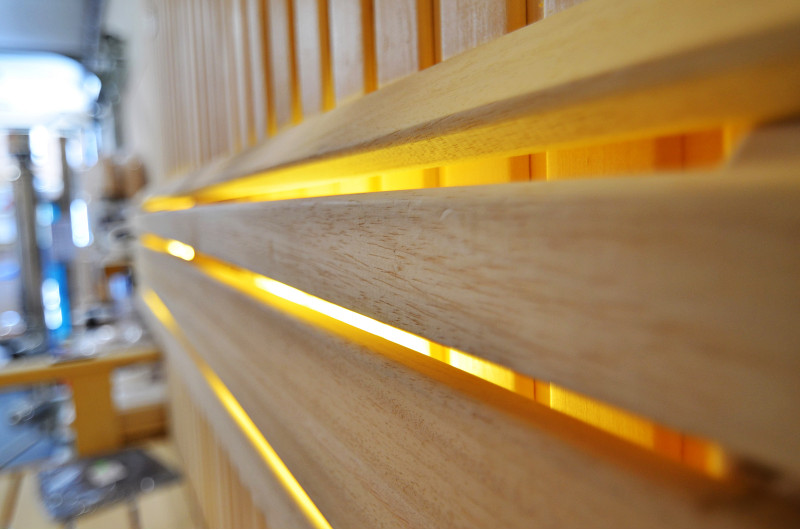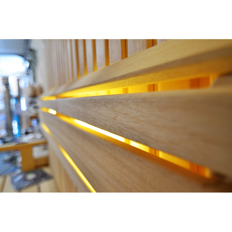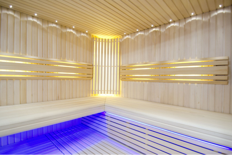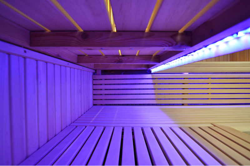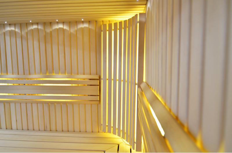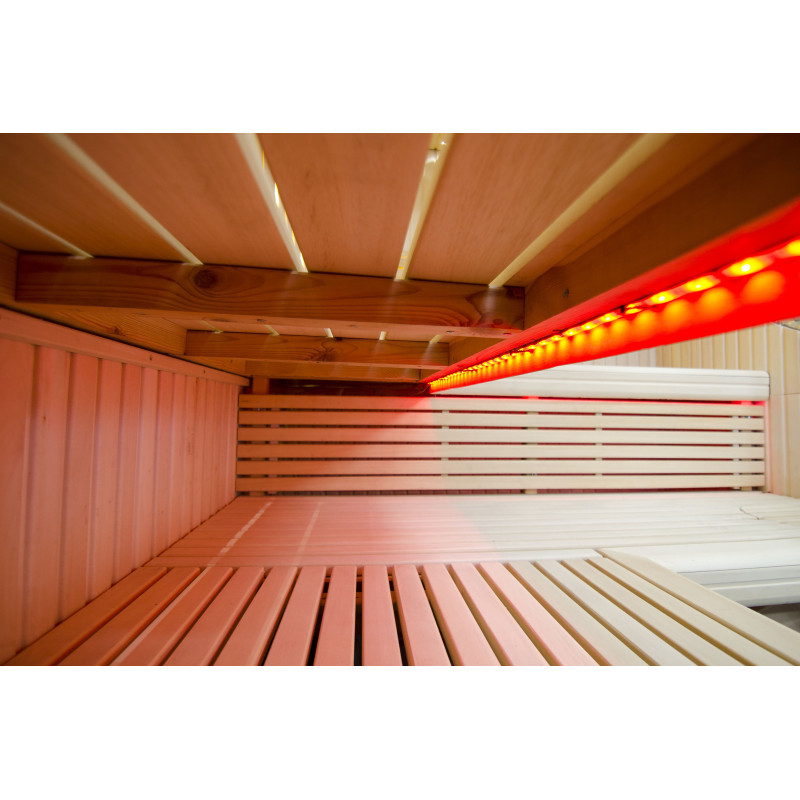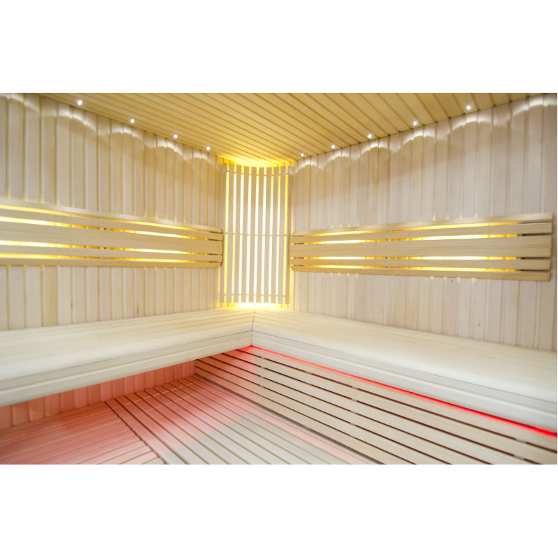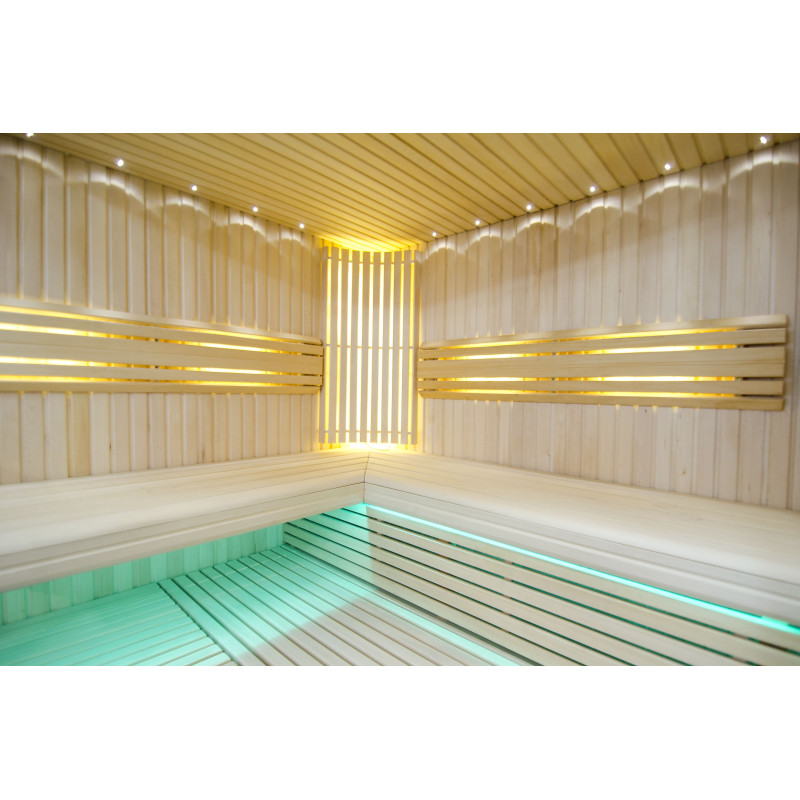 Потолок подсвечивается белой светодиодной подсветкой «Луна» - хорошей альтернативой оптоволоконному освещению. На стенах под спинками - белая светодиодная тёплая подсветка, которая отлично подчеркивает фактуру дерева. Под скамейками - цветная светодиодная RGB-подсветка, цветами которой вы легко можете управлять с помощью пульта дистанционного управления, чтобы создать желаемую атмосферу сауны.