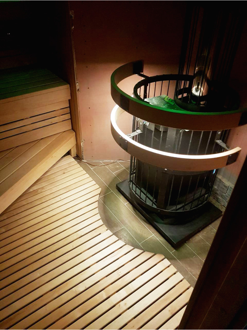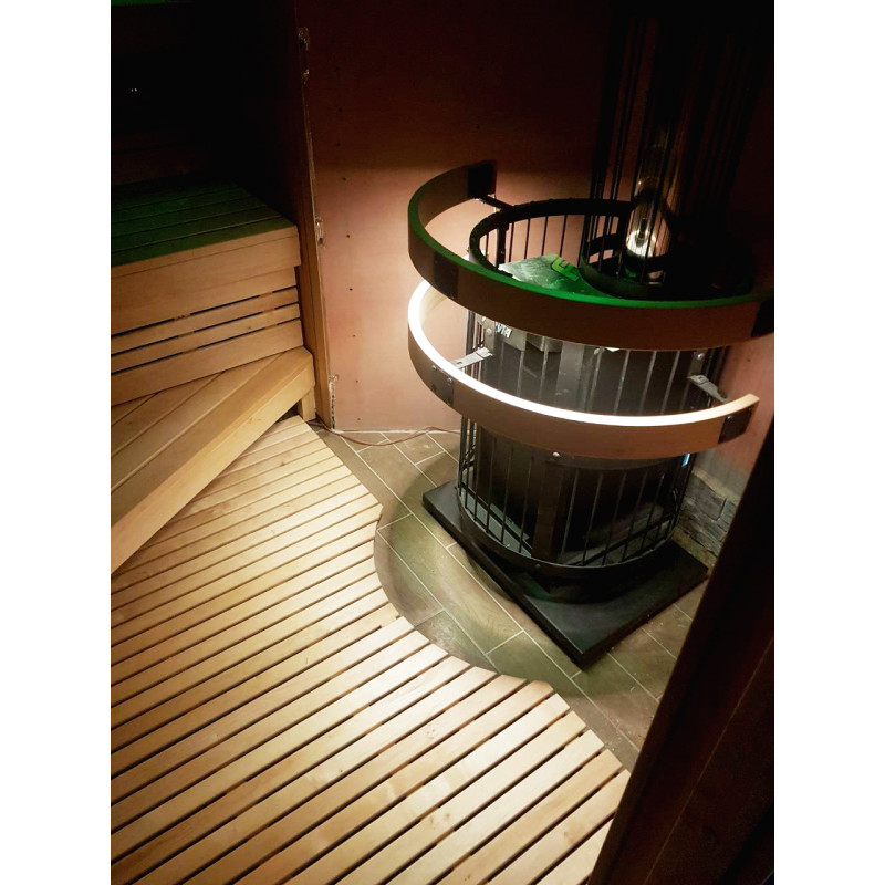 Была выбрана дровяная печь Harvia Legend 240 DUO с внешней топкой, чугунной дверцей и стеклянным окном, заполненным большим количеством мыльного камня, что позволяет наслаждаться теплом, которое они излучают, даже при отсутствии высоких температур. для сауны средних размеров. Кожухи для печей - Harvia Legend с освещением.