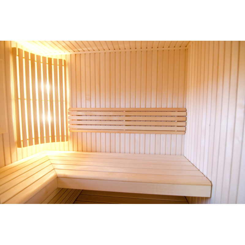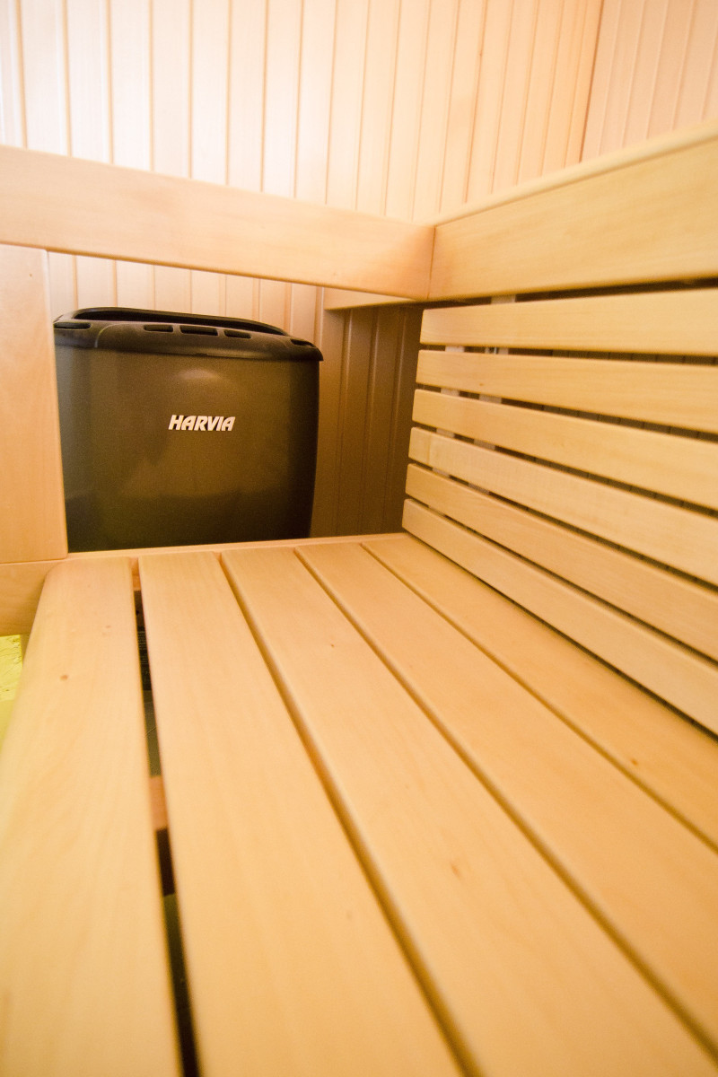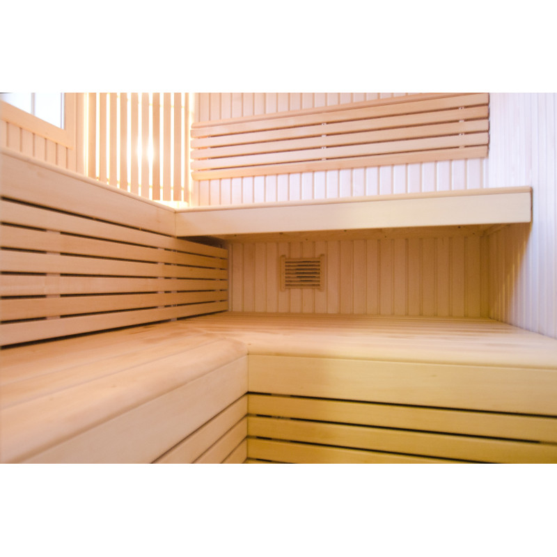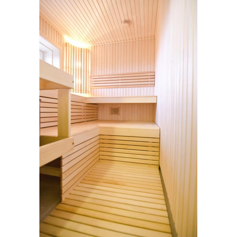 Облицовка стен и скамейки выполнены из древесины липы высочайшего качества. Дерево очень легкое, что придает сауне ощущение простора.