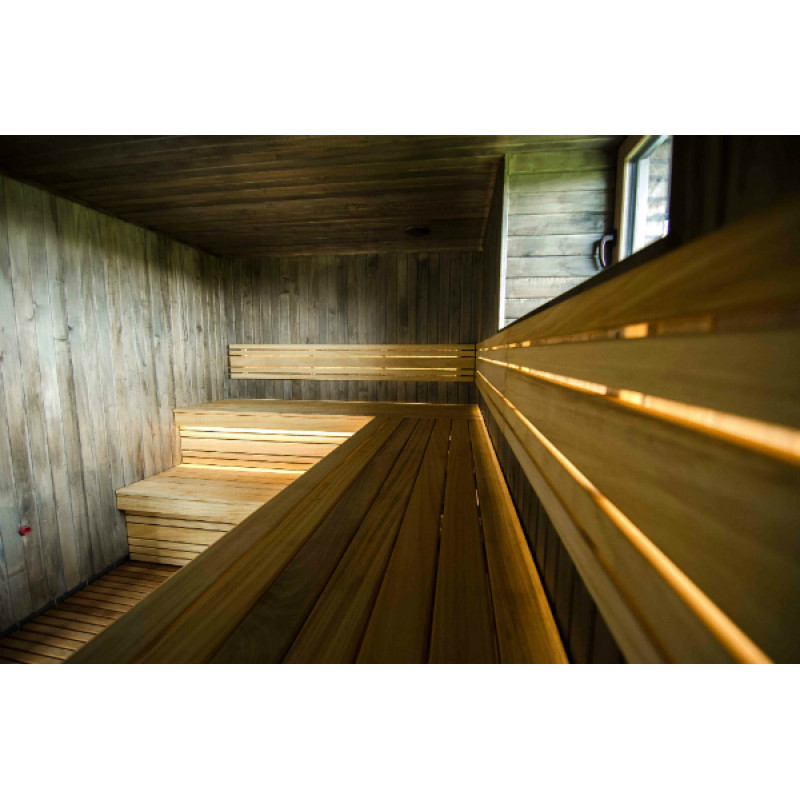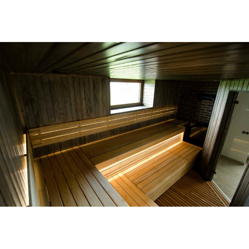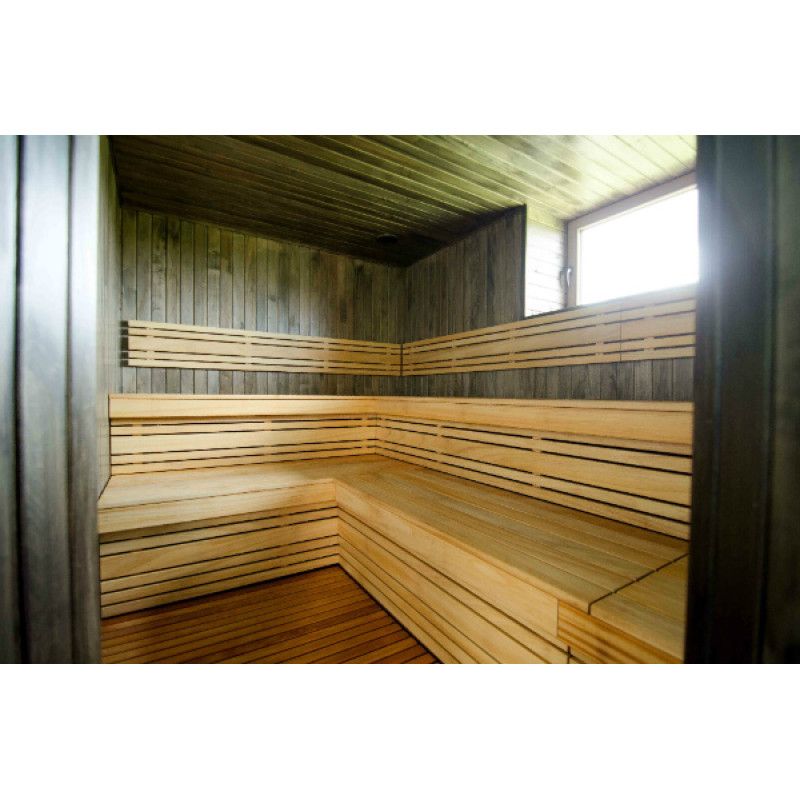 Для изготовления лежаков, спинок и напольных решеток для сауны выбрана высококачественная древесина африканского абачи. Это дерево не только прекрасно выглядит, но и не нагревается, поэтому при прикосновении к нему невозможно загореться. На таких скамейках особенно удобно и приятно париться в сауне.
