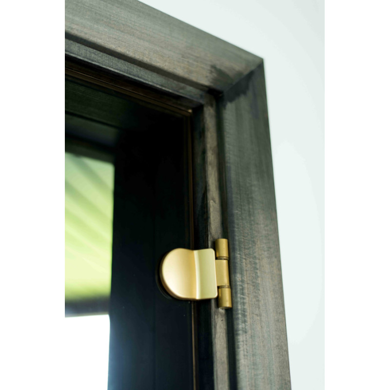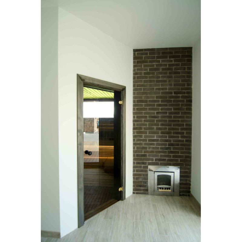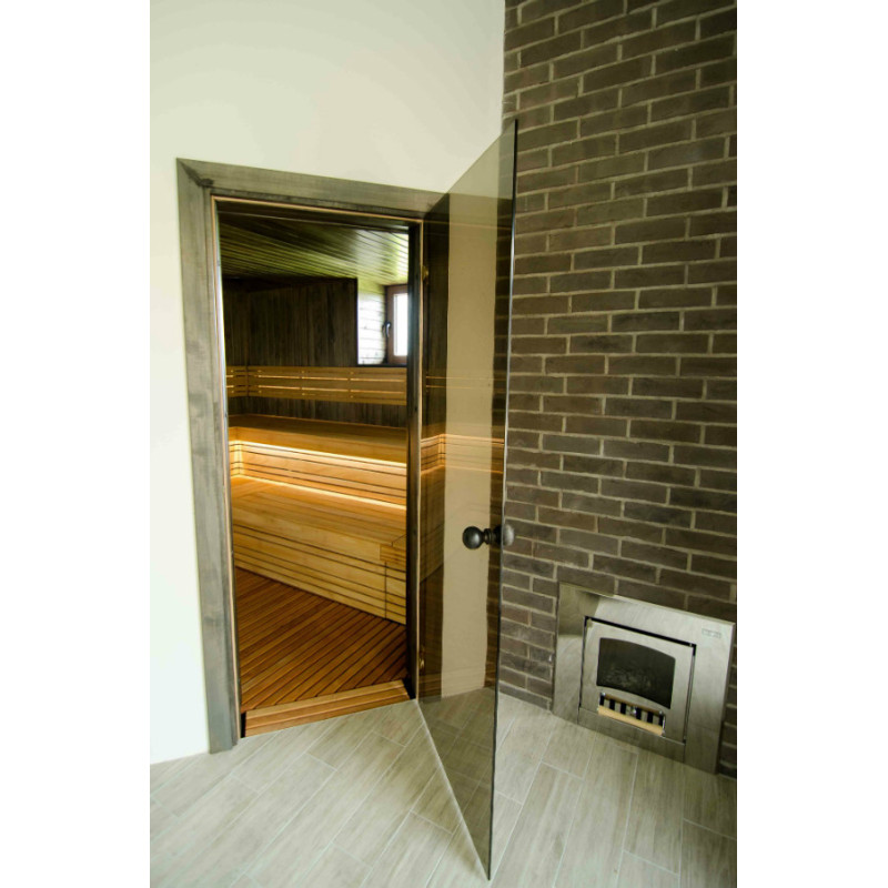 Двери с тонированным закаленным бронзовым стеклом, рама из дерева липа и круглая ручка.