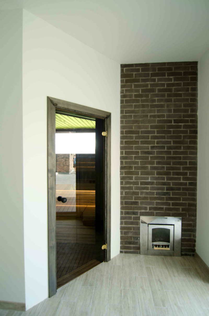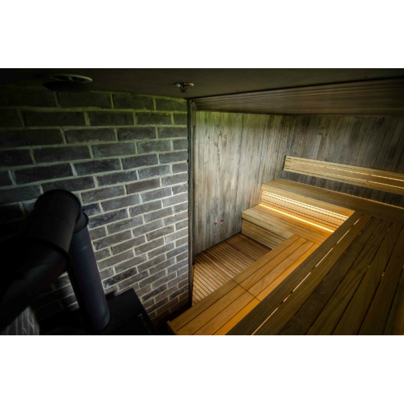 Стены и потолок, покрытые специальным черным воском, контрастируют с яркими скамейками в сауне, помещение выглядит уникально, создавая уютную и современную атмосферу. Этот контраст скамей и стен дополнительно подчеркивается встроенной устойчивой к температуре и влажности белой светодиодной подсветкой под скамьями и спинками.