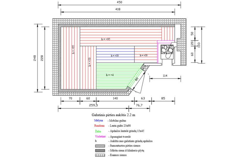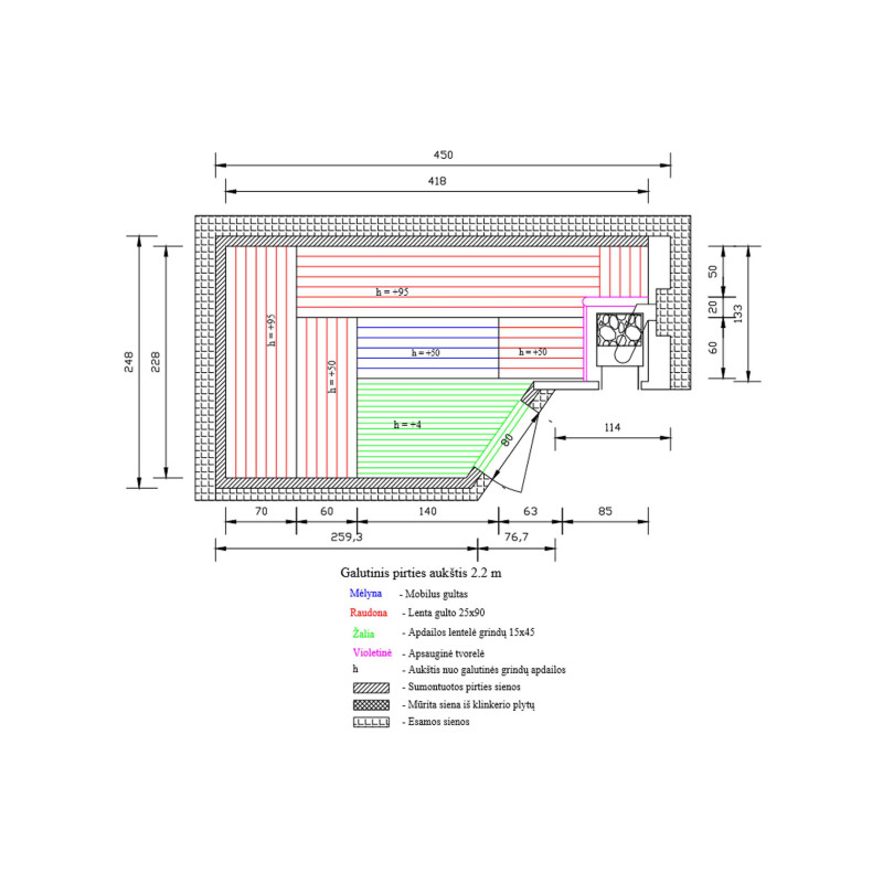 Облицовка потолка и стен - высший сорт липы AB. Липовый сайдинг имеет низкую теплоемкость, что способствует быстрому прогреву сауны. Также древесина липы содержит большое количество эфирных масел, древесина издает приятный естественный запах в сауне.