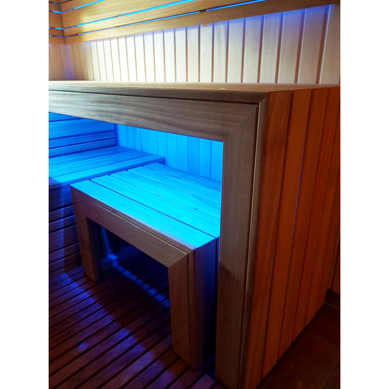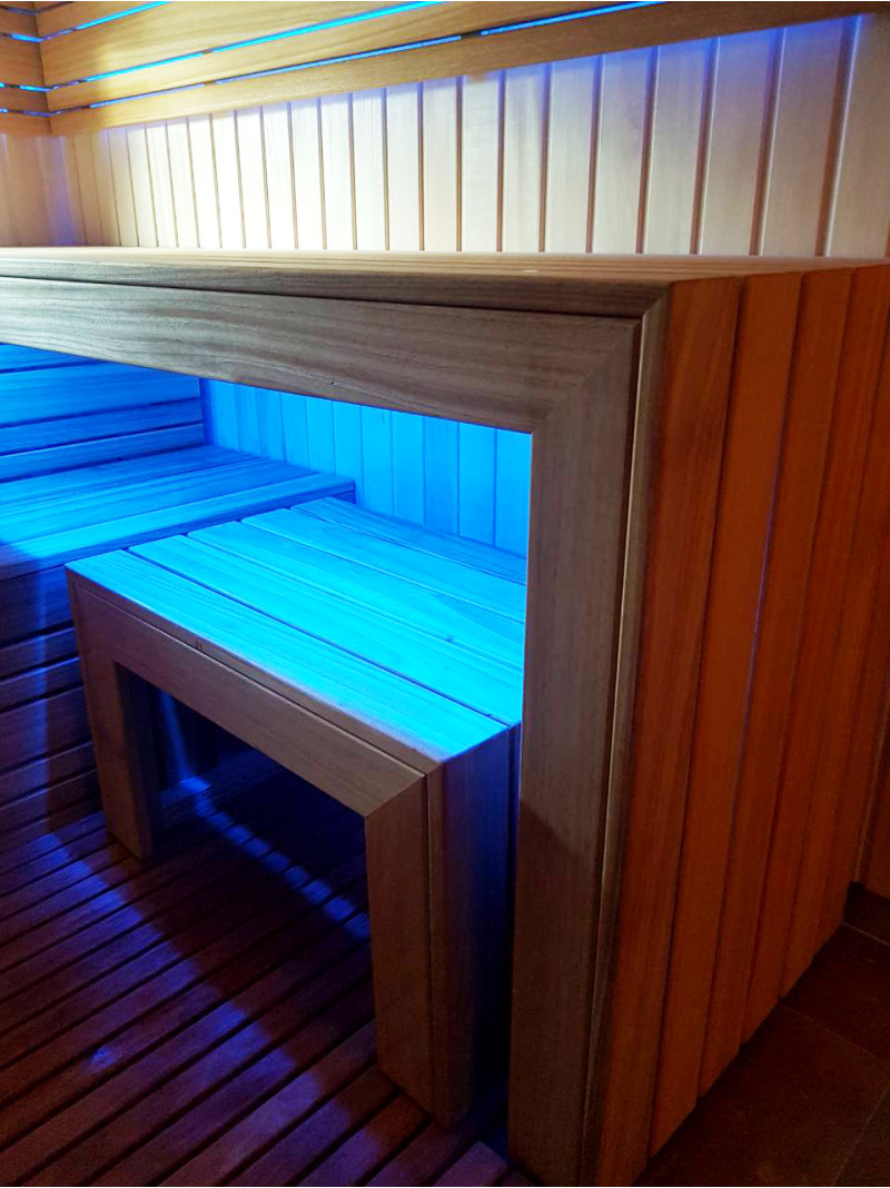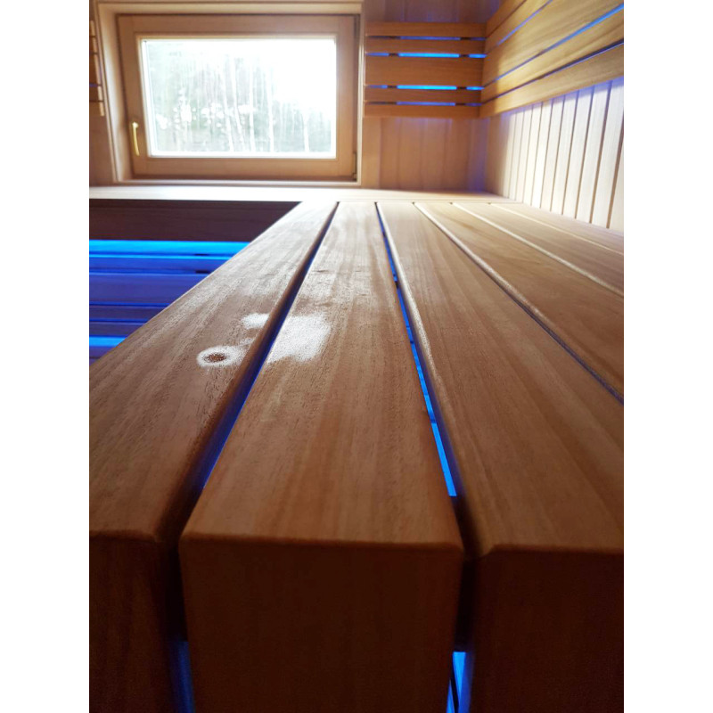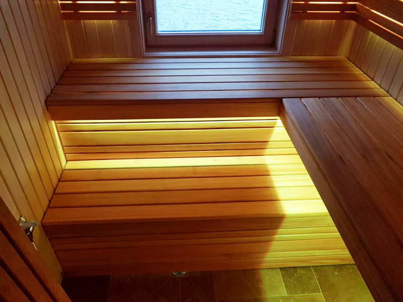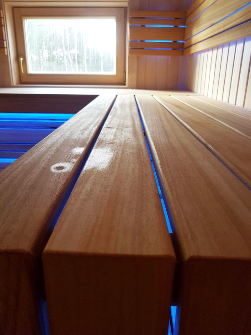 Деревянные детали интерьера и скамейки сауны выполнены из африканского дерева абачи. Благодаря своей структуре эта древесина мягкая и мало нагревается, что делает ее очень подходящей для установки скамеек для саун.
