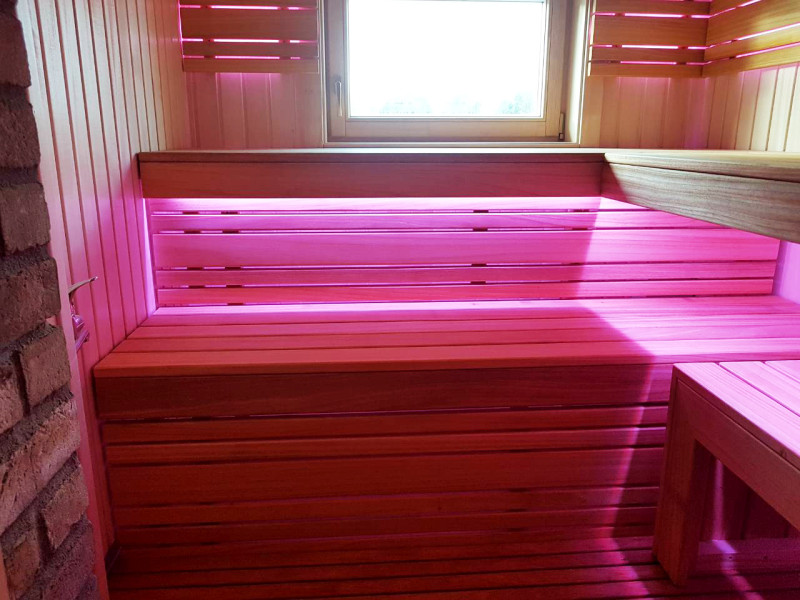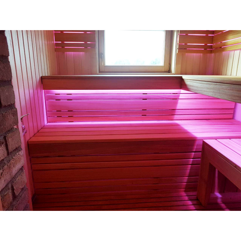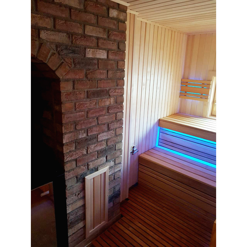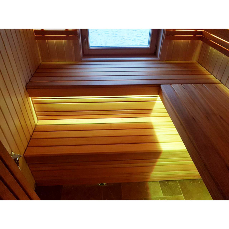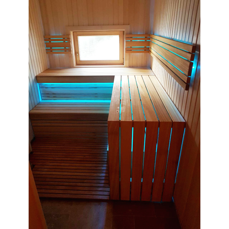 Деревянные детали интерьера и скамейки сауны выполнены из африканского дерева абачи. Благодаря своей структуре эта древесина мягкая и мало нагревается, что делает ее очень подходящей для установки скамеек для саун.