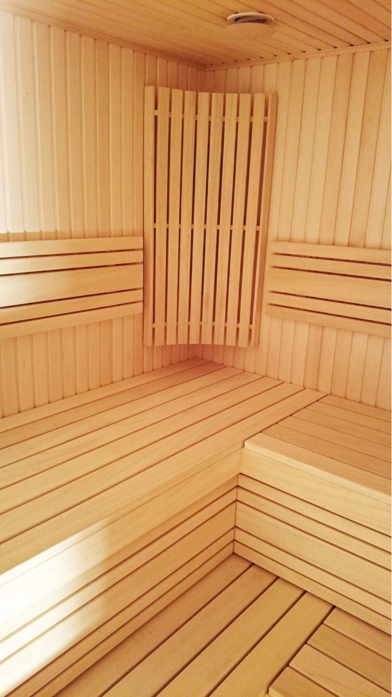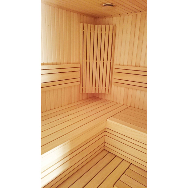 Потолки и стены сауны облицованы липовым сайдингом, а также опоры, напольные решетки и ограждения каменки. Шезлонги для сауны изготовлены из дерева абачи высшего качества. Древесина для кроватей, опор и стен пропитана и покрыта лаком, смазана маслом - специально подготовлена для использования в условиях жары и влажности.