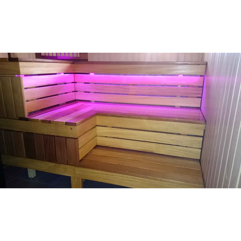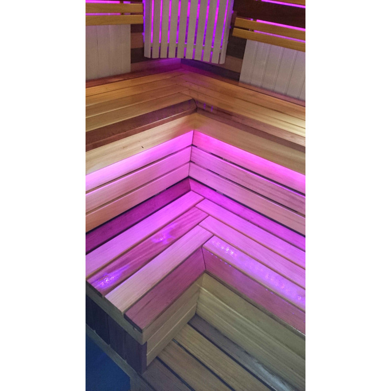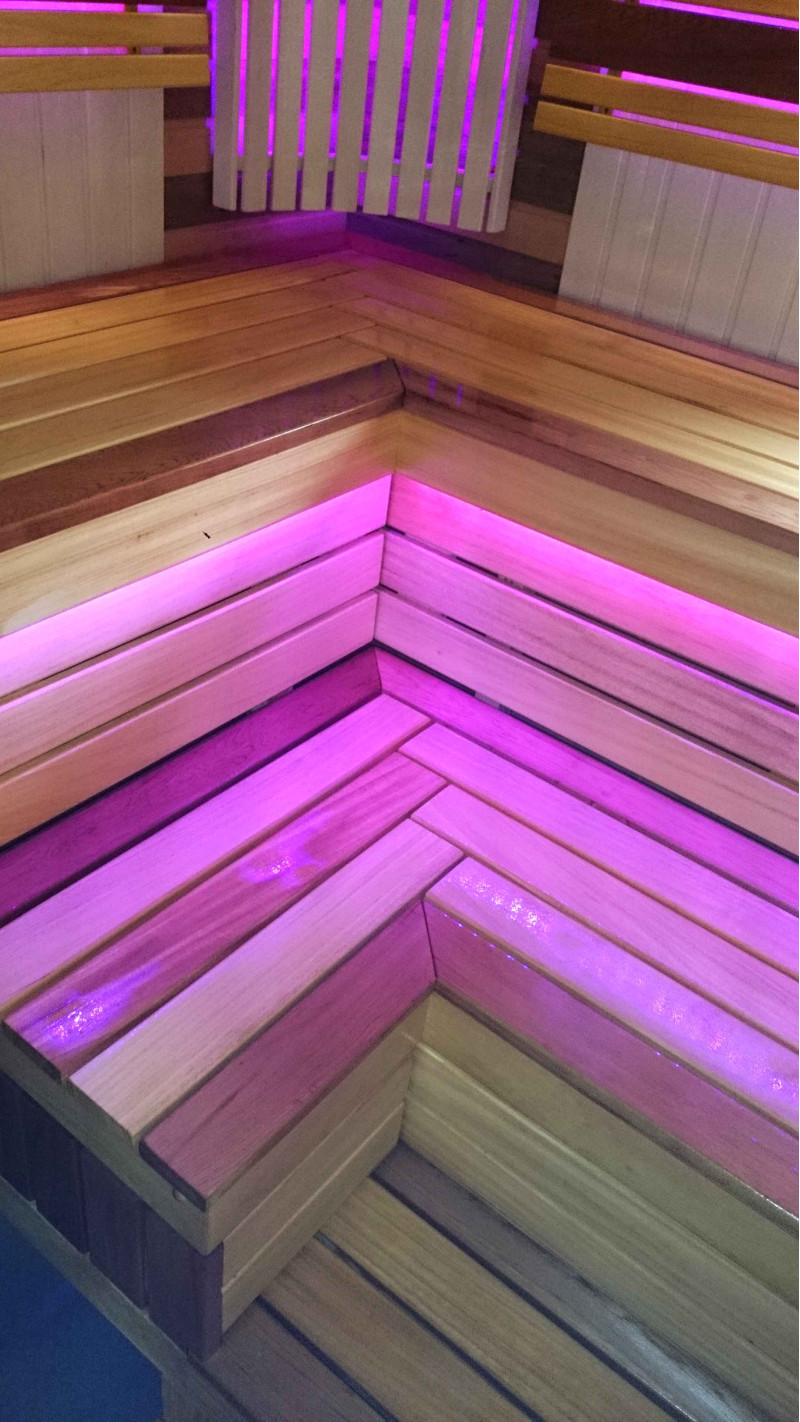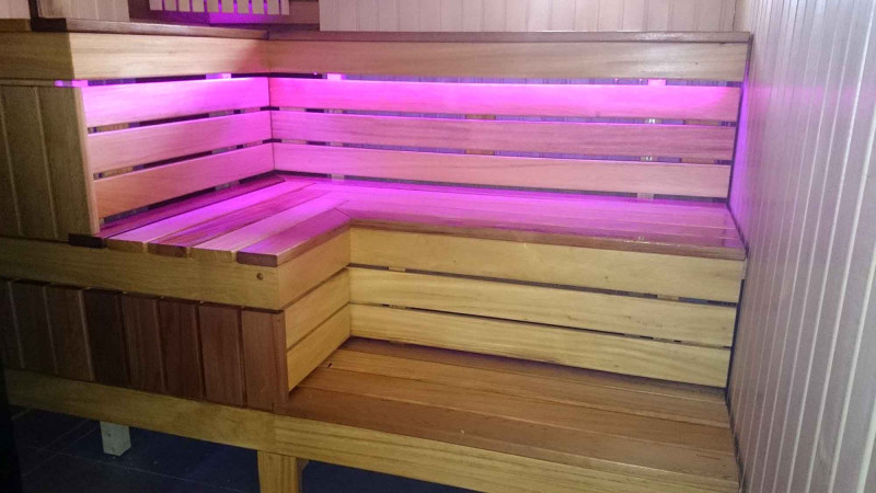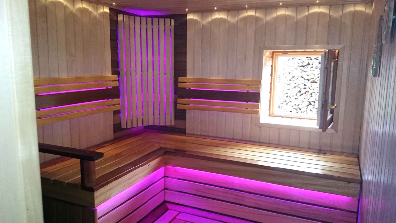 Сауна оборудована системой вентиляции. Цветное освещение установлено под скамейками и за спинками, создавая уютную, успокаивающую обстановку. Подвесной светильник Harvia с деревянной крышкой абачи. Термометр и гигрометр Harvia, две шкалы.