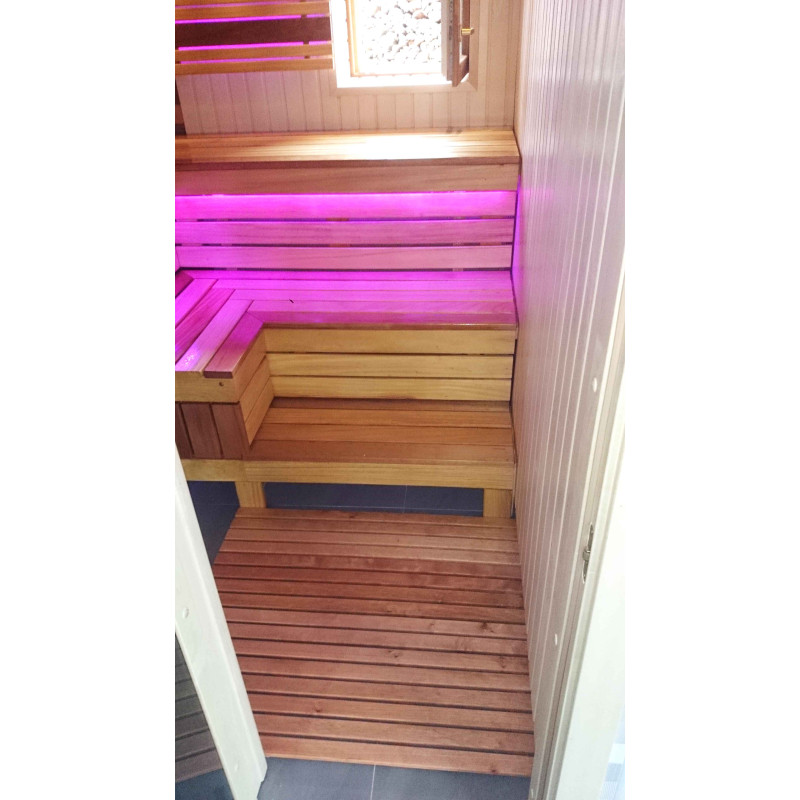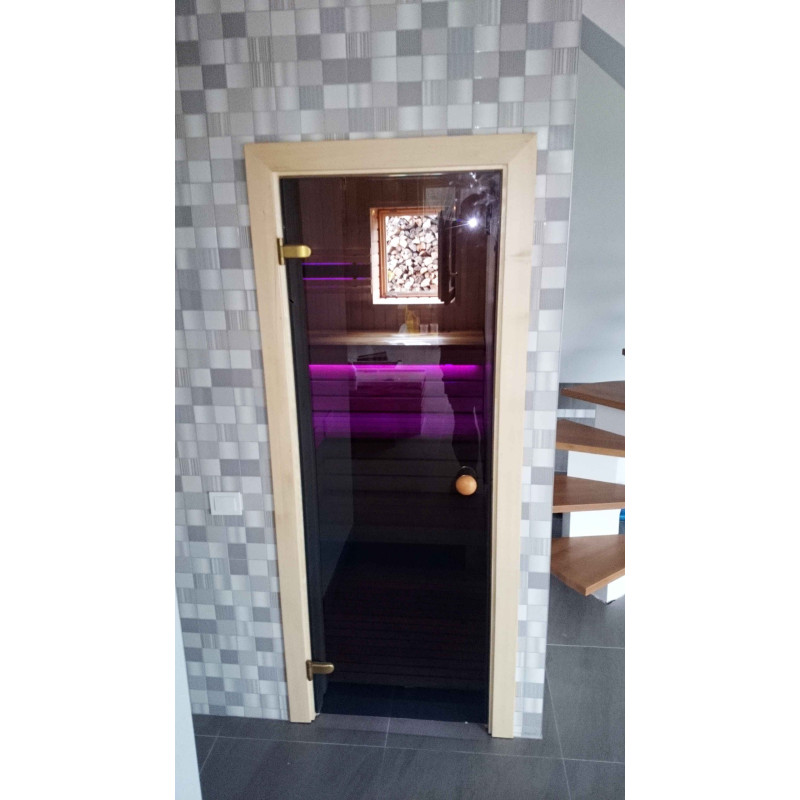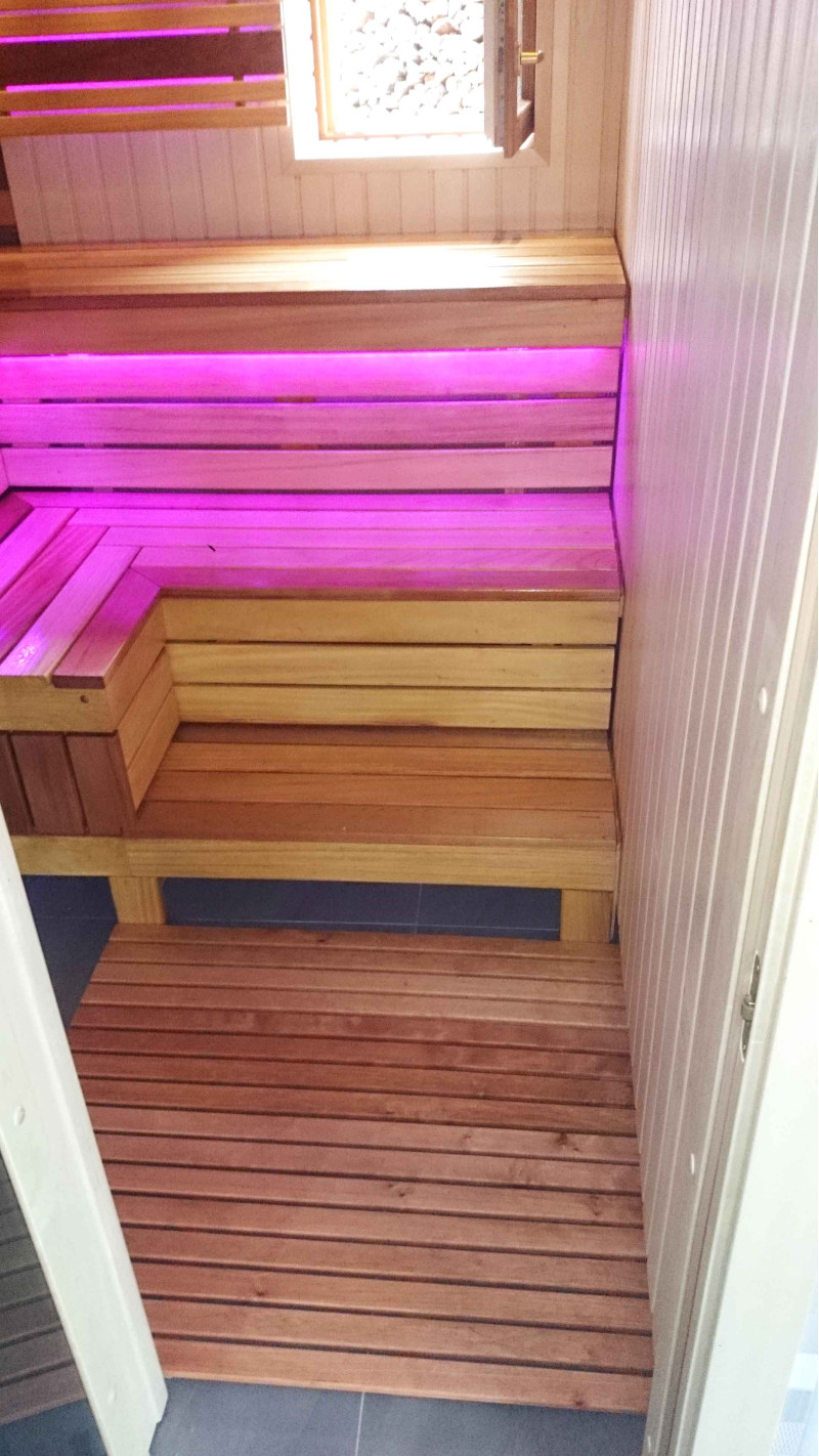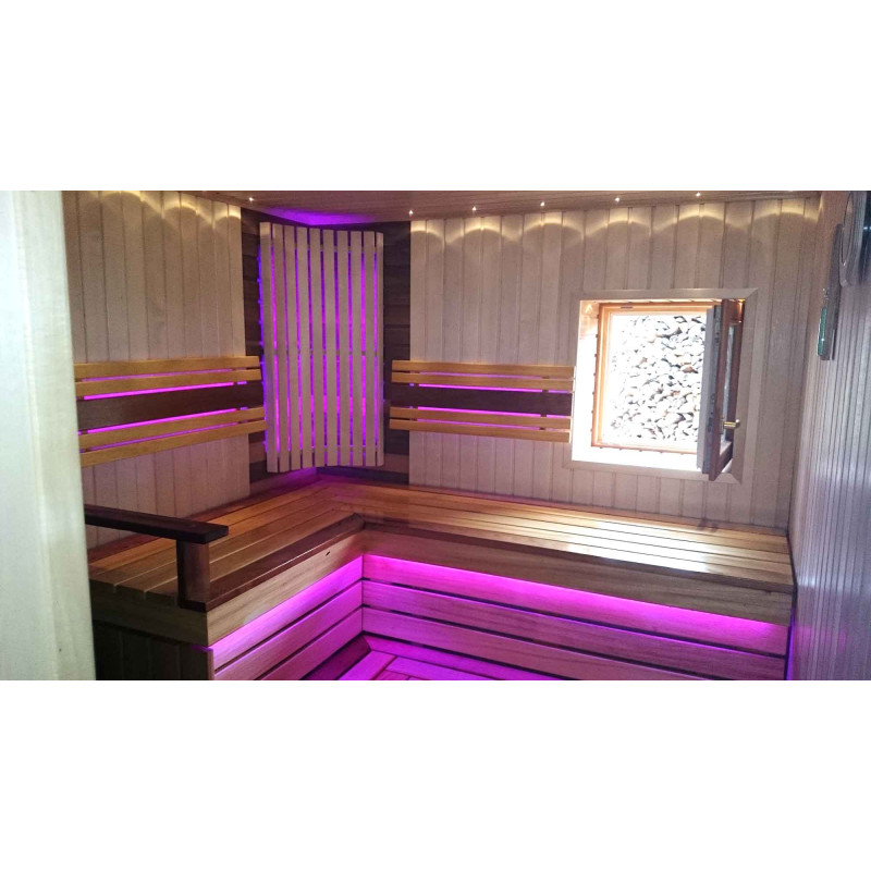 Скамейки для сауны и абажур-бахрест изготовлены из африканских досок абачи. Эта качественная древесина меньше всего нагревается, поэтому ее приятно трогать в сауне. Стены и потолок выполнены из сосновой древесины. Окно в сауне поддерживает поток естественного света, расширяет пространство и создает связь с природой. Оконное стекло - закаленное, термостойкое, бронзовое стекло.