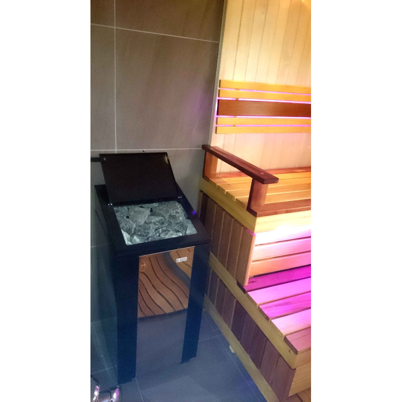 Для сауны подобрана очень качественная, аккумулирующая тепло, дровяная каменка Narvi Steam Master WT объемом 10-130 м3. Вмещает очень большое количество камней - 100 кг. Производит много приятного и качественного пара.