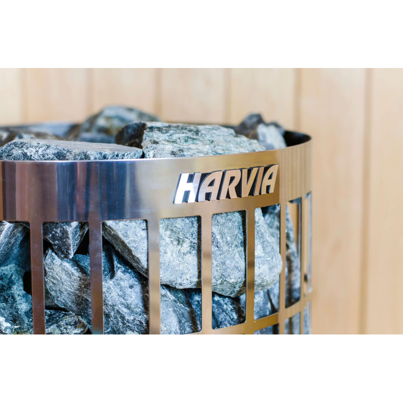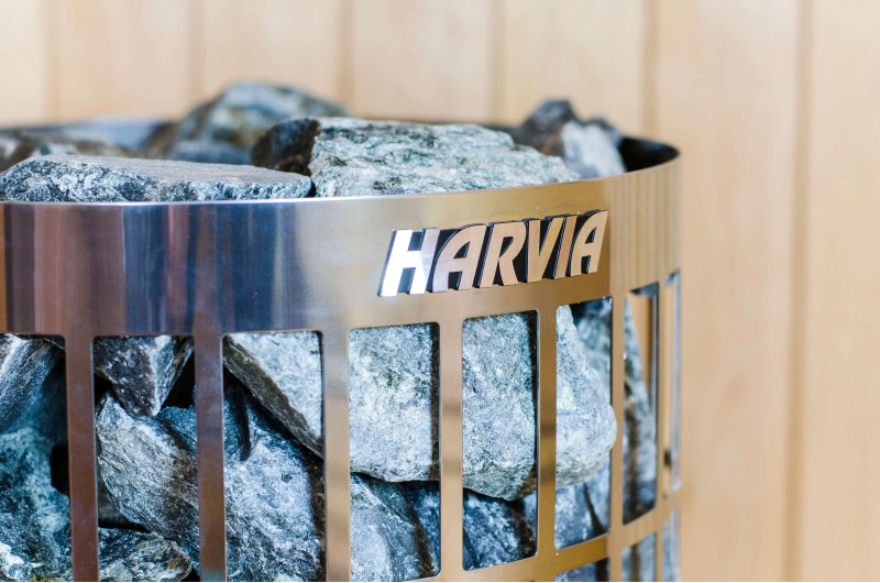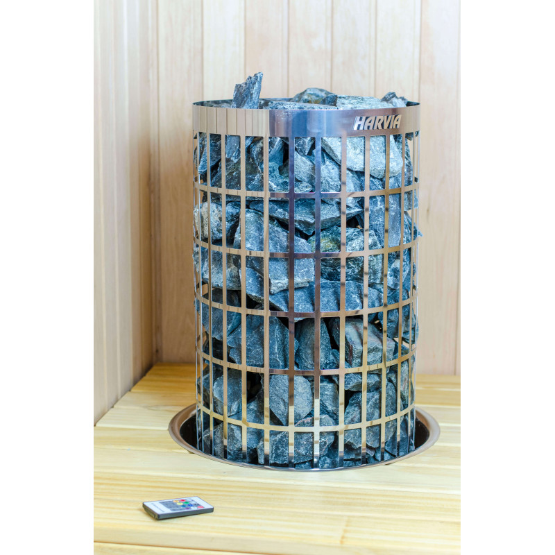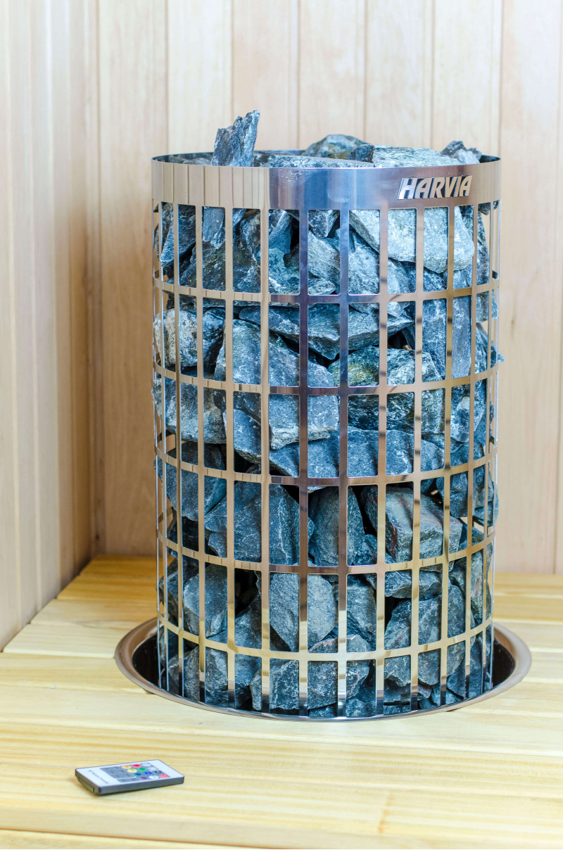 Утеплитель - Harvia Cilindro с отделочным кольцом и наполнен камнями габбро-диабаз. Двери - закаленное бронзовое стекло с рамой из черной ольхи.