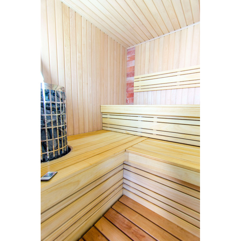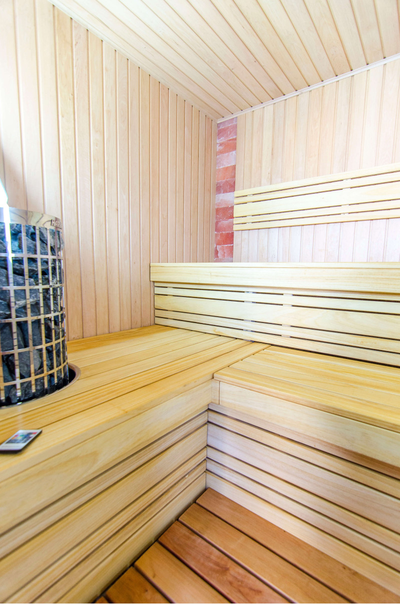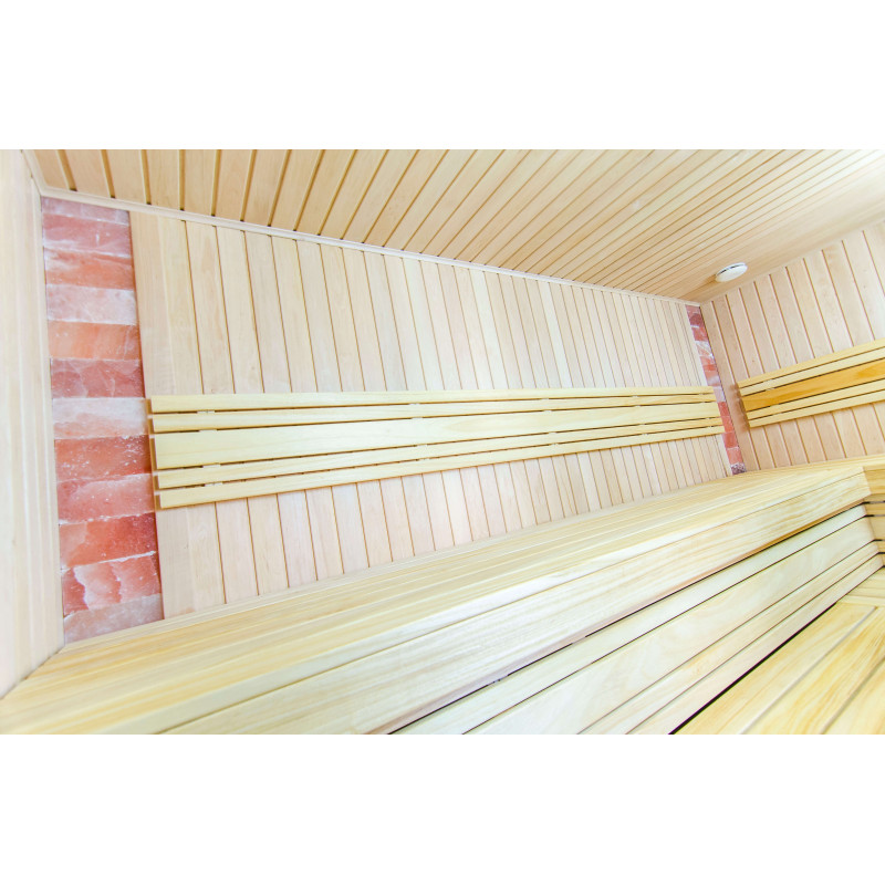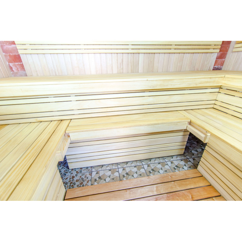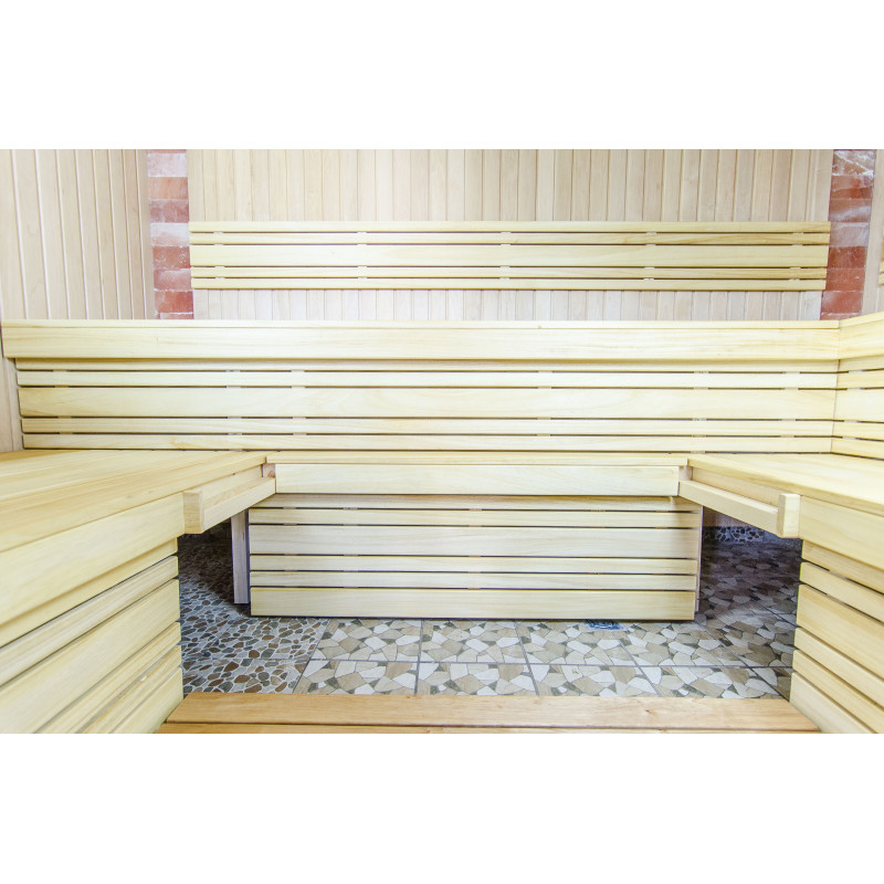 Скамейки, спинки, потолки, стены - из африканского ненагревающего дерева абачи высокого класса, напольные решетки - из черной ольхи. Спинки и за камнями из гималайской соли оснащены встроенной цветной RGB-подсветкой, управляемой беспроводной консолью, меняющей цвет, которая подчеркивает характерный вид гималайской соли.