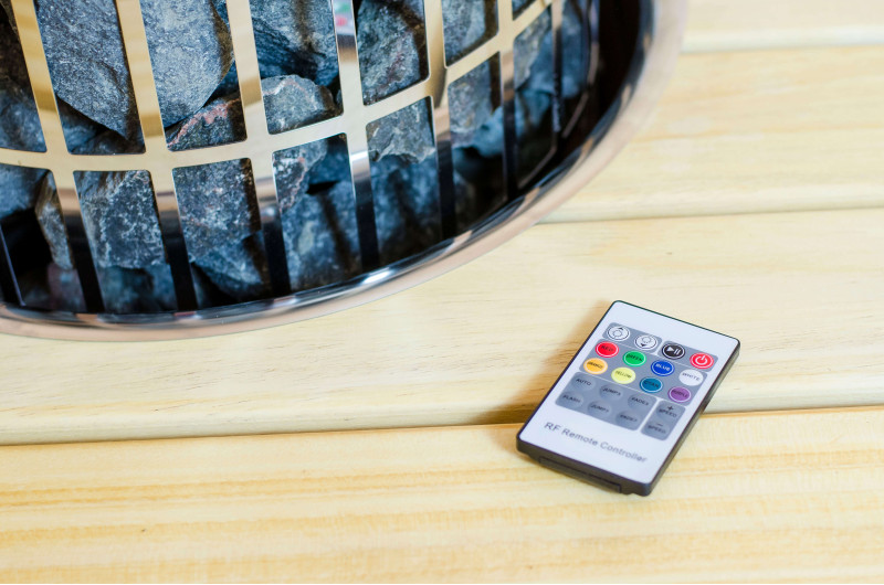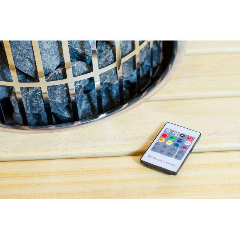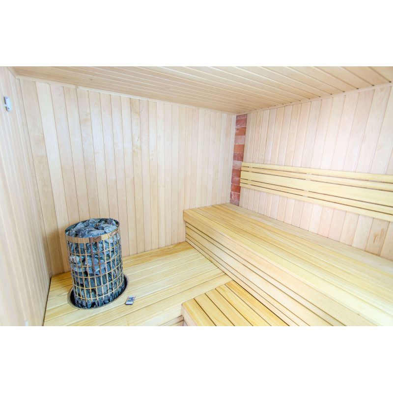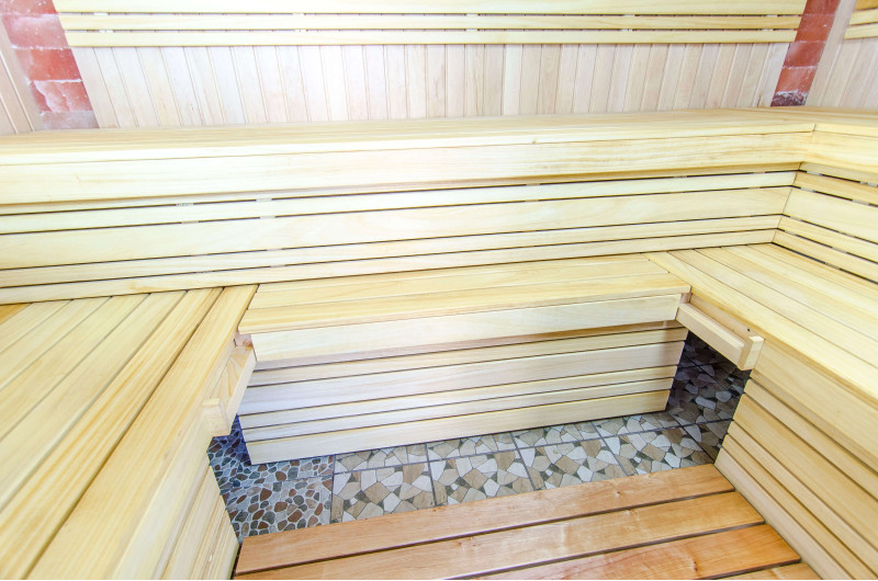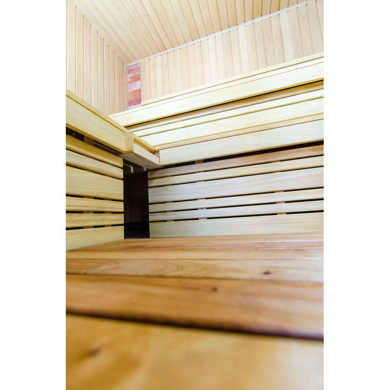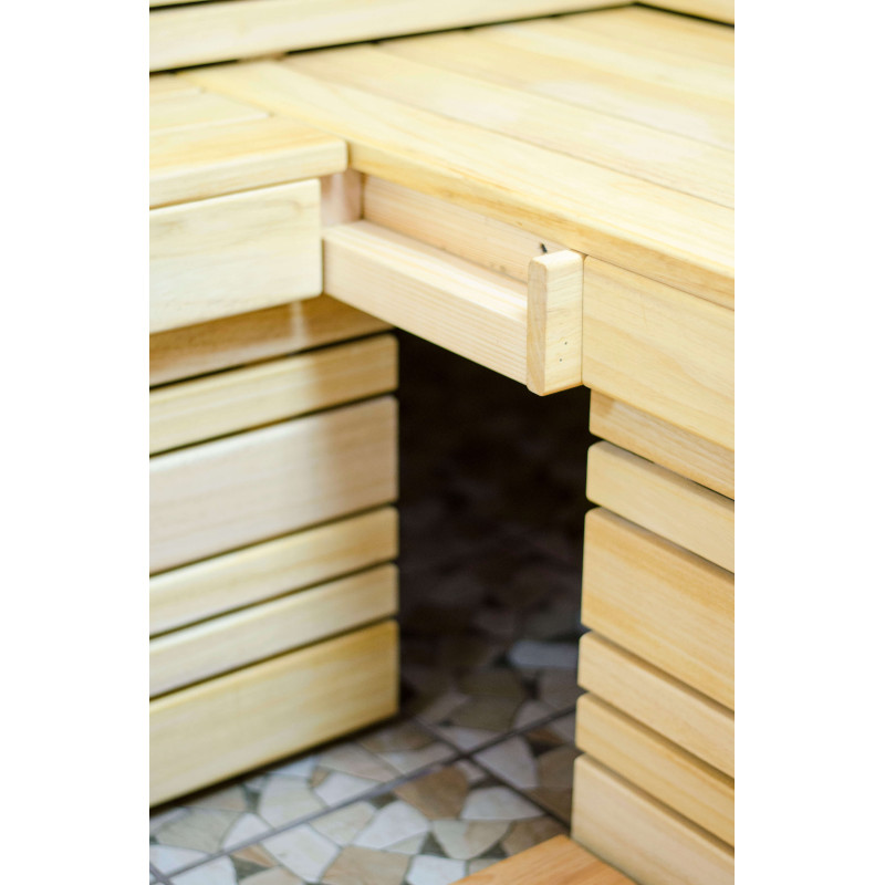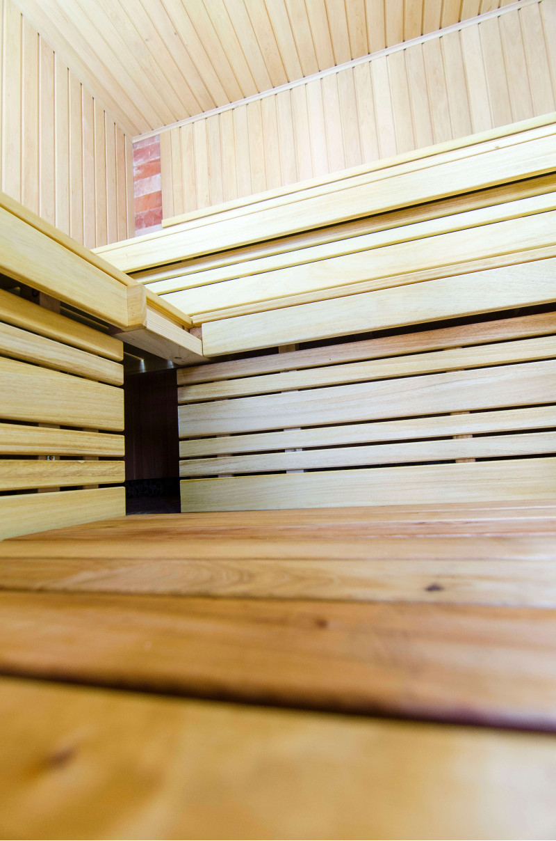 Скамейки, спинки, потолки, стены - из африканского ненагревающего дерева абачи высокого класса, напольные решетки - из черной ольхи. Спинки и за камнями из гималайской соли оснащены встроенной цветной RGB-подсветкой, управляемой беспроводной консолью, меняющей цвет, которая подчеркивает характерный вид гималайской соли.