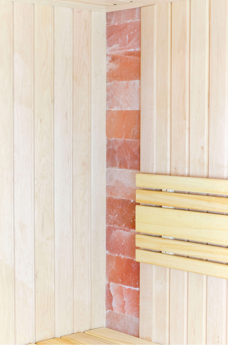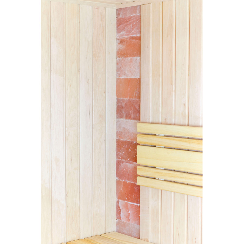 Кирпичи из гималайской соли, выбранные для украшения сауны со встроенным освещением, создают уютную атмосферу и еще больше усиливают эффект сауны. Камни из гималайской соли - это естественный ионизатор, который эффективно улучшает качество воздуха, выделяя отрицательные ионы. Отрицательно ионизированный воздух улучшает здоровье, помогает лечить многие недуги, такие как: бронхиальная астма, заболевания легких и бронхов, постинфарктные заболевания, гипертония, язвы желудочно-кишечного тракта, гастриты, заболевания щитовидной железы, дерматиты, различные аллергии, нервные заболевания, помогает преодолеть инсульт. Польза от процедур в такой сауне будет двоякой.