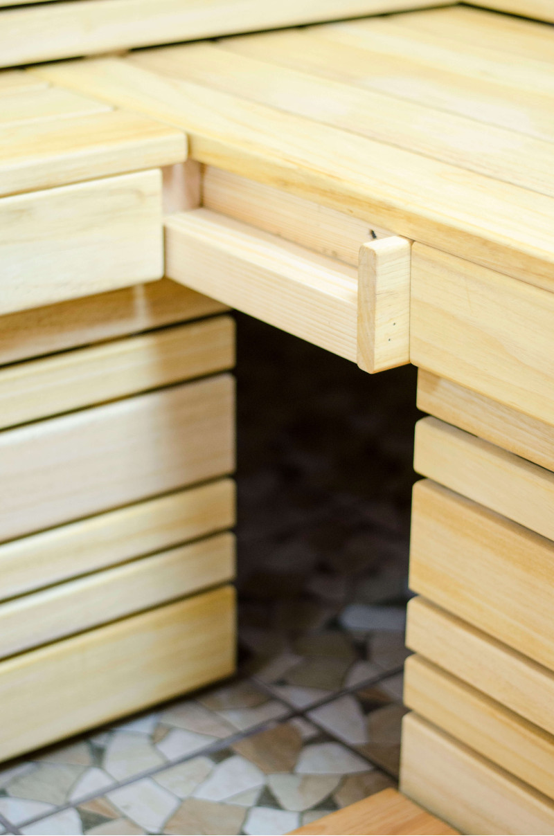 Самым большим преимуществом этой сауны является выдвижная нижняя скамья для комфортного купания. По желанию заказчика были разработаны шезлонги достаточной ширины и нужной высоты, позволяющие комфортно стоять на ногах. Во время купания лежак превращается в зону отдыха. На широком лежаке купаться намного удобнее, так как можно поставить ноги там, где теплее.