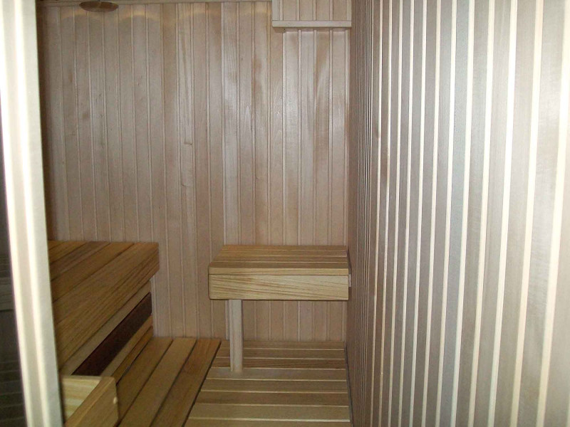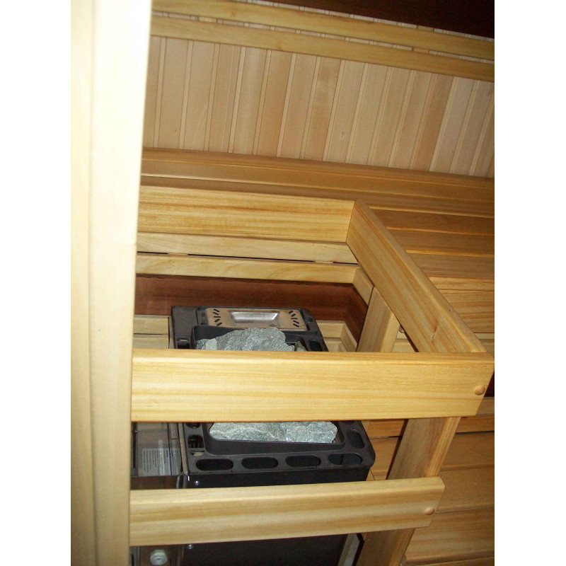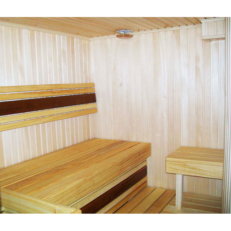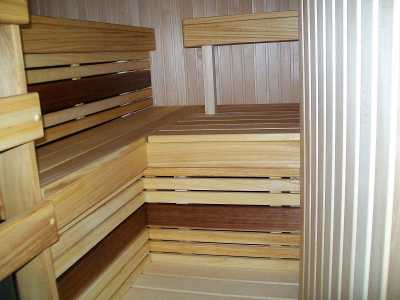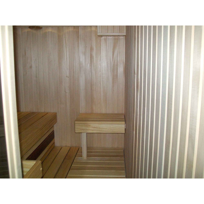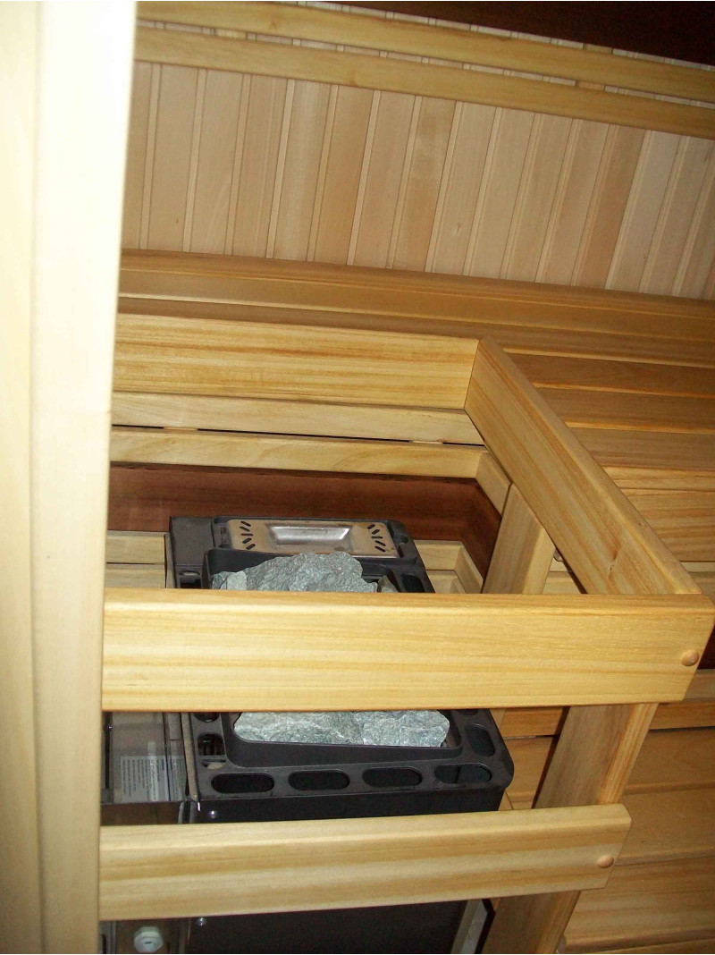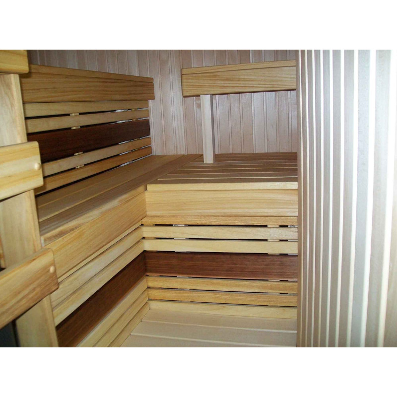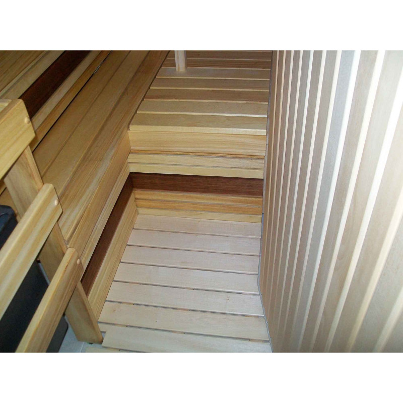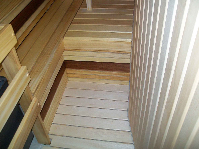 Для монтажа потолка и стен сауны используется липовый сайдинг толщиной 15 мм - стильный, легкий, источающий приятный запах дерева. Для скамей и спинок были выбраны кедр и абачи высочайшего качества. Это дерево высокого качества, не только красиво выглядит, но и наименее нагревается по сравнению с другими породами дерева, поэтому к таким скамьям приятно и безопасно прикасаться. Напольная решетка - ольха черная.