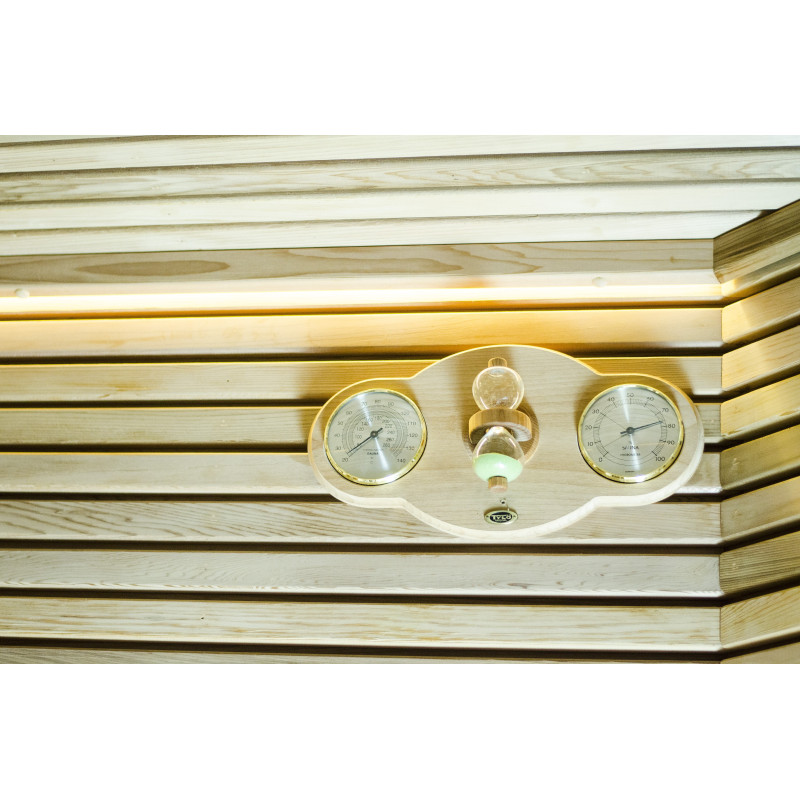 Принадлежности для сауны: набор ведер и ковшей, деревянный градусник с гигрометром и песочные часы.