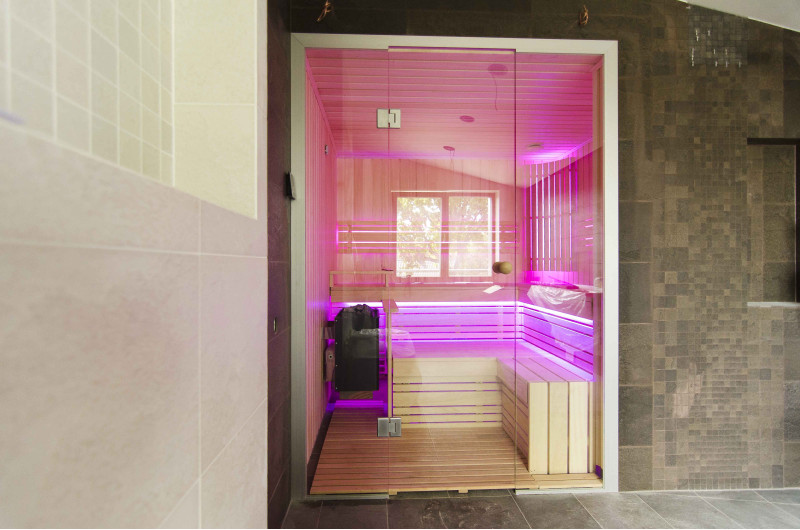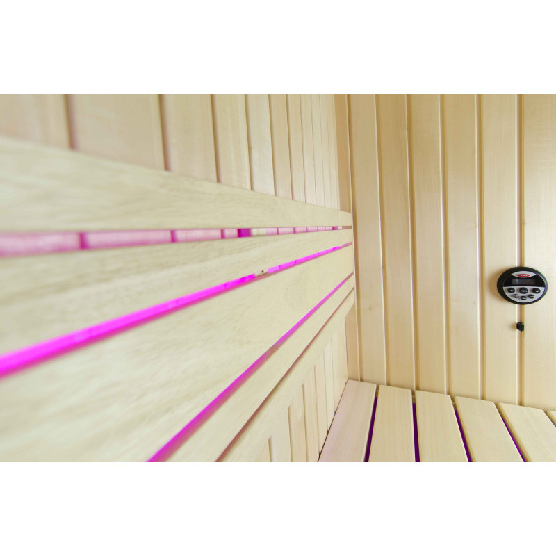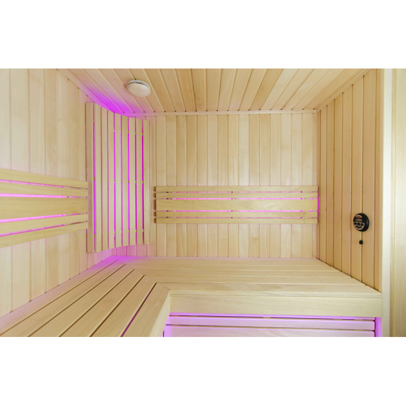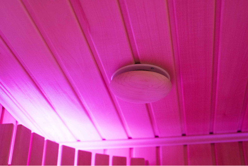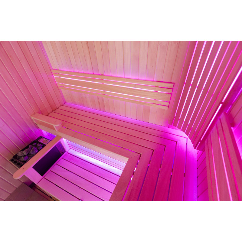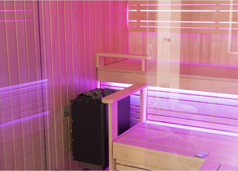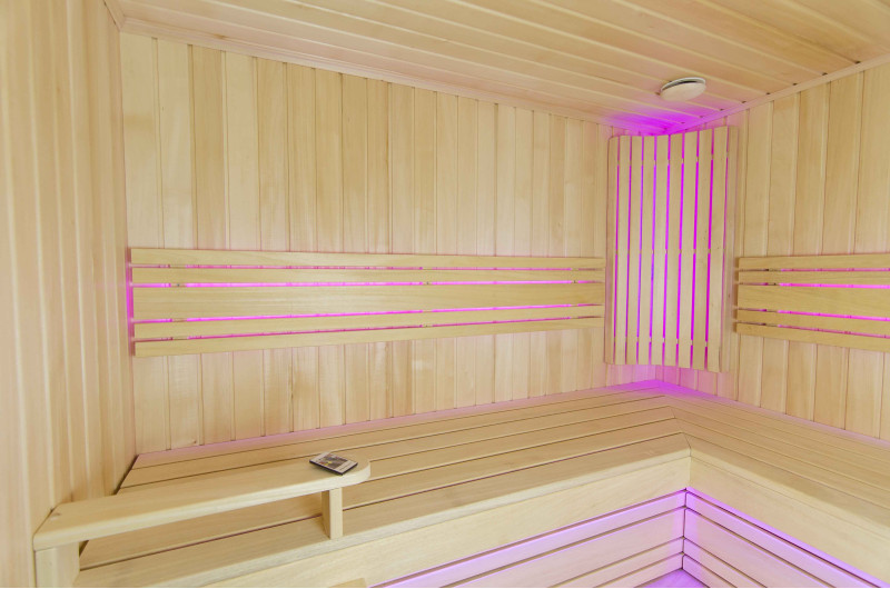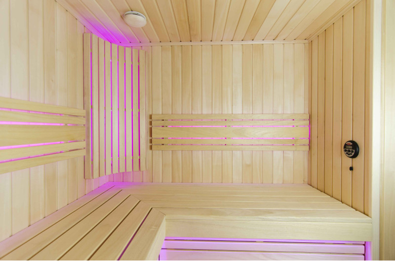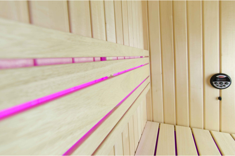 Интерьер сауны выполнен из древесины липы высочайшего качества, шезлонги - из дерева абачи - не нагреваются и идеально подходят для сауны.