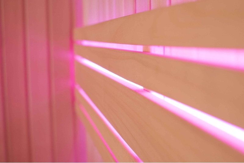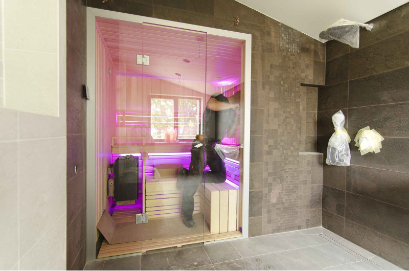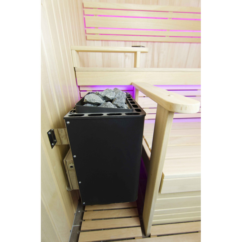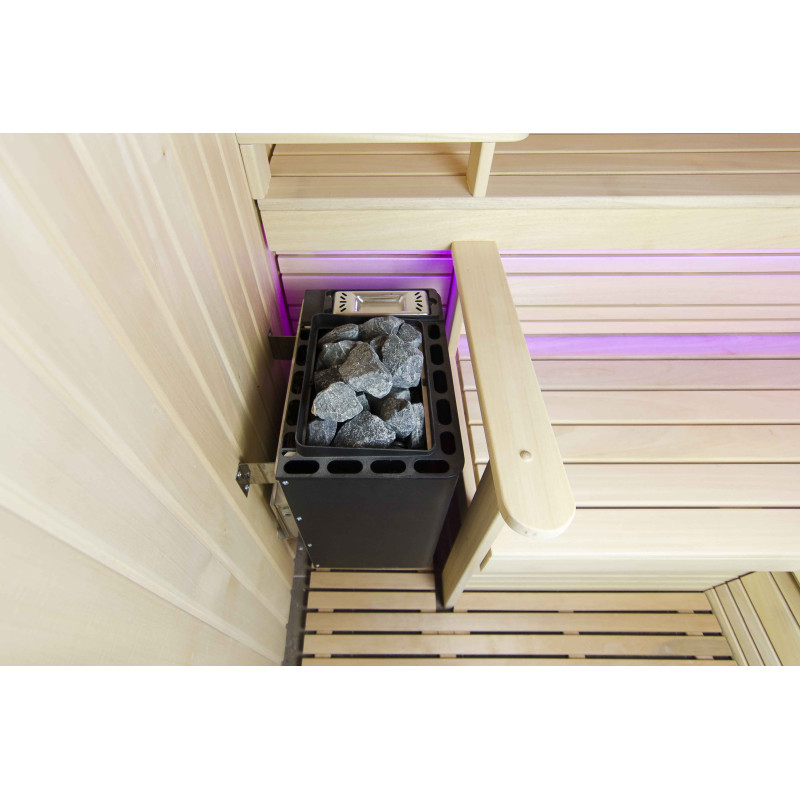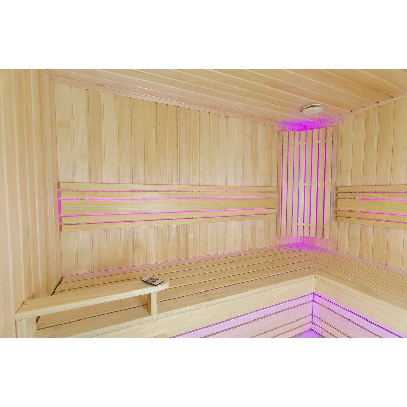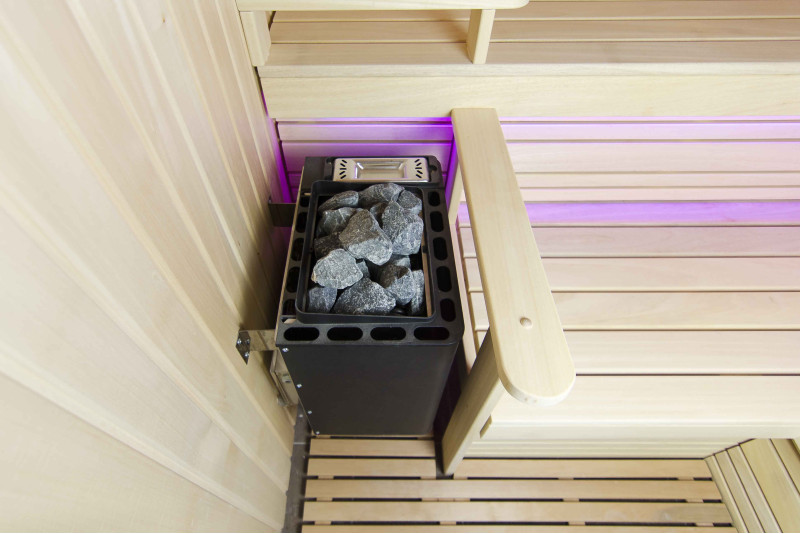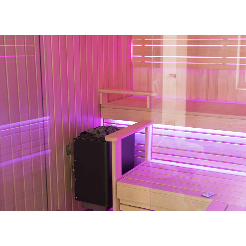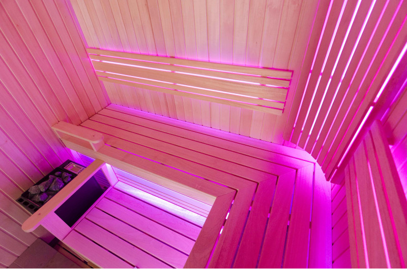 Интерьер сауны выполнен из древесины липы высочайшего качества, шезлонги - из дерева абачи - не нагреваются и идеально подходят для сауны.
