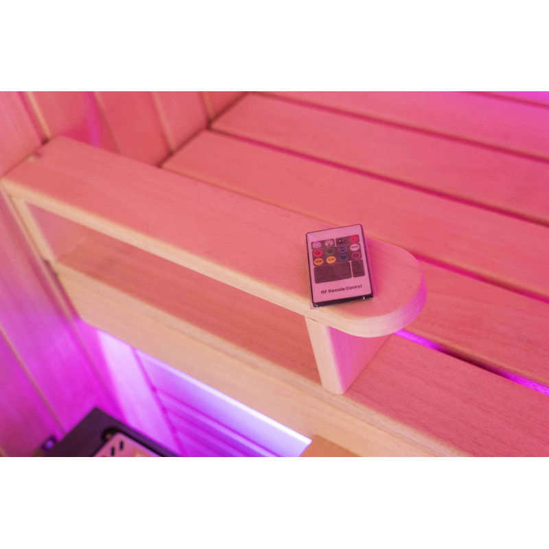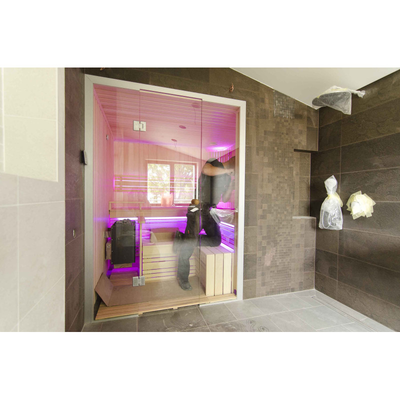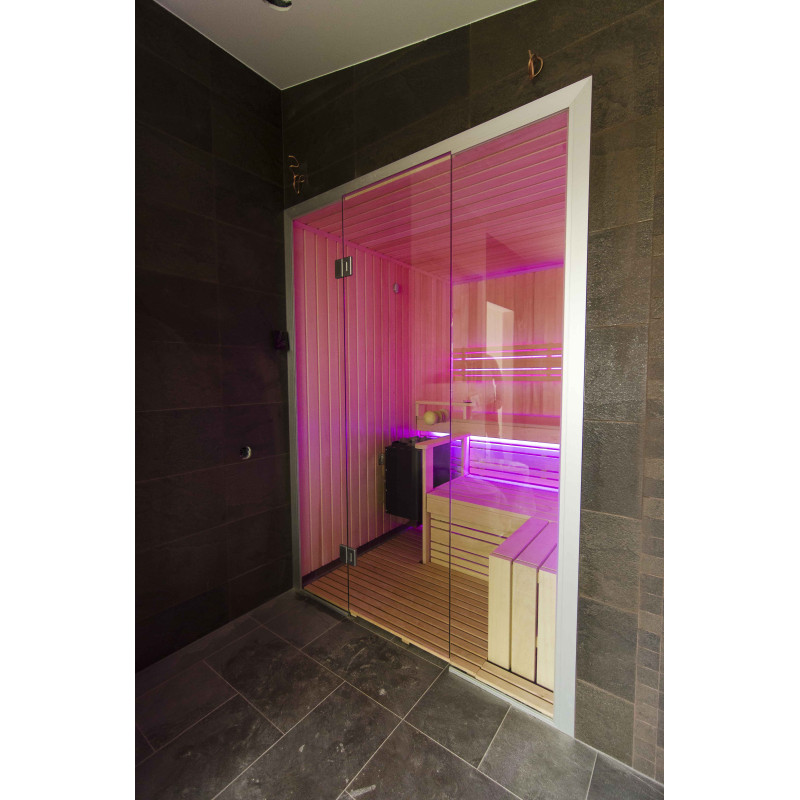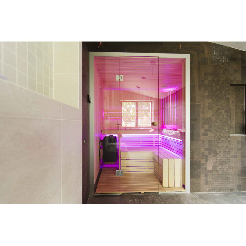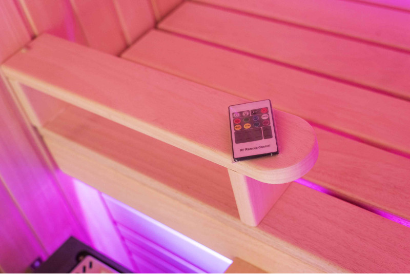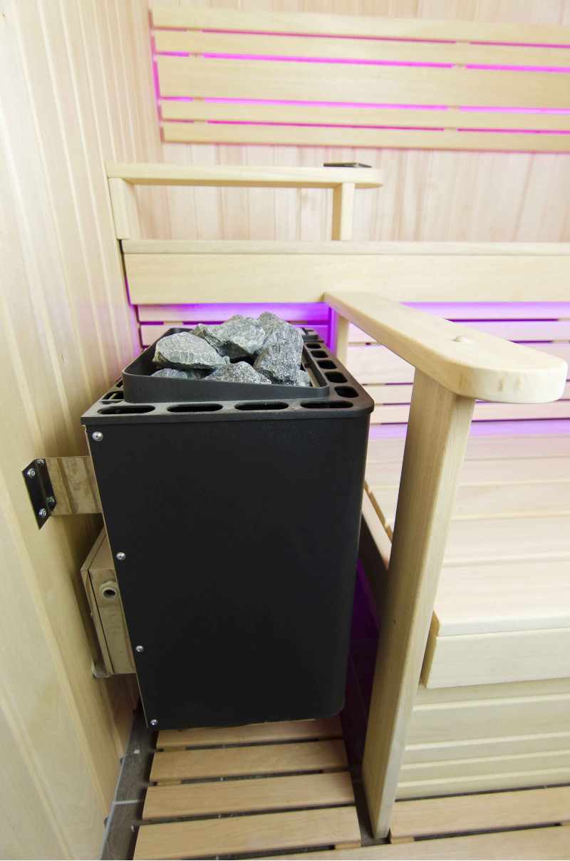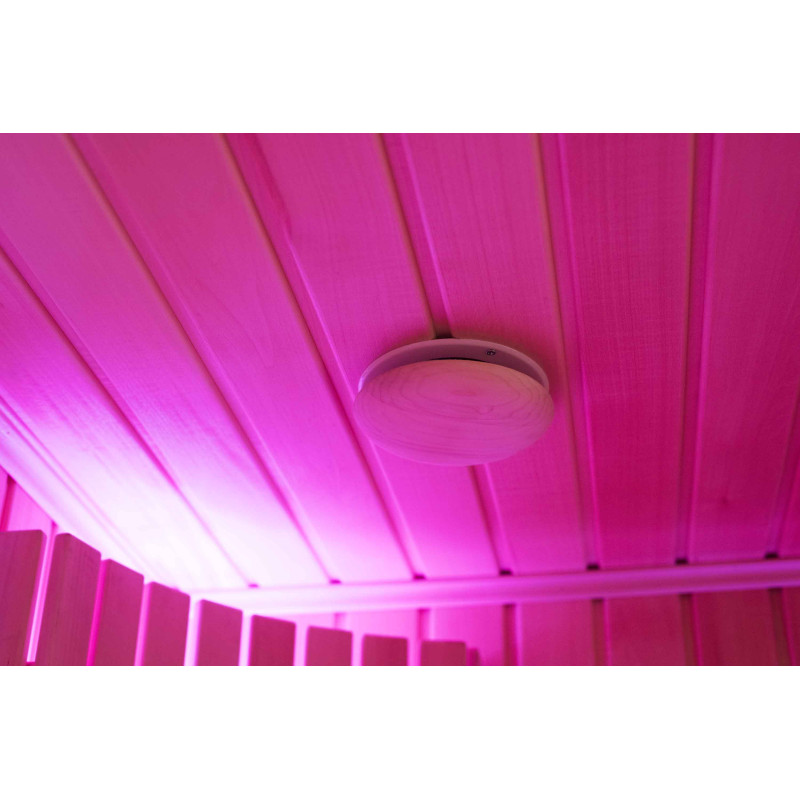 Интерьер сауны выполнен из древесины липы высочайшего качества, шезлонги - из дерева абачи - не нагреваются и идеально подходят для сауны.