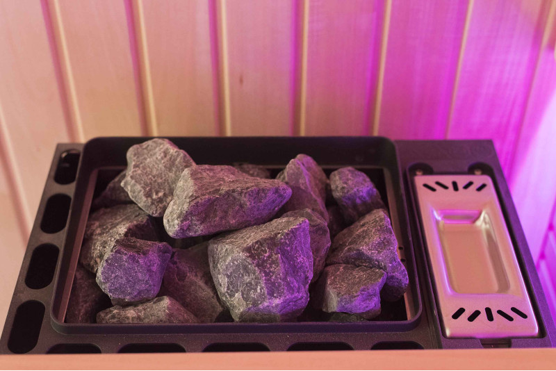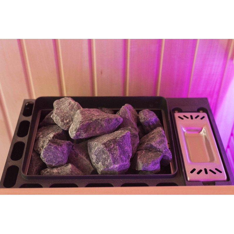 Модель электронагревателя - EOS Bi-O Thermat с парогенератором. Каменка вешается на стену и управляется отдельной панелью управления - Harvia Xenio Combi.