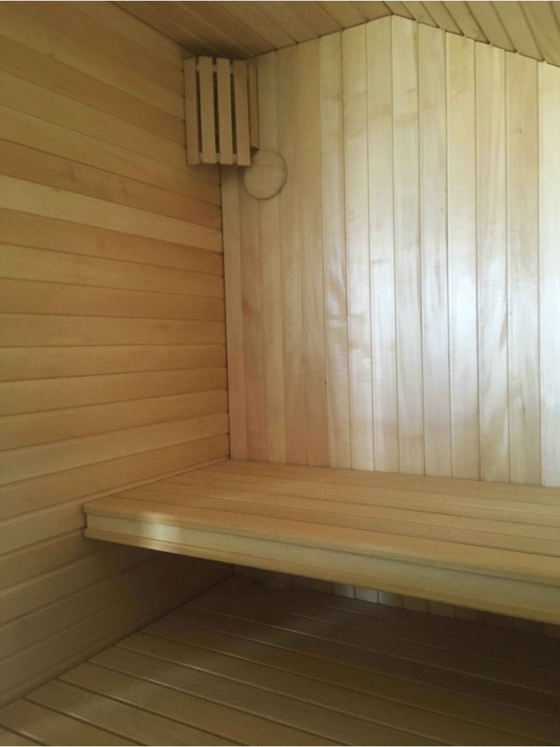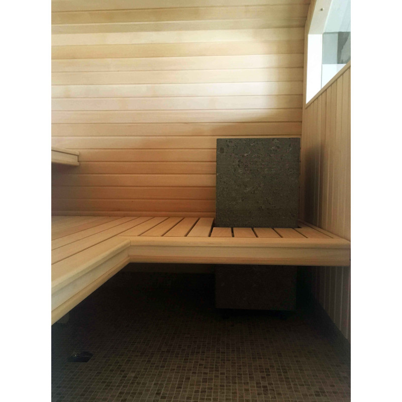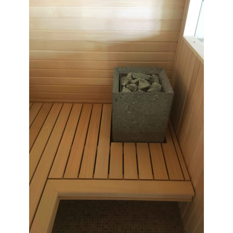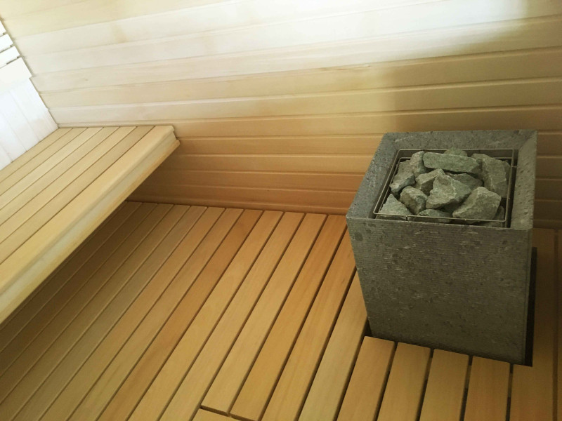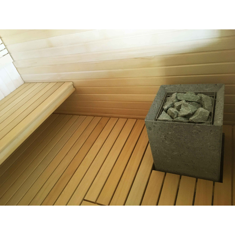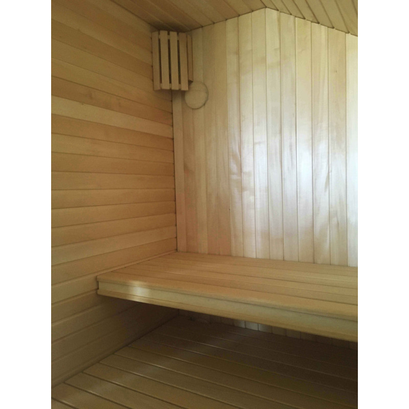 Стены и потолок сауны выполнены из древесины липы. Липовый сайдинг придает сауне больше света и излучает приятный запах дерева. Для скамеек, спинок и ограждения каменки была выбрана качественная обшивка из дерева абачи. Эта мягкая и неотапливаемая древесина - отличный выбор для скамей, опор, где древесина касается кожи, не обжигая ее. Это обеспечивает комфорт и отличный отдых в сауне. Скамейки, опоры и стены покрыты лаком, полностью подготовлены к длительной эксплуатации.