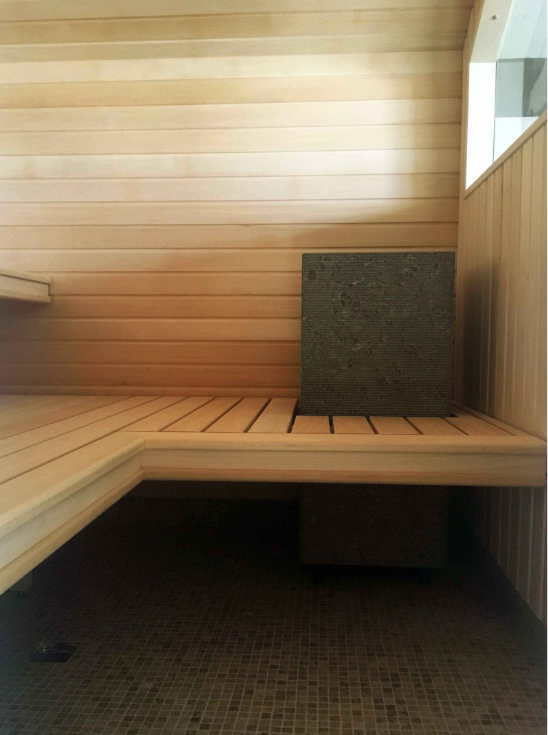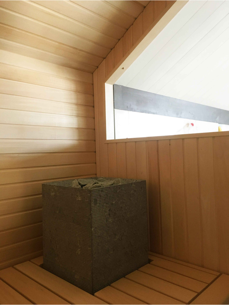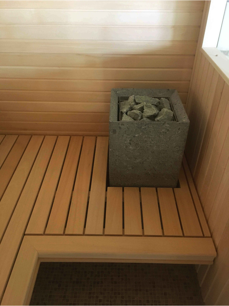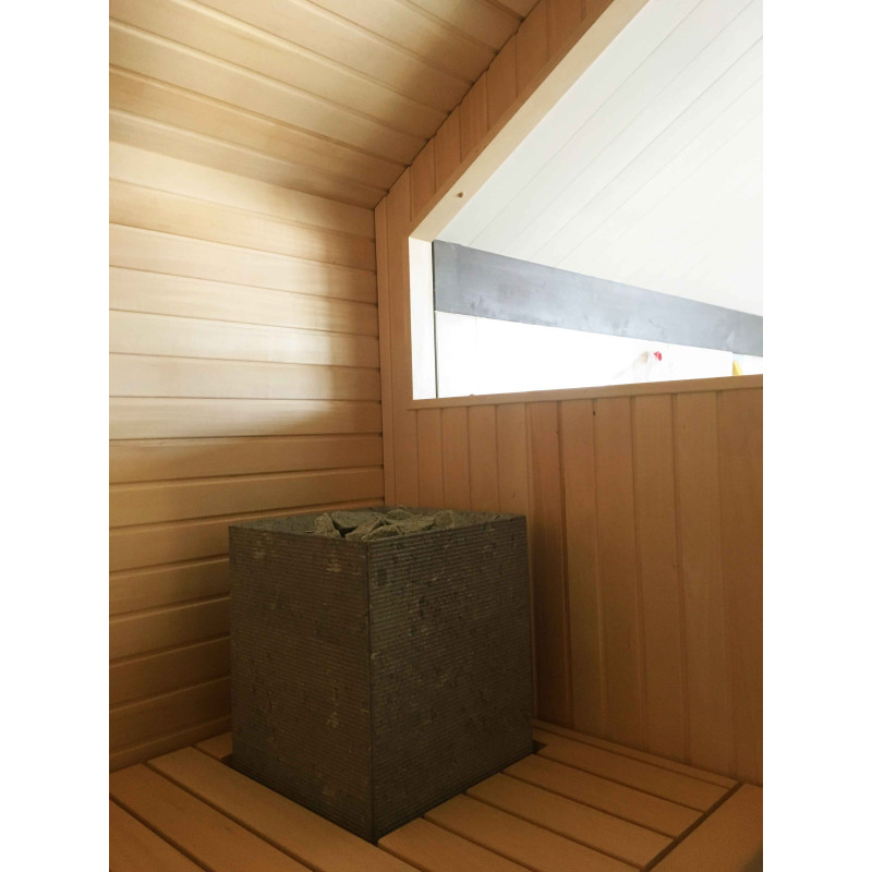Стены и потолок сауны выполнены из древесины липы. Липовый сайдинг придает сауне больше света и излучает приятный запах дерева. Для скамеек, спинок и ограждения каменки была выбрана качественная обшивка из дерева абачи. Эта мягкая и неотапливаемая древесина - отличный выбор для скамей, опор, где древесина касается кожи, не обжигая ее. Это обеспечивает комфорт и отличный отдых в сауне. Скамейки, опоры и стены покрыты лаком, полностью подготовлены к длительной эксплуатации.