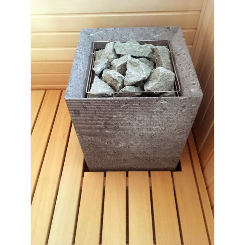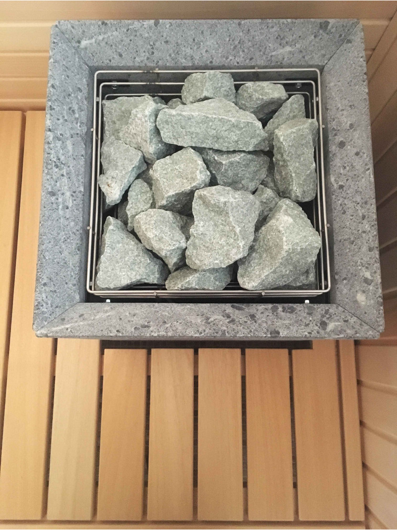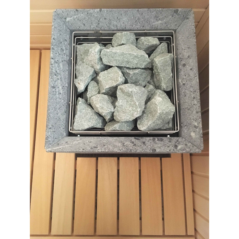 Электрокаменка Туликиви Туйску с отделкой из талькового камня. Управляется дистанционным управлением. Заполнен большим количеством смеси оливин, диабаза и камней жадеита. Благодаря короткому безопасному расстоянию до легковоспламеняющихся поверхностей и сильно ненагреваемой поверхности обогревателя это хороший выбор для семей с детьми и для встраивания обогревателя в скамейки. Энергия, выделяемая жадеитом, обладает лечебными свойствами при многих заболеваниях. Лечебные свойства нагретого жадеита усиливаются. Если полить камень водой, в сауне разносится приятный запах чистой окружающей среды, и в ней легко дышится.