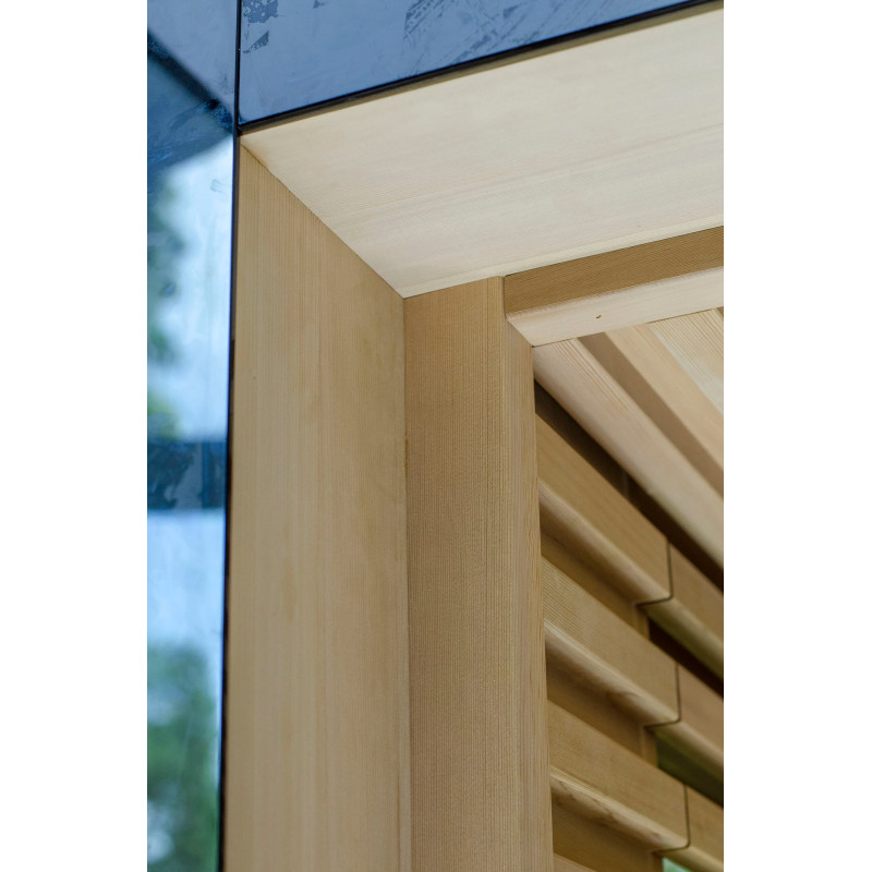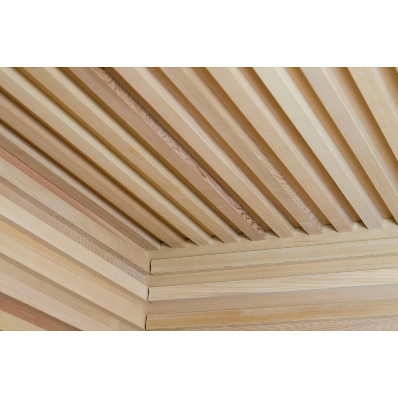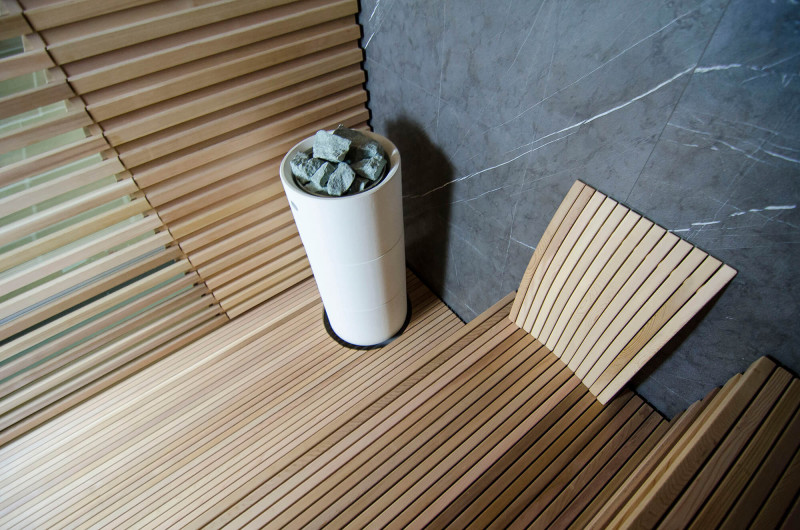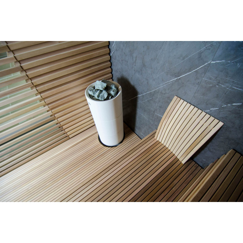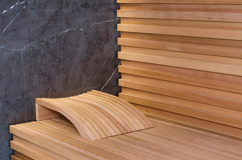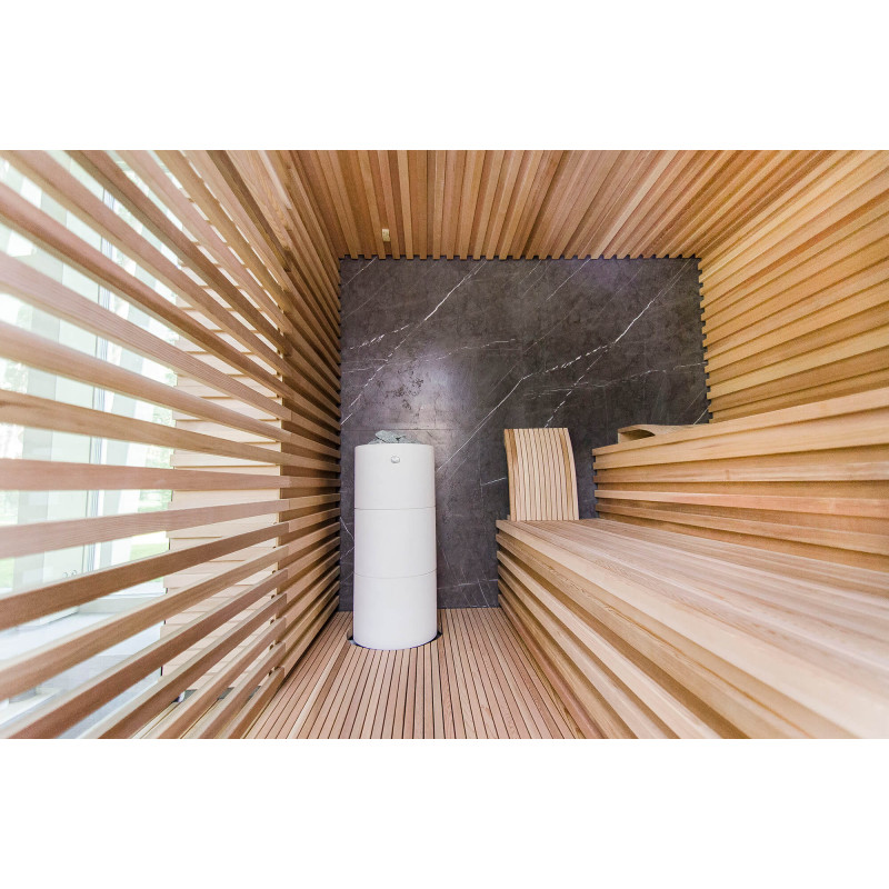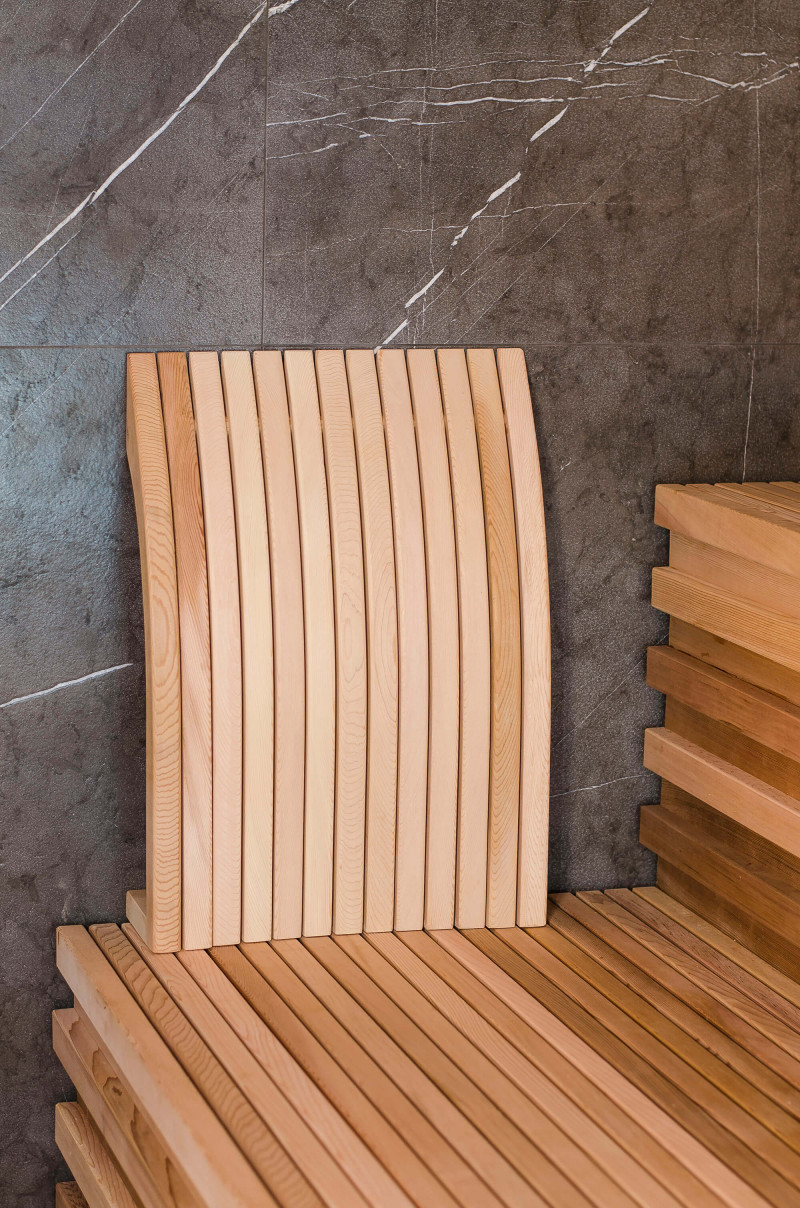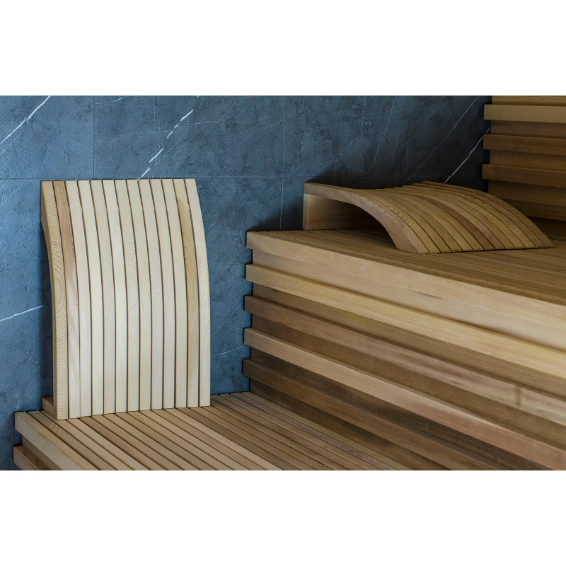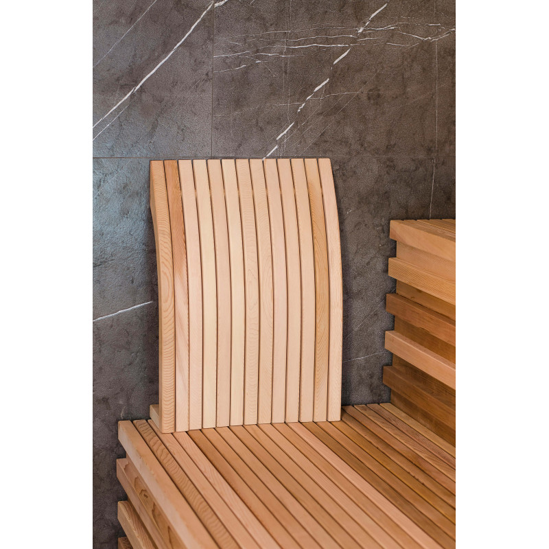 Стены и скамейки сауны изготовлены из кедрового дерева высочайшего качества, изготовлены по индивидуальному профилю. Спинки-подушки - кедр ручной работы. Эта древесина качественная, не нагревается, поэтому к ней безопасно и приятно прикасаться во время посещения сауны.