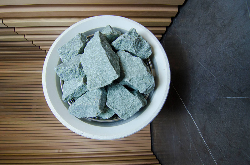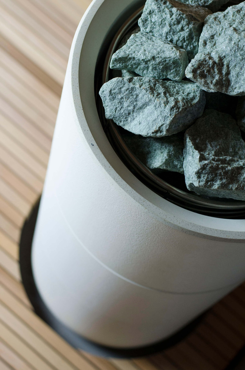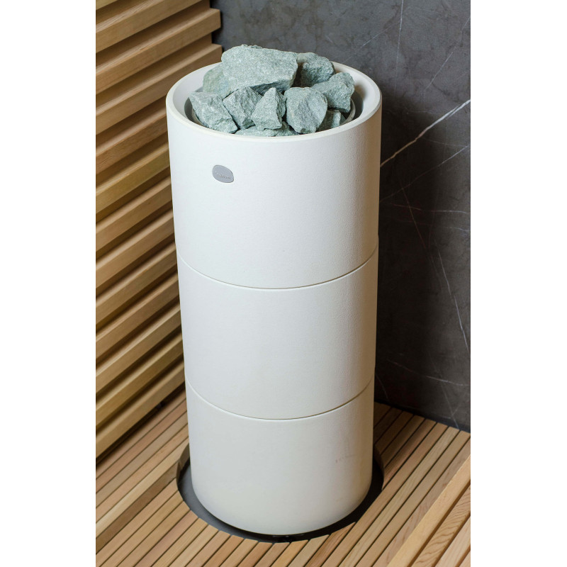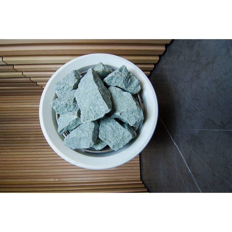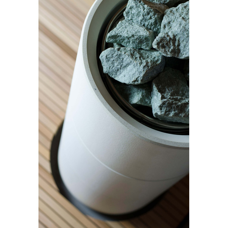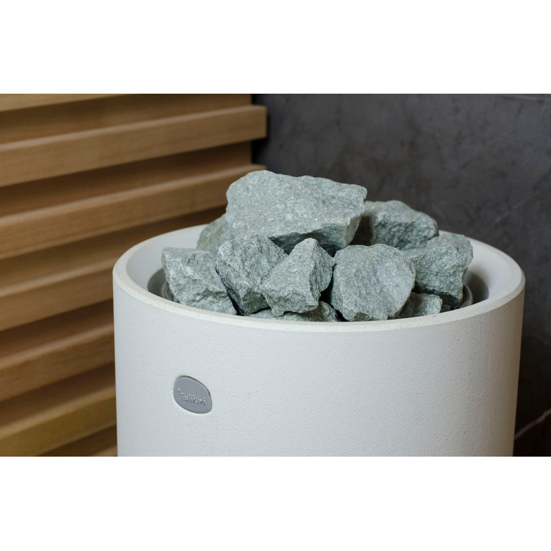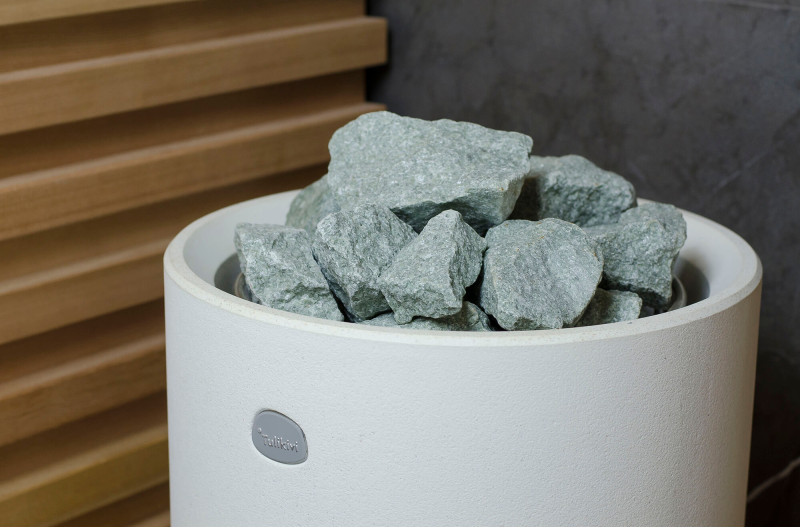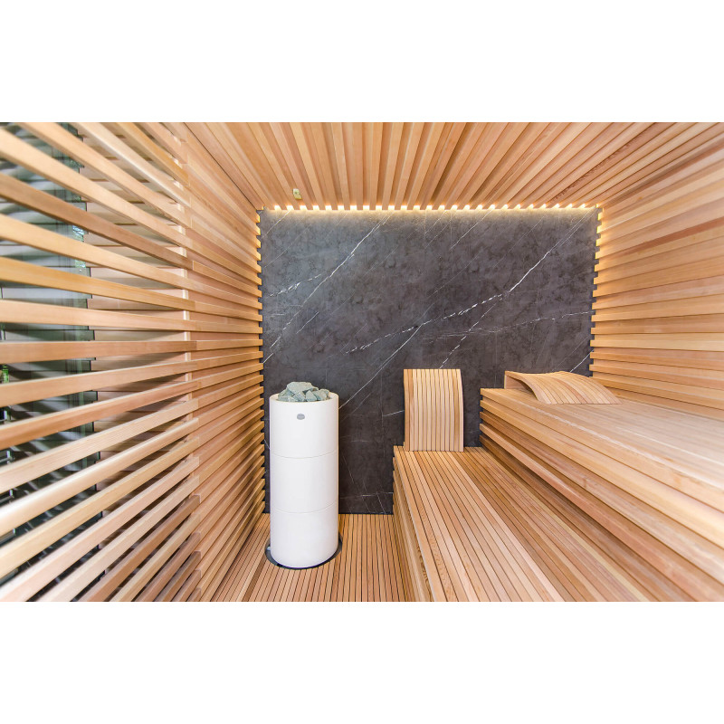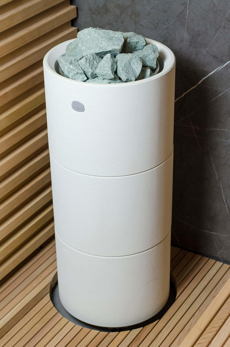 Источником тепла служит каменка Tulikivi Kuura White, заполненная камнями жадеита. Когда камни жадеита нагреваются, его лечебные свойства усиливаются. Обливание камней водой в сауне распространяет приятный запах чистой окружающей среды, позволяя легко дышать. В каменку введена паровая трубка от парогенератора паровой сауны, что позволяет добиться гораздо более высокой влажности в помещении сауны. Это отличный выбор, если у вас нет условий для установки парилки и сауны. Одна из распространенных систем управления - это большой стационарный светодиодный монитор. Все оборудование также управляется смарт-устройством из любой точки мира.
